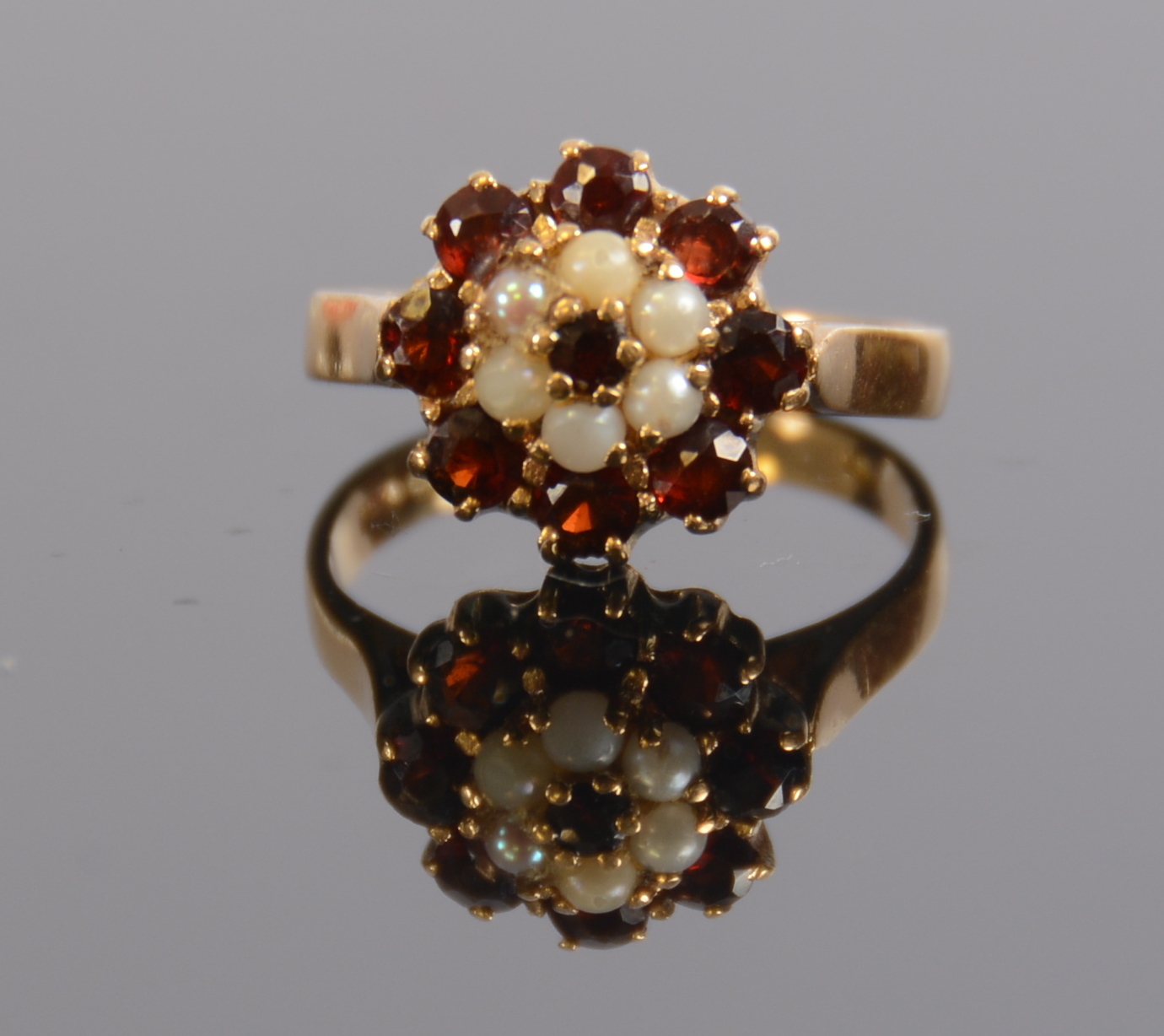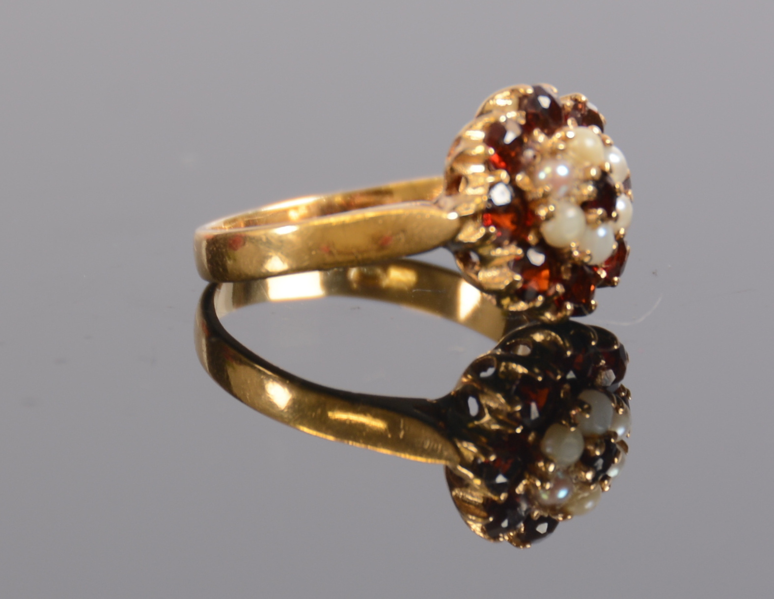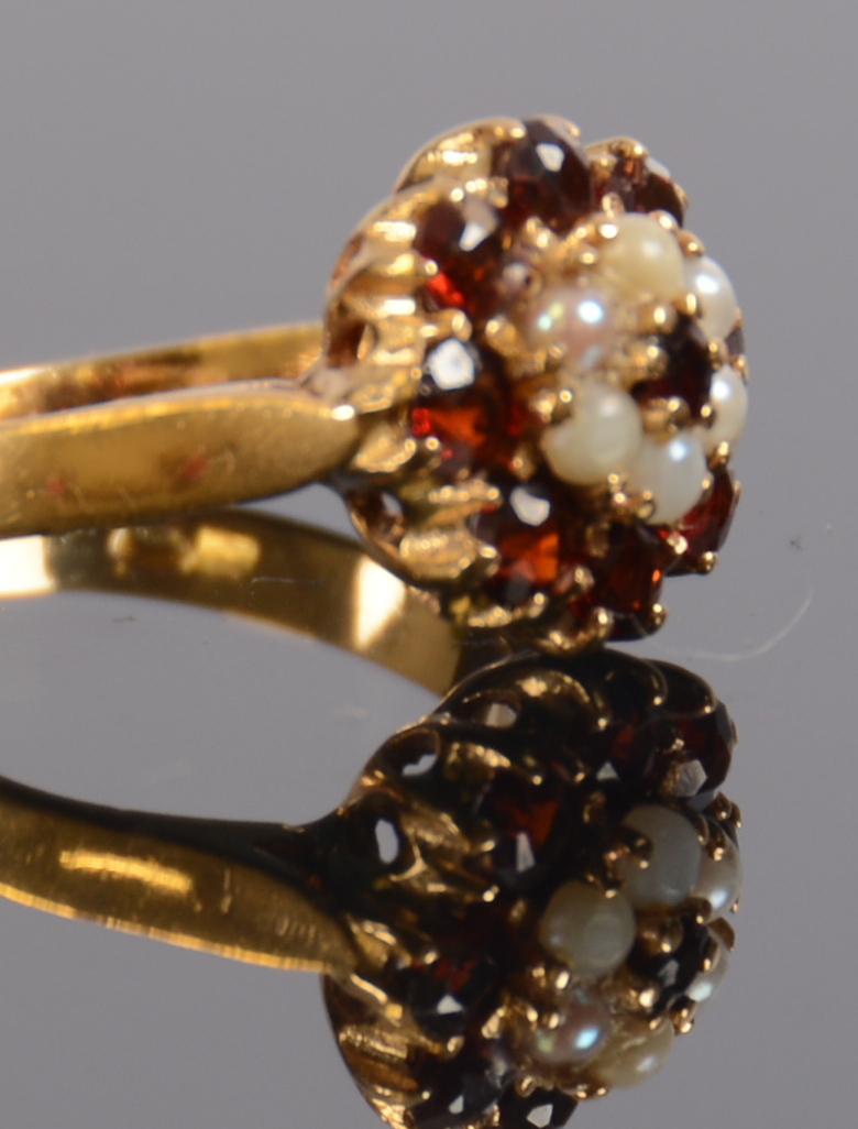 350941. RING MED GRANETER OG PERLER, 18K.