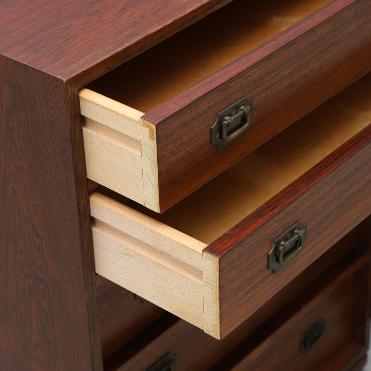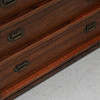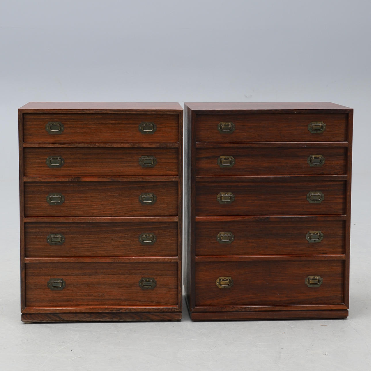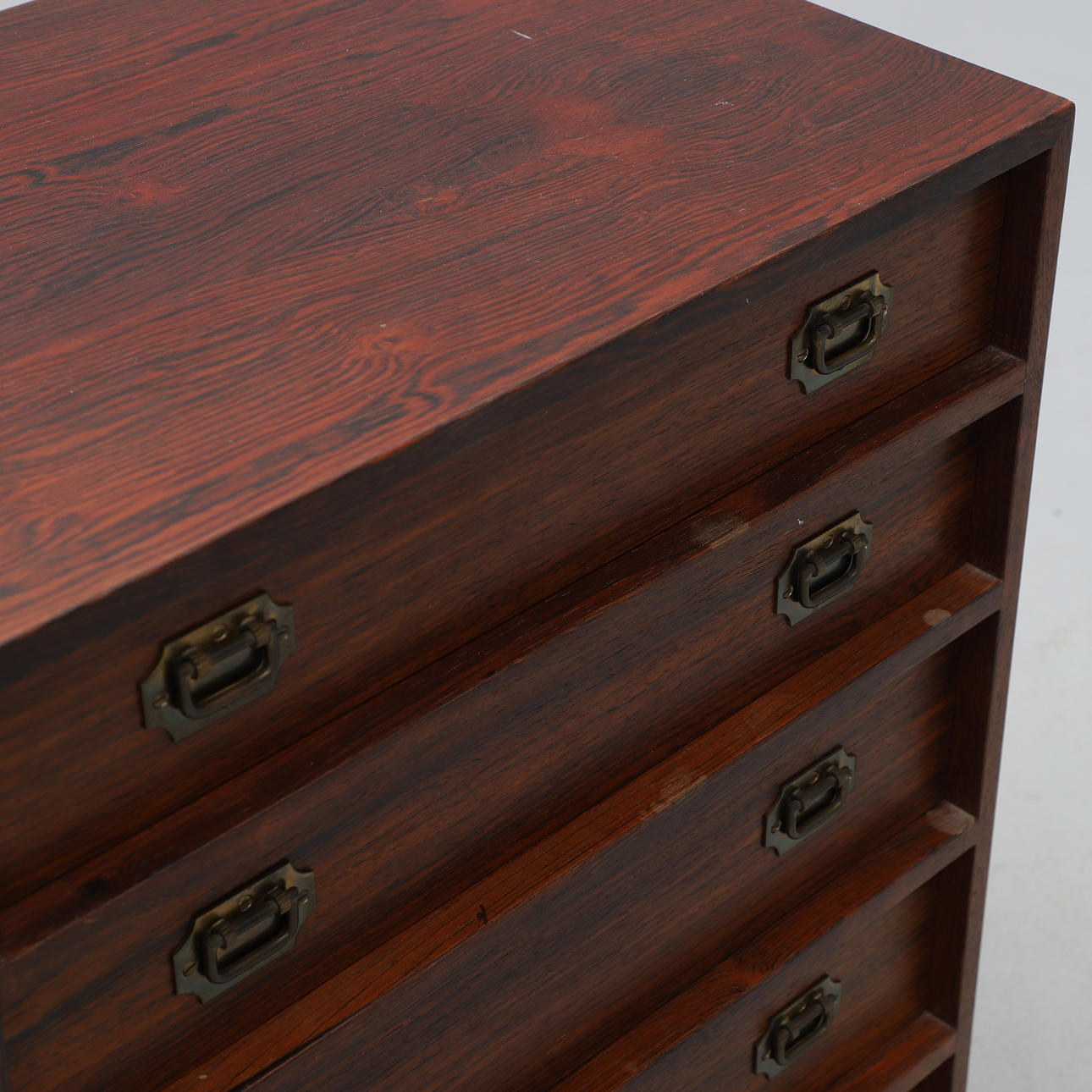 Palisander. Lige form, hver fem kasser med messingbeslag. Bredde 45, dybde 30, højde 60 cm.