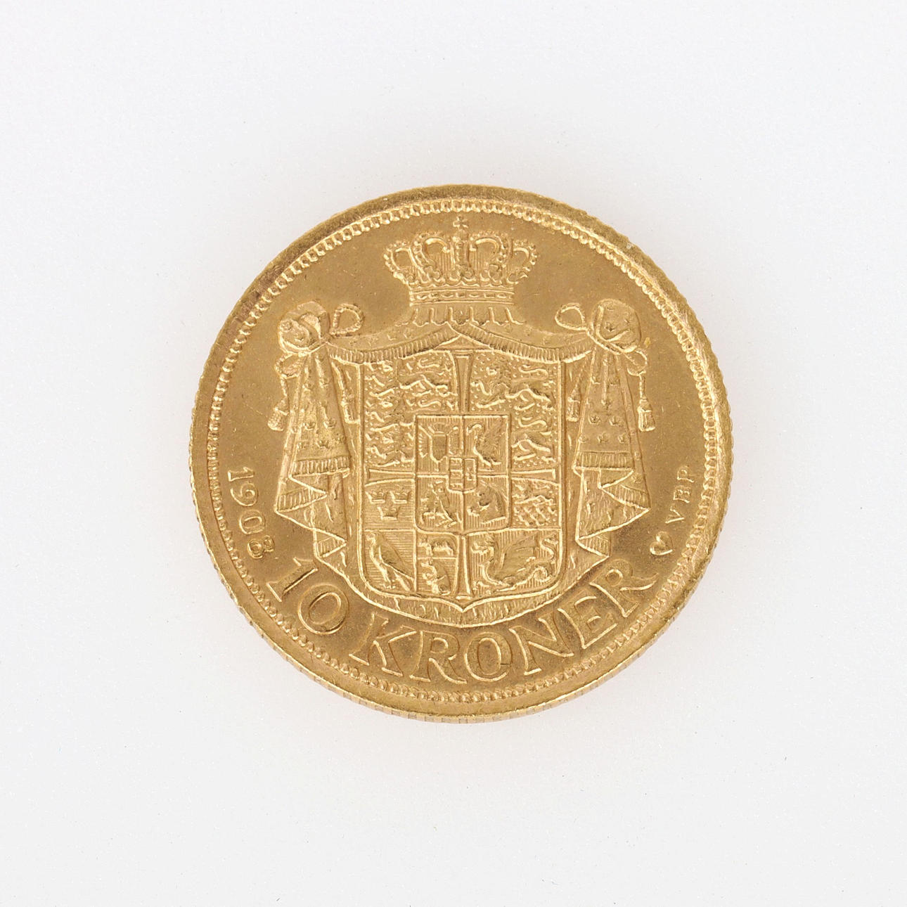 Guldmønt 10 Kroner, 21,6K, Kong Frederik VIII af Danmark 1908.