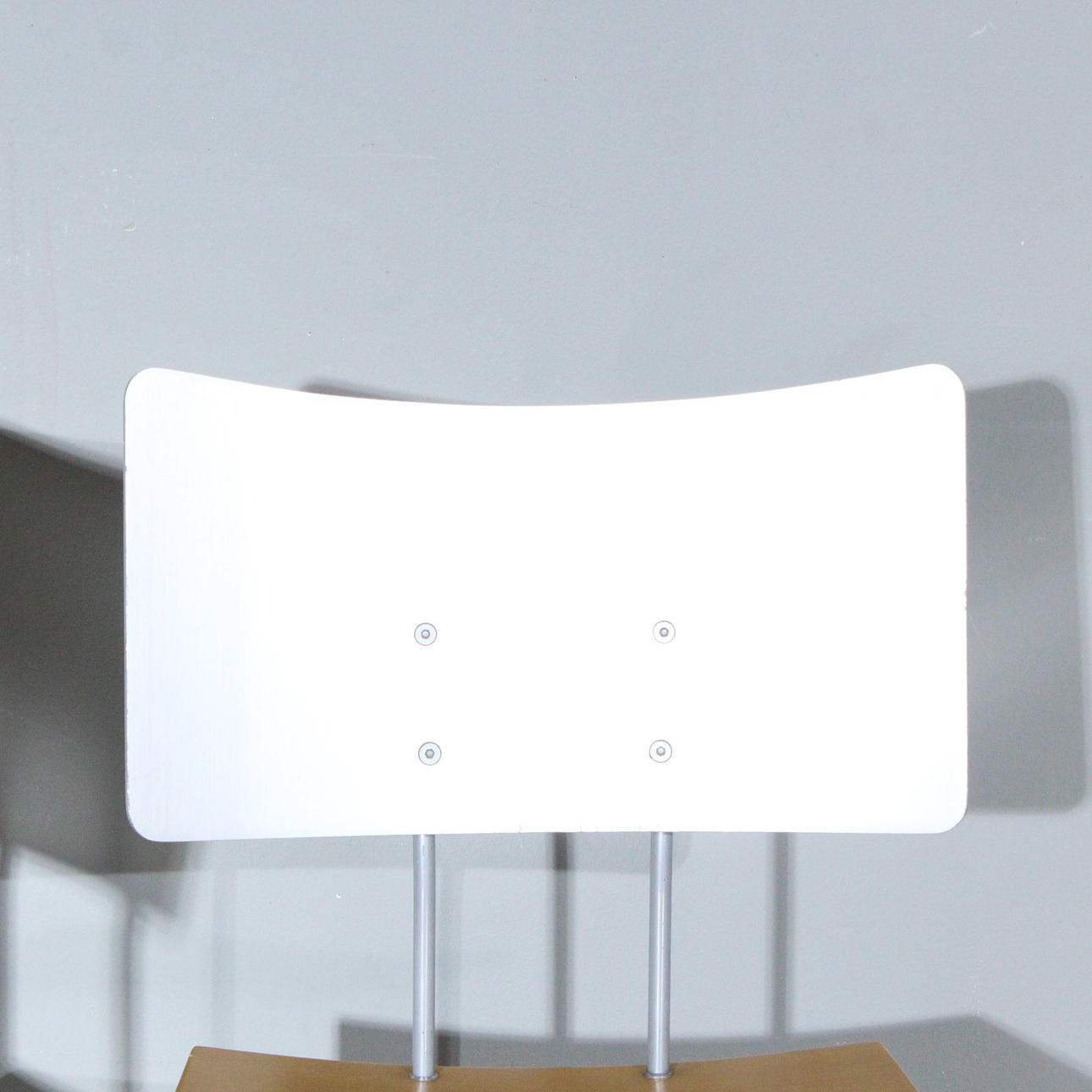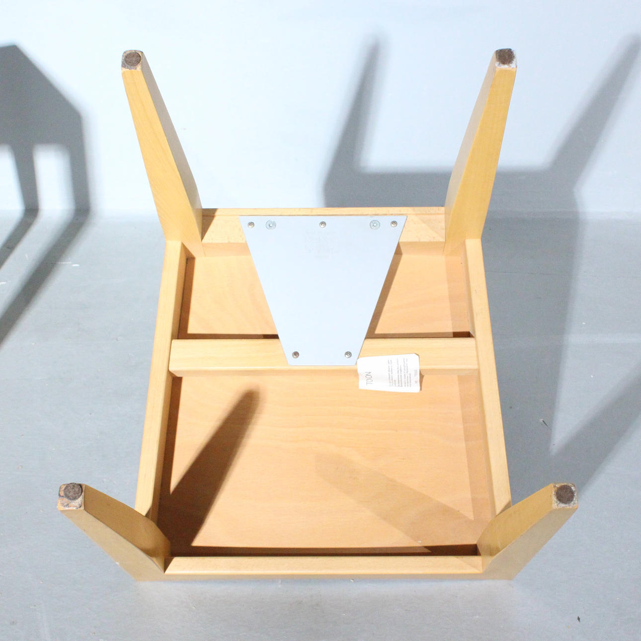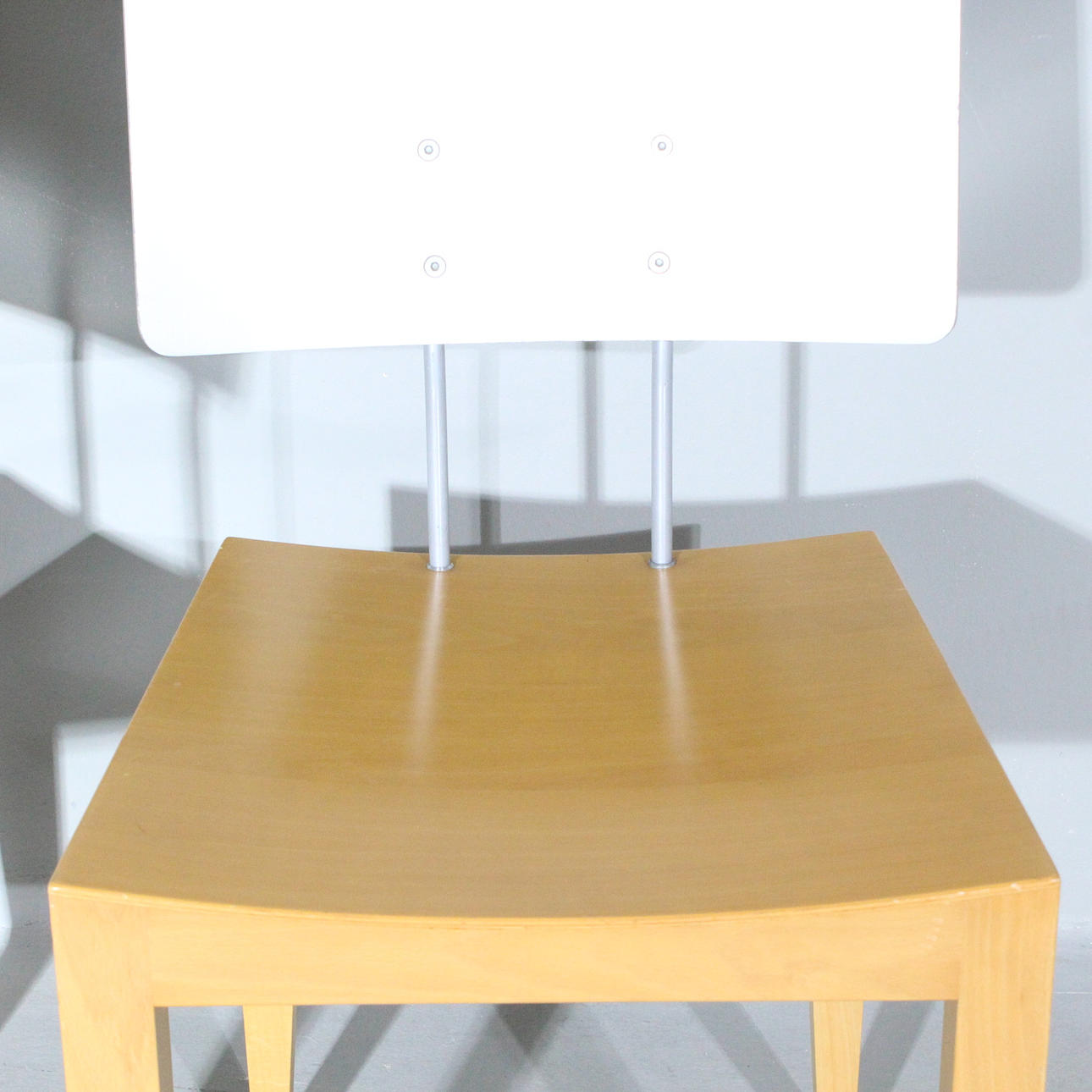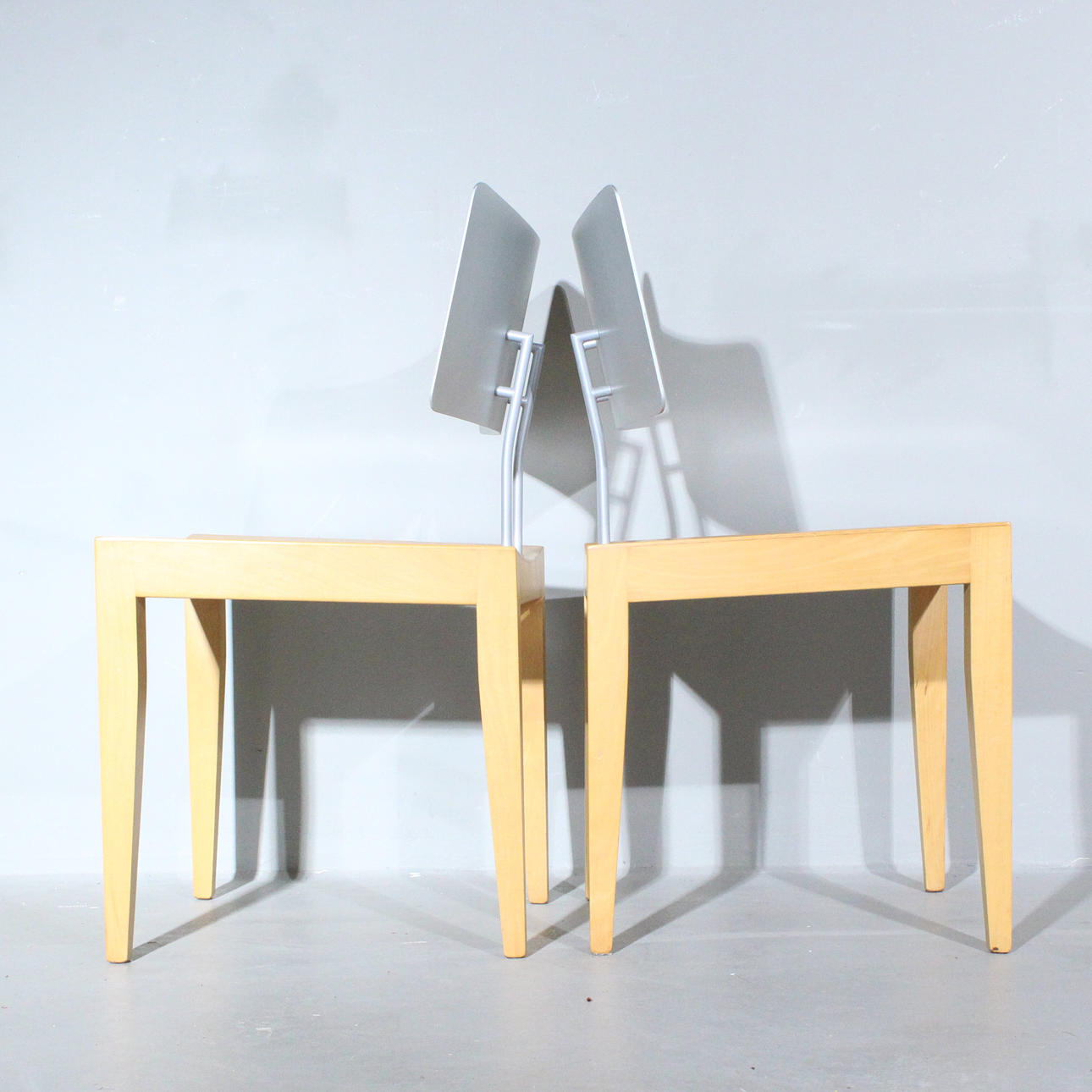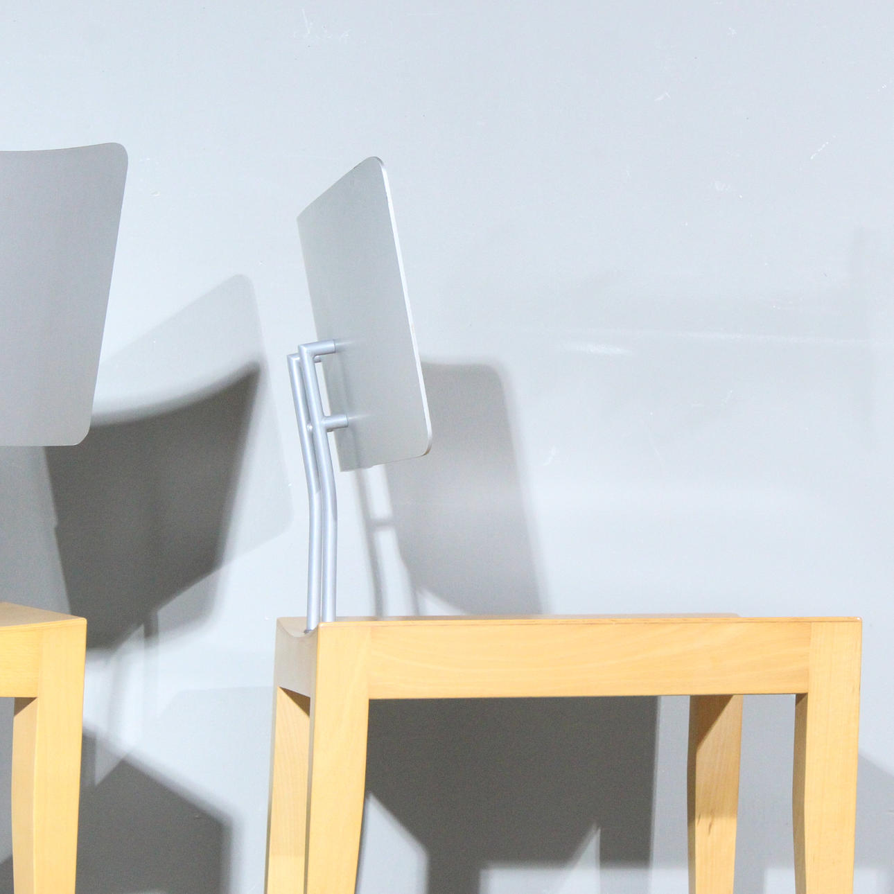Pel Chaly til Tonon, Italien, to stole/spisestuestole, glaseret træ og metalkonstruktion, Dimensioner på hver ca.: h. 79 cm, b 45 cm, dybde 45 cm.