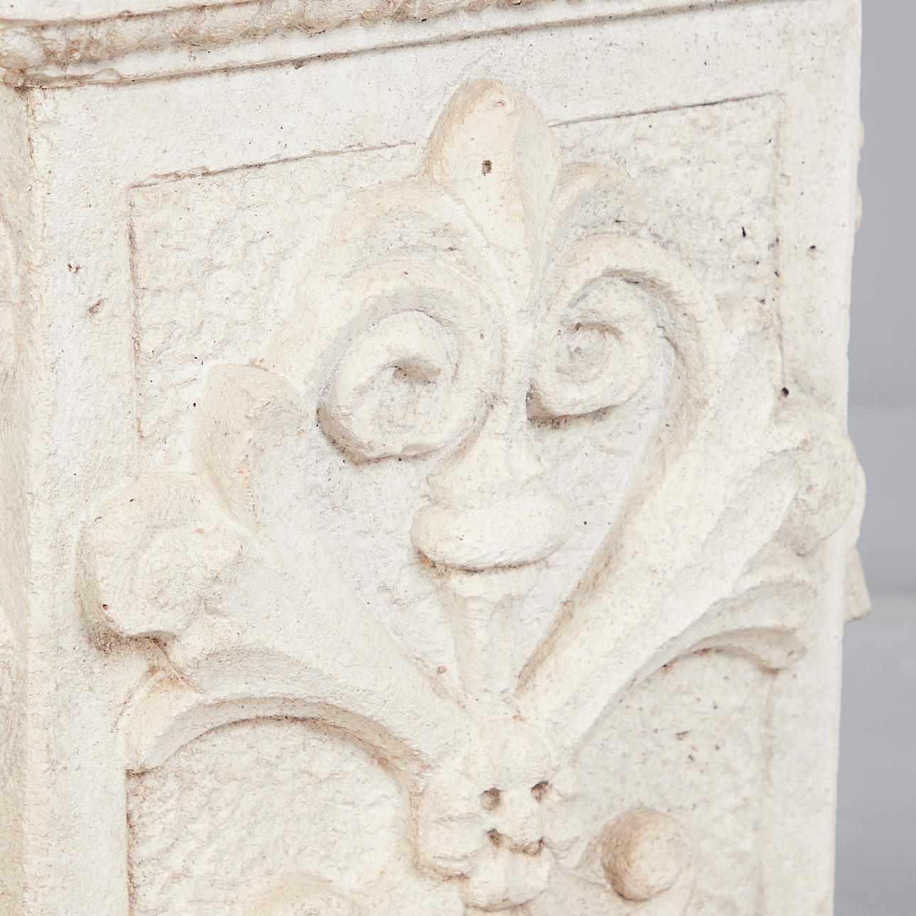 Havefigur/skulptur, kvindebuste med bund, sandsten, todelt figur bestående af med en rektangulær base med bladornamentik, buste af en dame placeret løst, base: H. 39cm, L.26cm, B.26cm, buste: 56cm, L.42cm, B.23cm. (2).