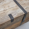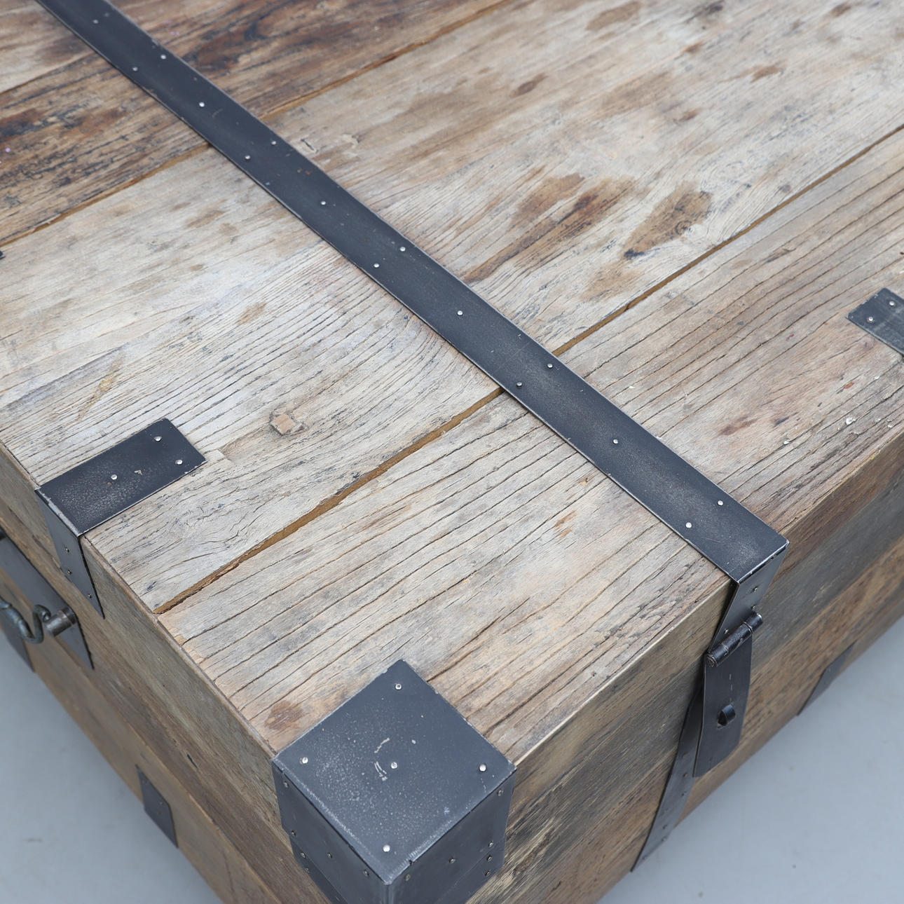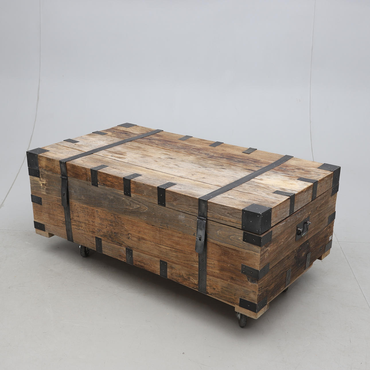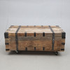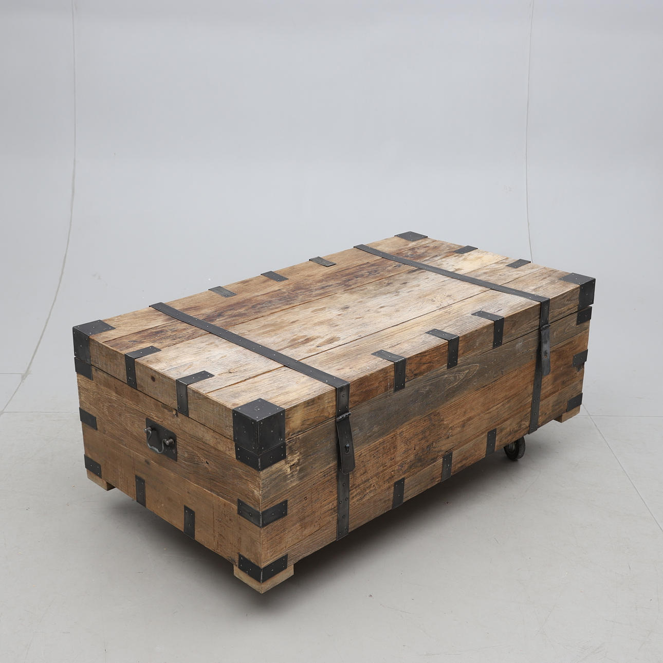 Træ med metalbeslag. Længde ca 133, bredde 73, højde 45 cm.