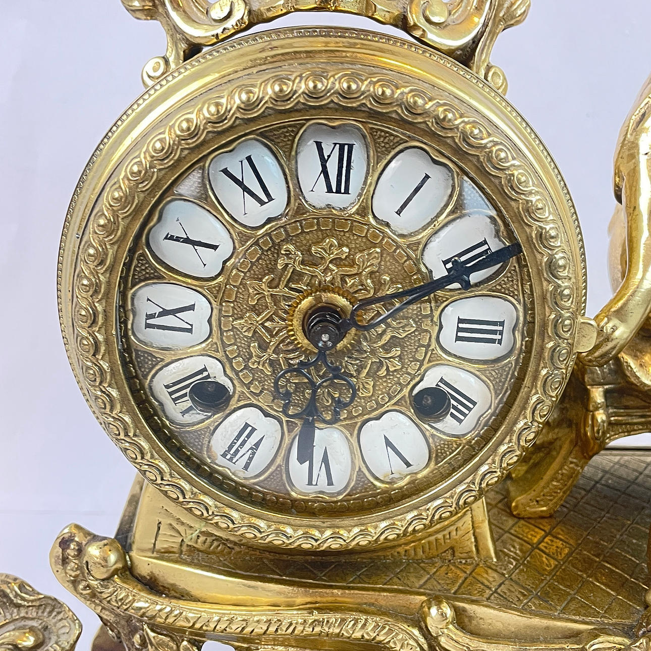 Bordvedhæng med emaljeindsatser og romertal. Indretning af kvinde med hund og blomster.