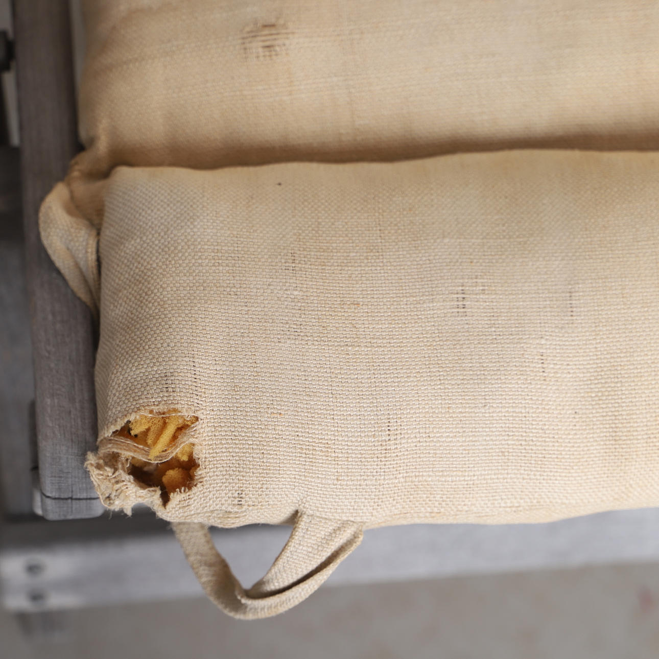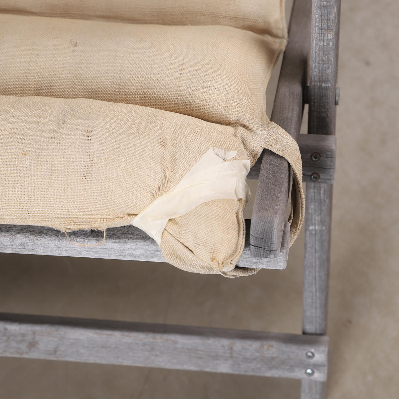 Overfladeslitage efter udendørs brug, mindre revner og slid.