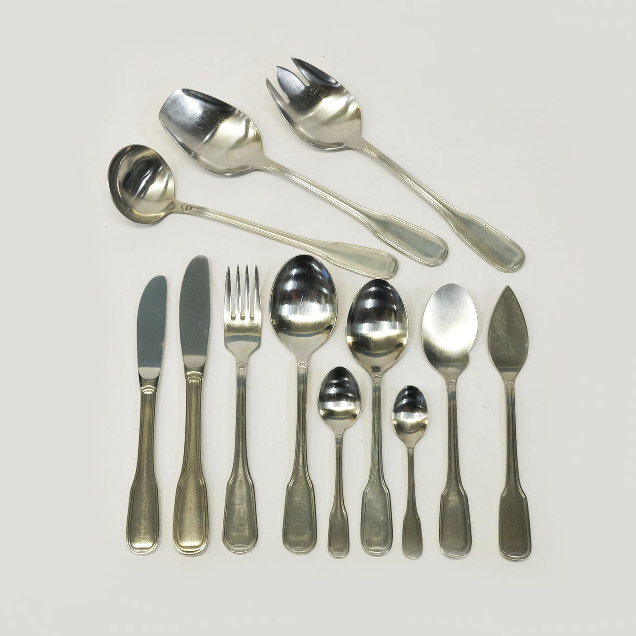 24 knive, længde 20,5cm, 22 gafler, længde 19,5cm, 14 skeer, længde 19,5cm, to par salatbestik, 20 tsk mm.