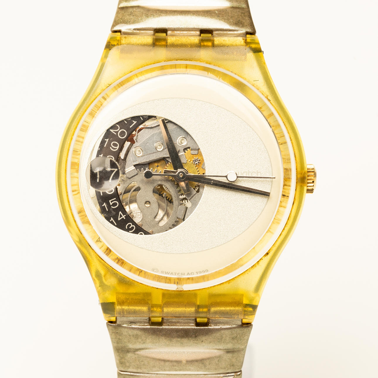 Armbåndsur, Swatch, AG 1999, automatisk, kassestørrelse ekskl. krone ca. 33 mm, elastisk metalarmbånd.