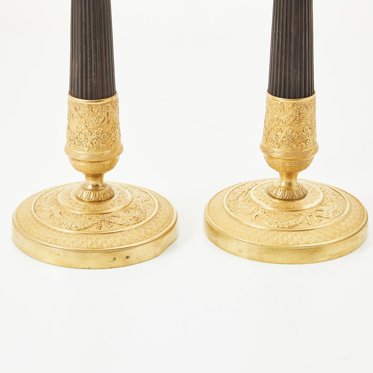 Poleret og mat forgyldt bronze, fodplade dekoreret med blomster og festoner, velkronet sort stilk, højde ca. 30 cm.