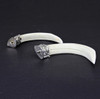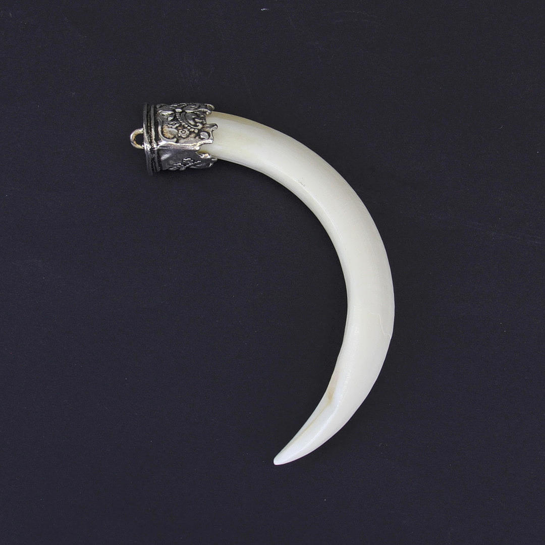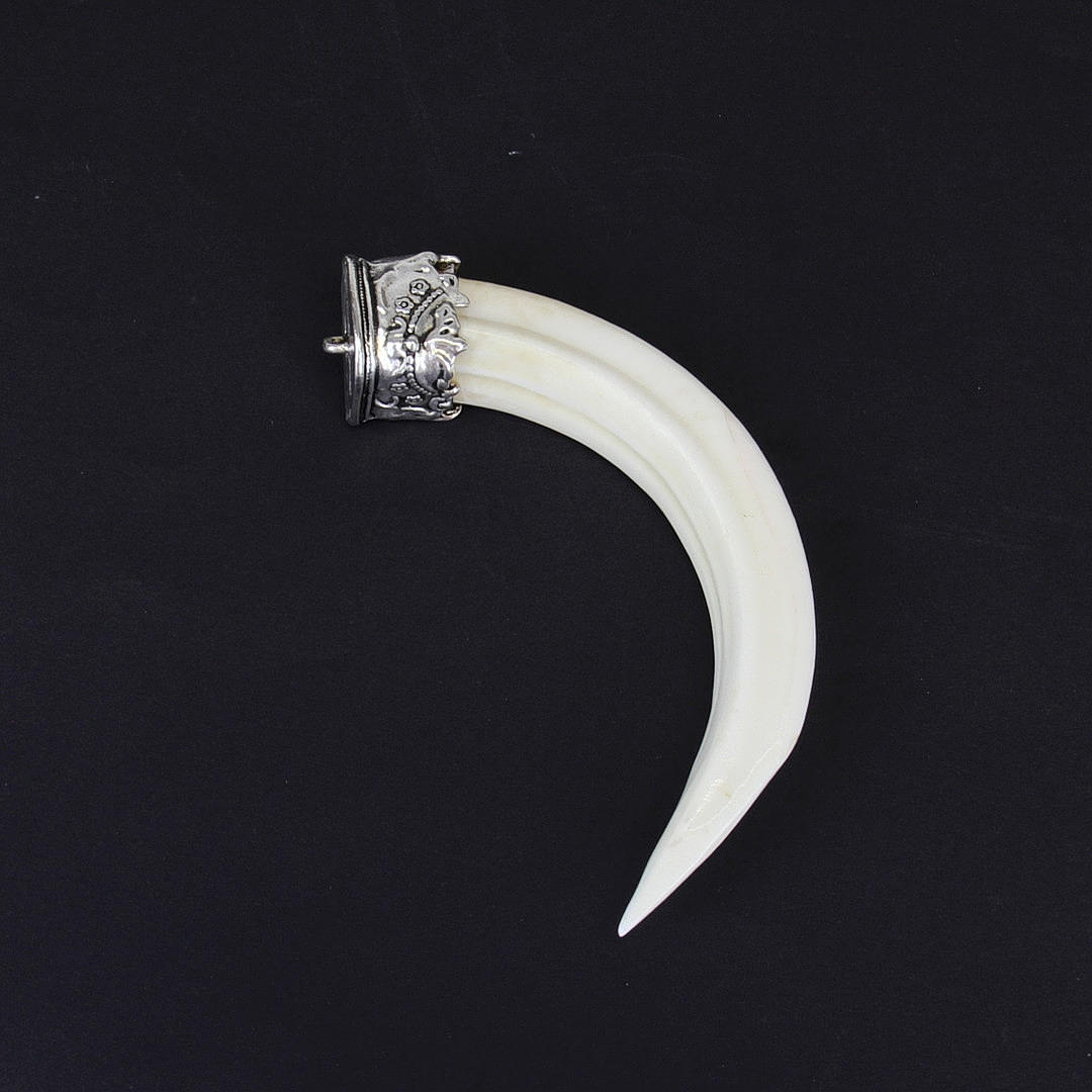 To tibetanske hvidmetalmonterede vildsvin stødtænder, W. 13cm.