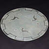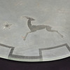 Rå glasplade med ætset indretning af hjorte og stjerner, facetteret kant.