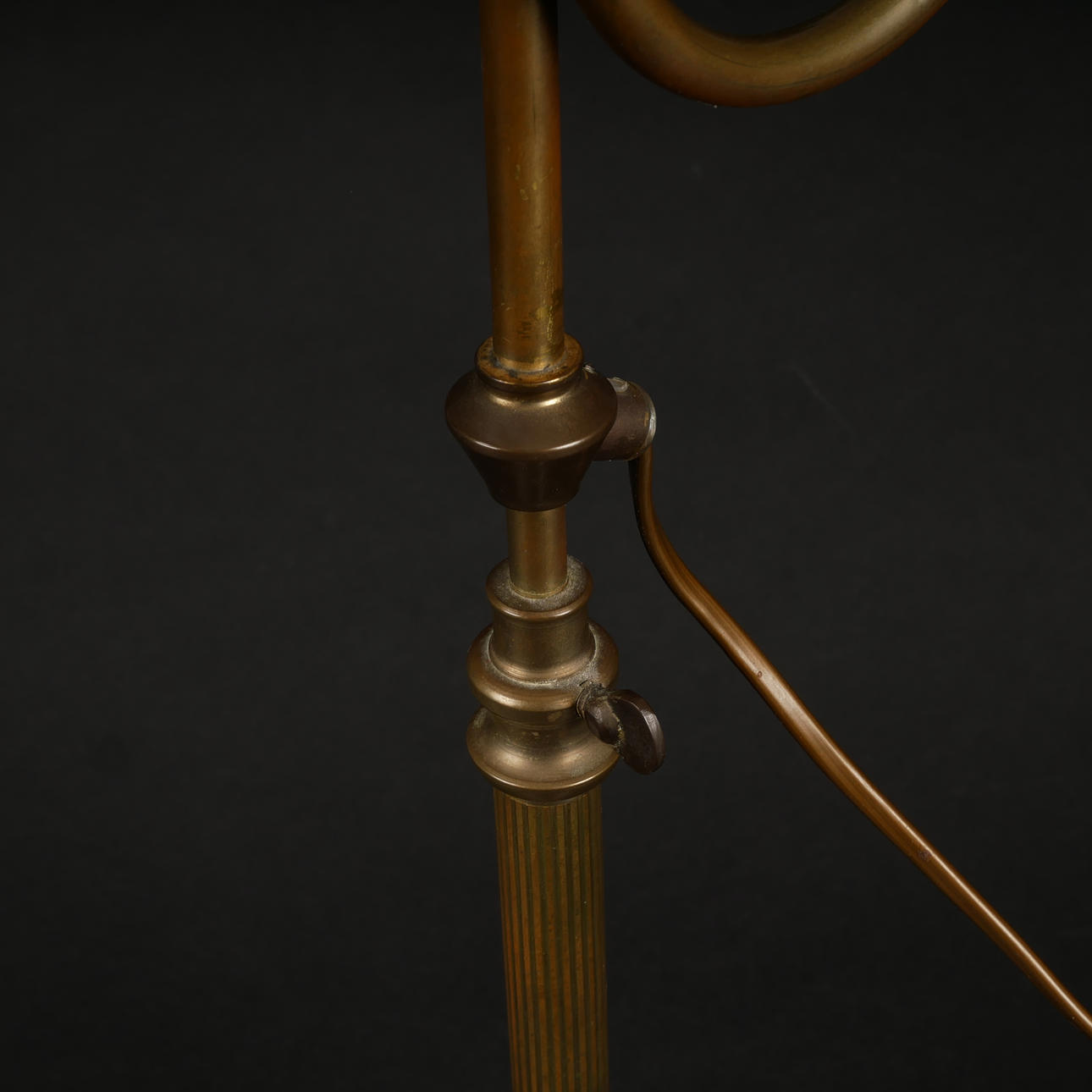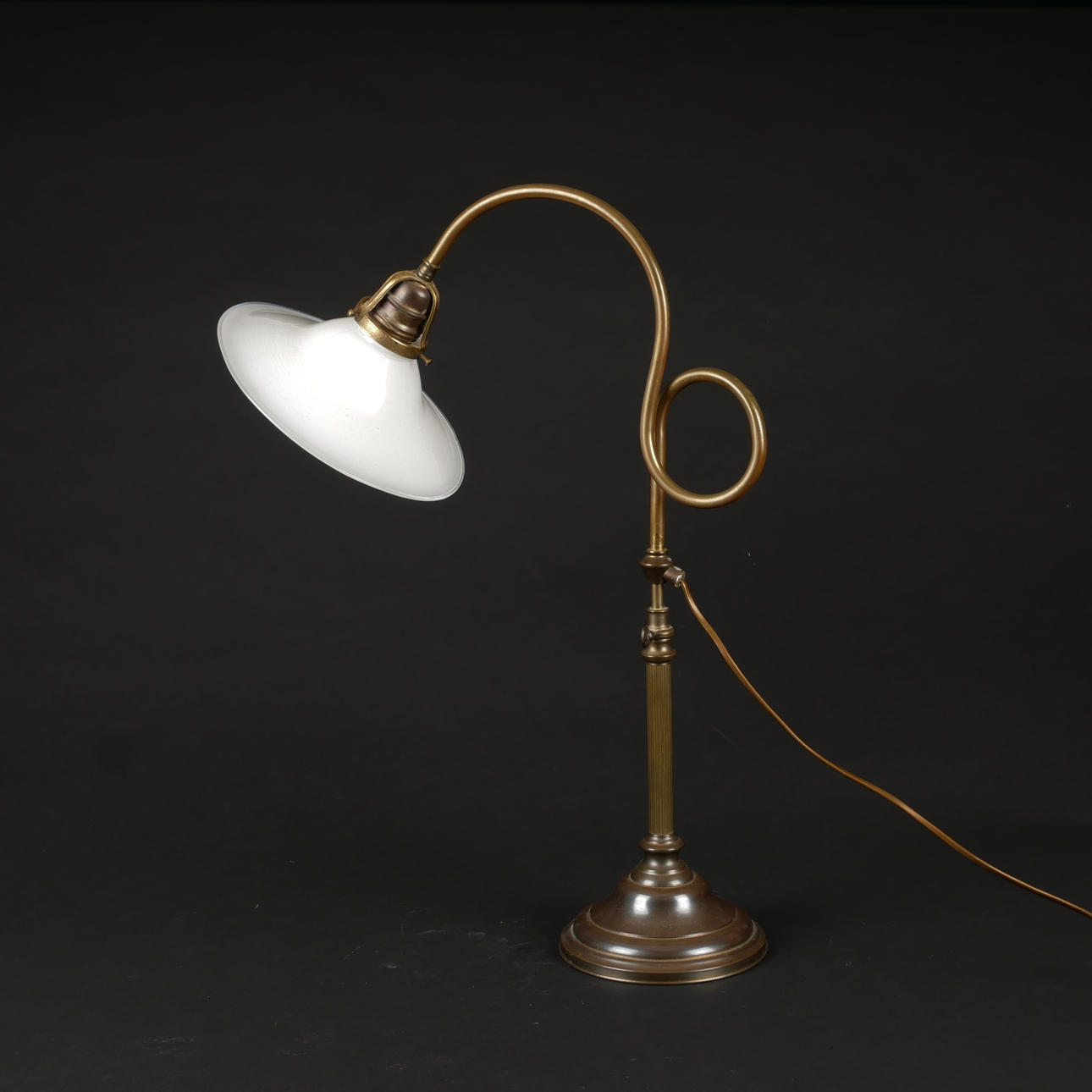 Messing og patineret metal med skomagerskærm. Løftbar og justerbar og drejelig.
