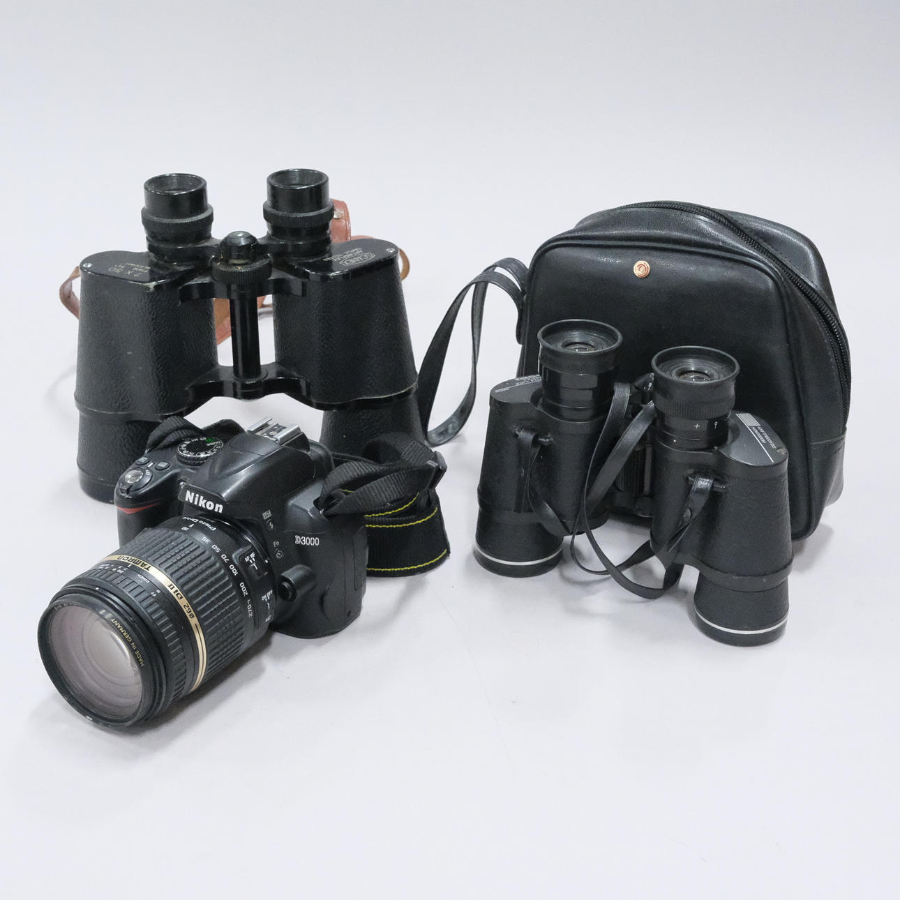 Nikon D3000 kamera med Tamron-objektiv, 18-270mm, F/3.5-6.3. Velbon, Sherpa 603R kamerastativ. Tasco 7x35mm, Zip Focus, 4000 kikkert, inkluderet taske. Scanex kikkert, 7x50mm.
