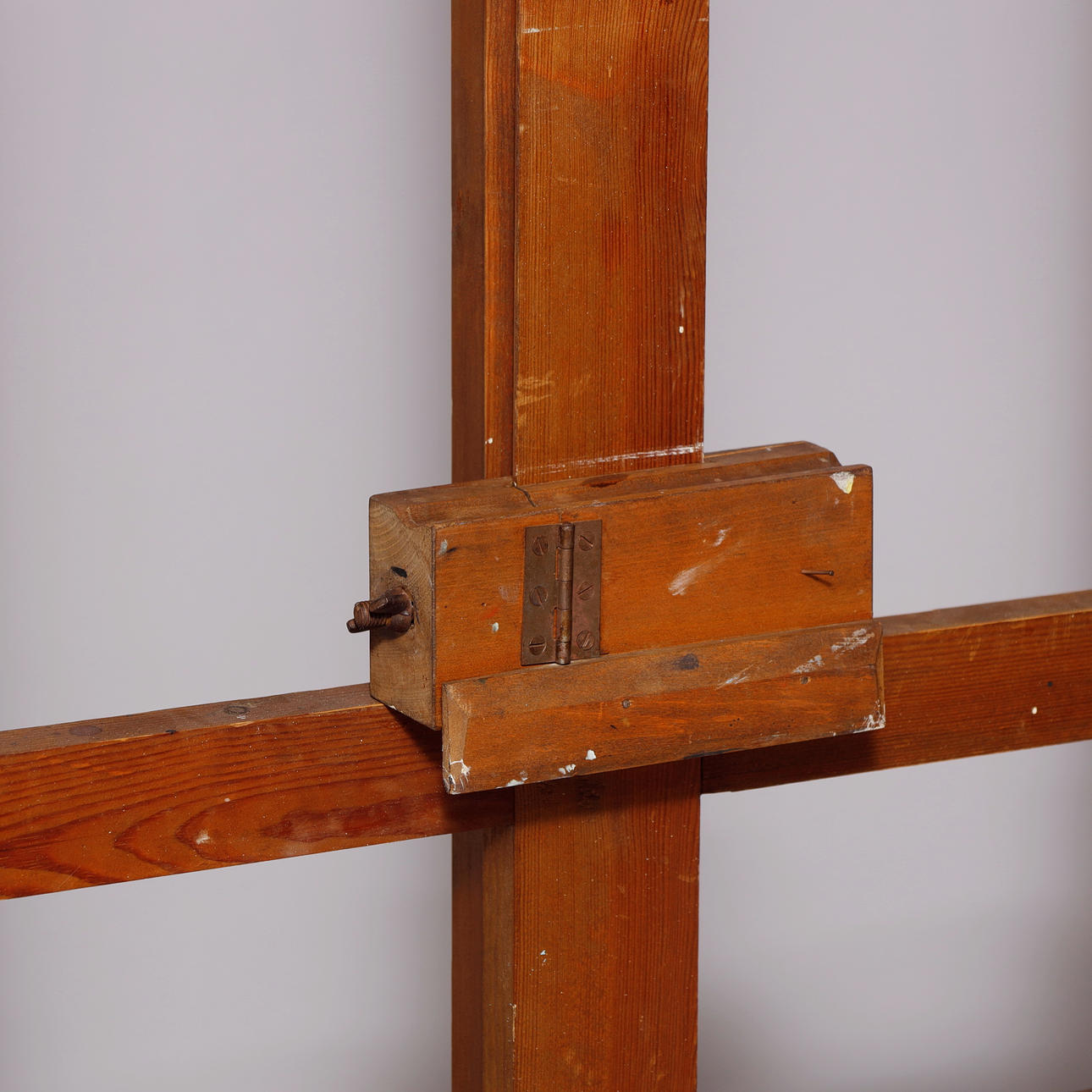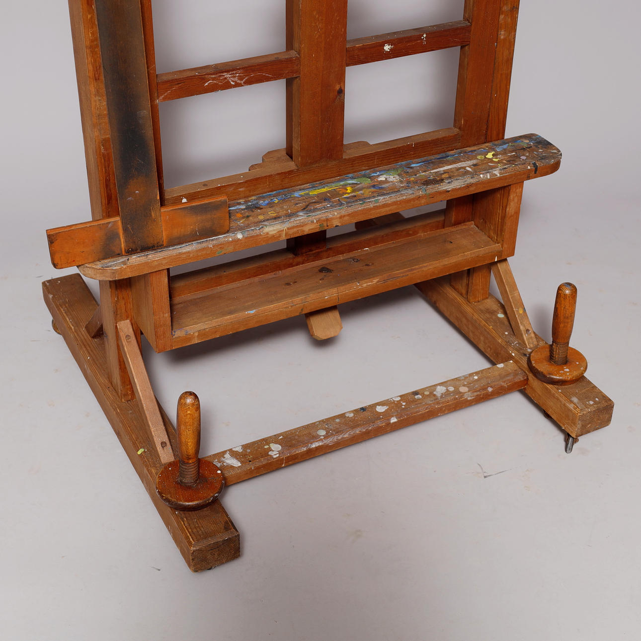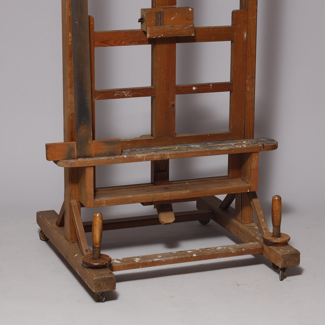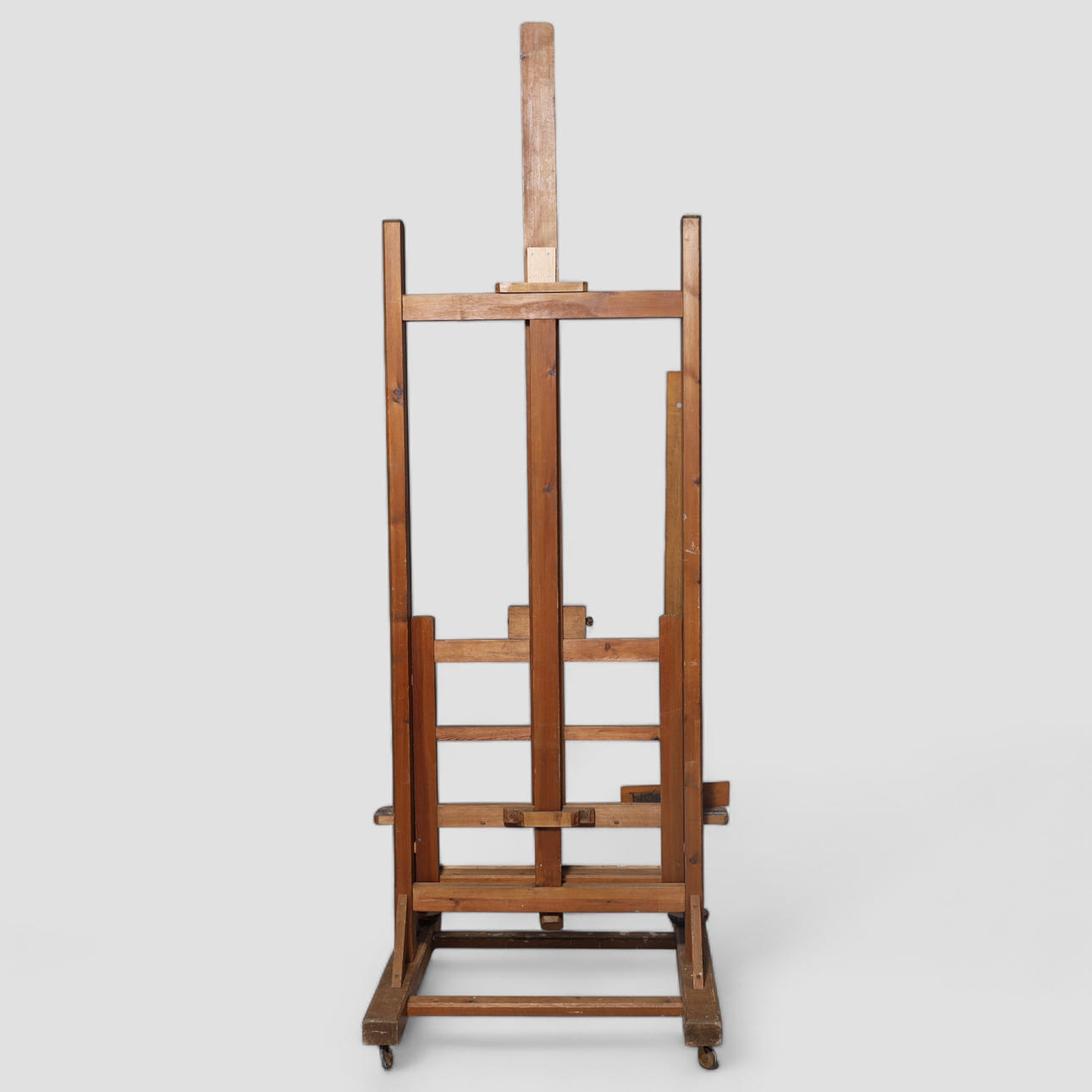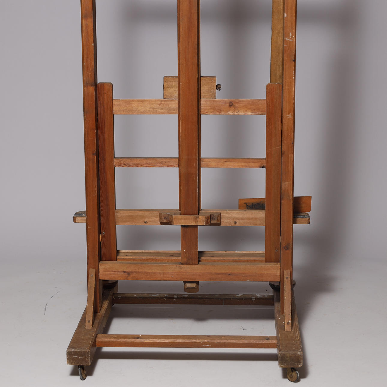 Staffeli af fyrretræ, højdejusterbar og stående på stel monteret på hjul, H.ca 230cm ( laveste indstilling), B.78 cm, D.80 cm.