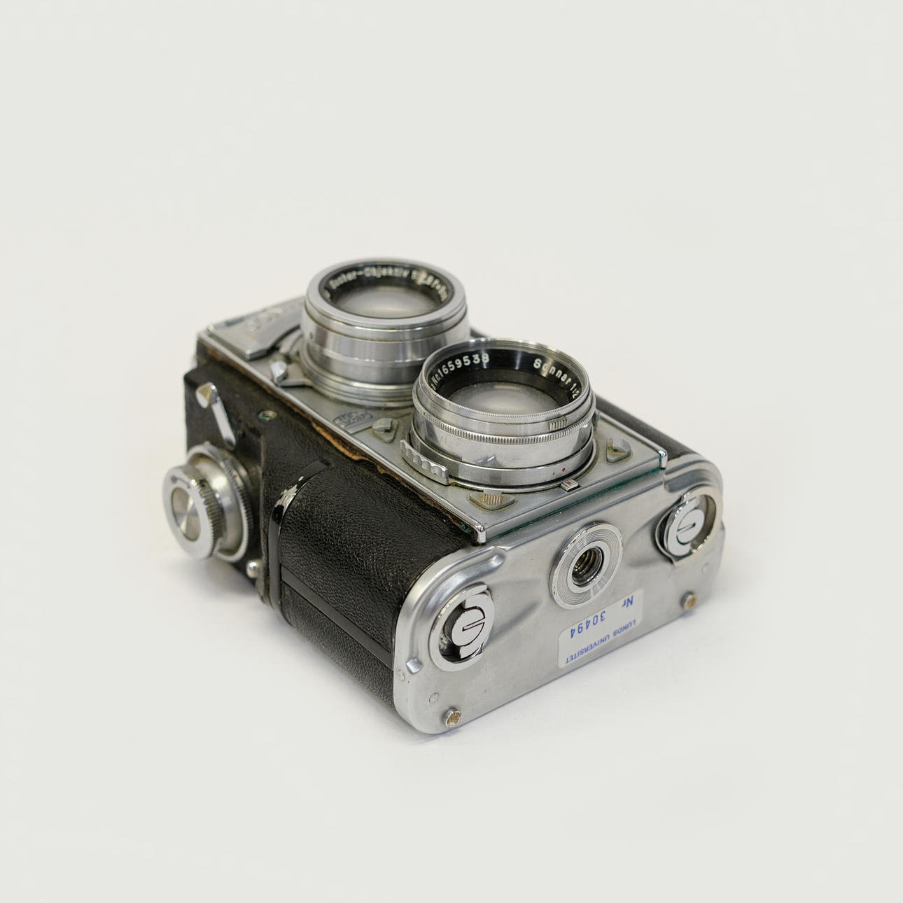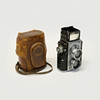 Med linser Sonnar fra Carl Zeiss, Jena. 1:2 f = 5cm, nr. 1659538. Kamera taske. Højde: ca. 14 cm.