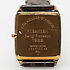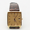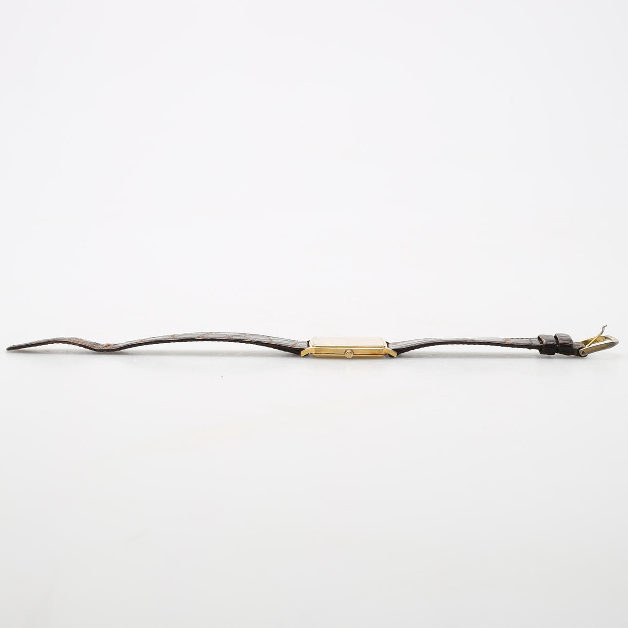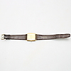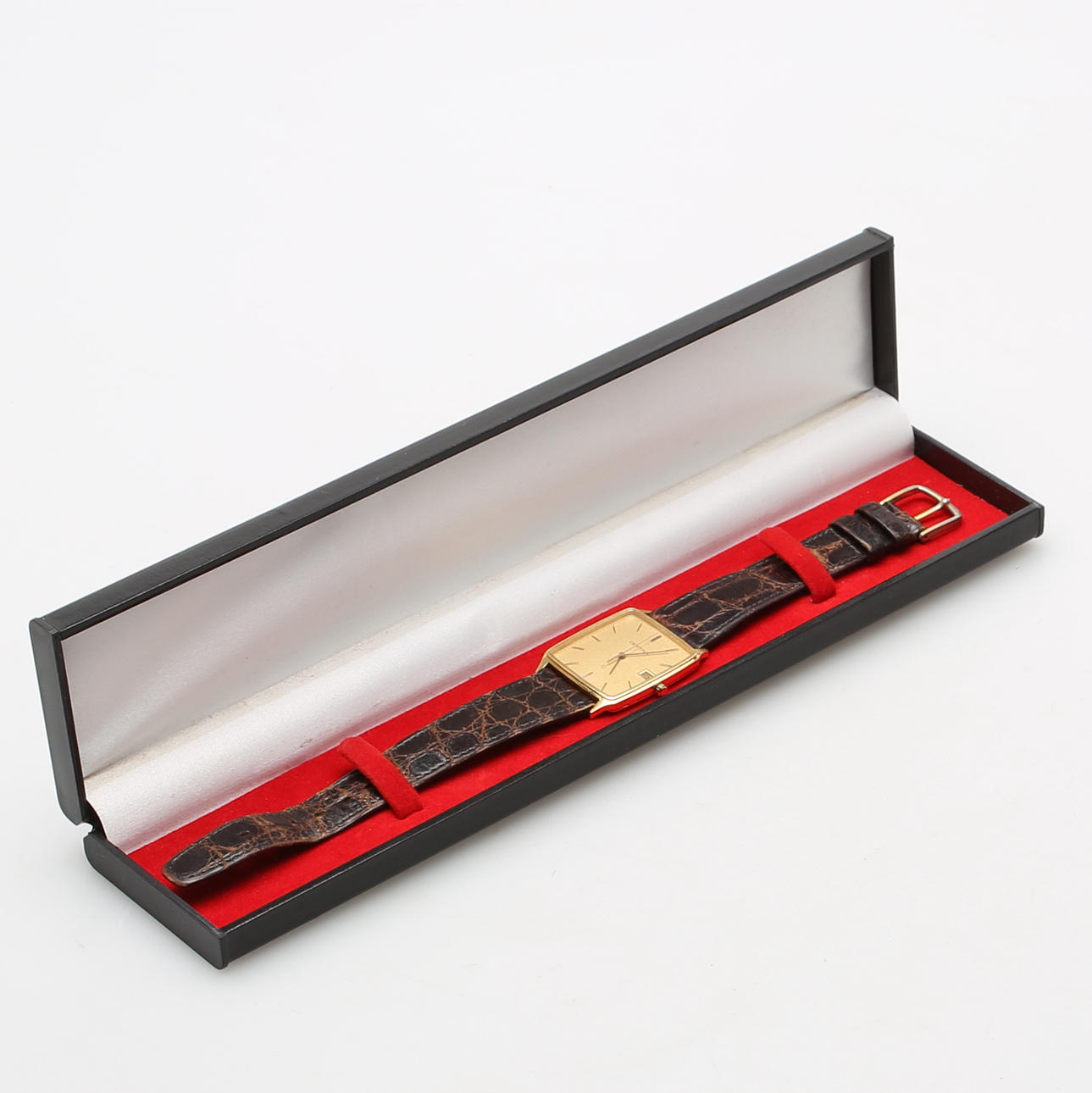 Herrearmbåndsur med quartz urværk, urkasse i 14 karat guld og med krokodillepræget brun rem, bagside med gravering Urkasse maksimal højde = 37 mm Urkasse maksimal bredde = 29 mm Urskivehøjde med ramme = 28 mm Urskivebredde med skrue = 29 mm.