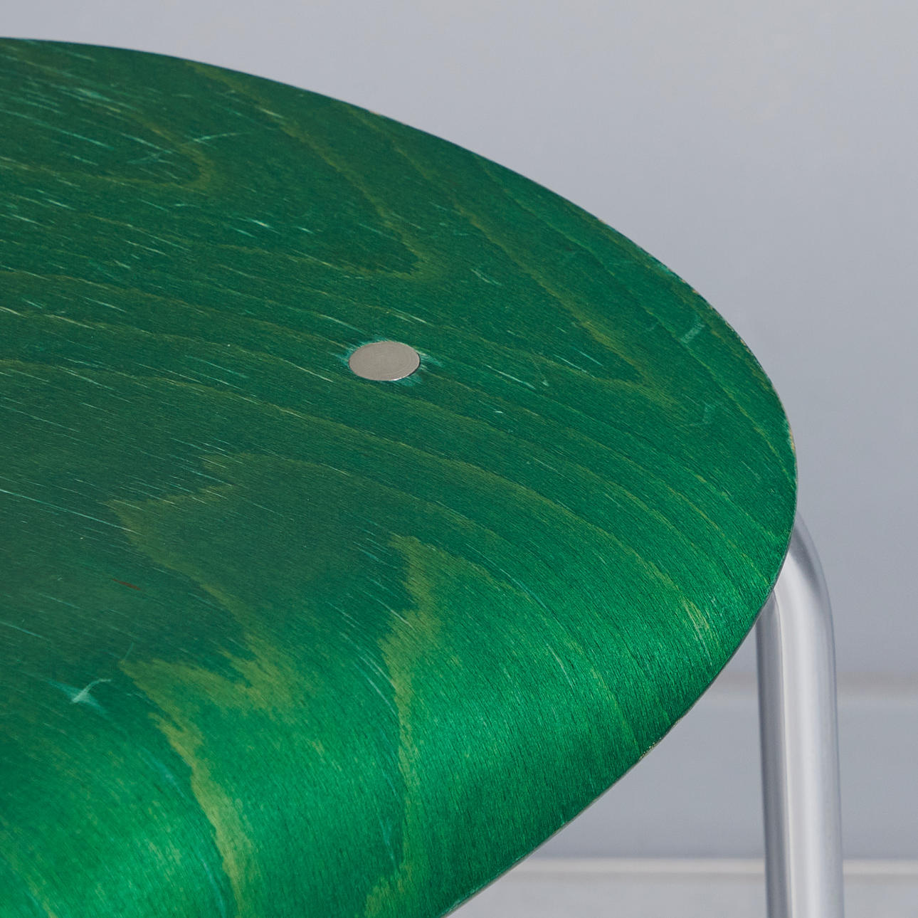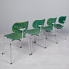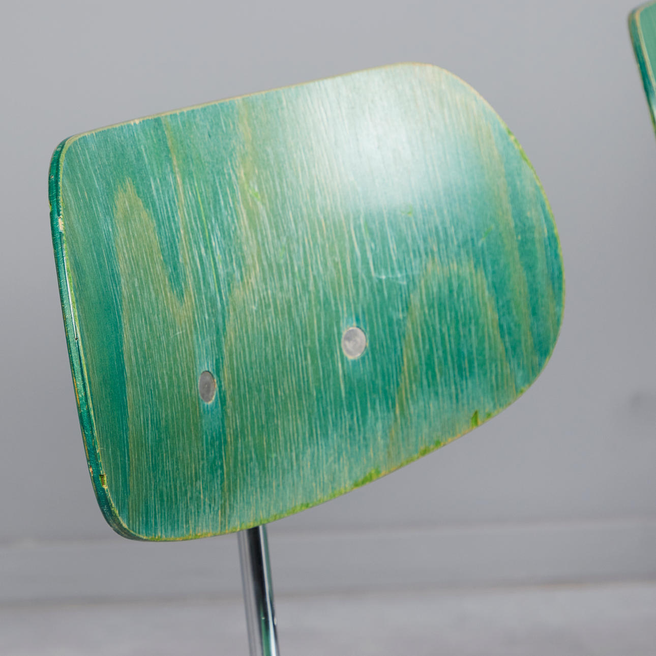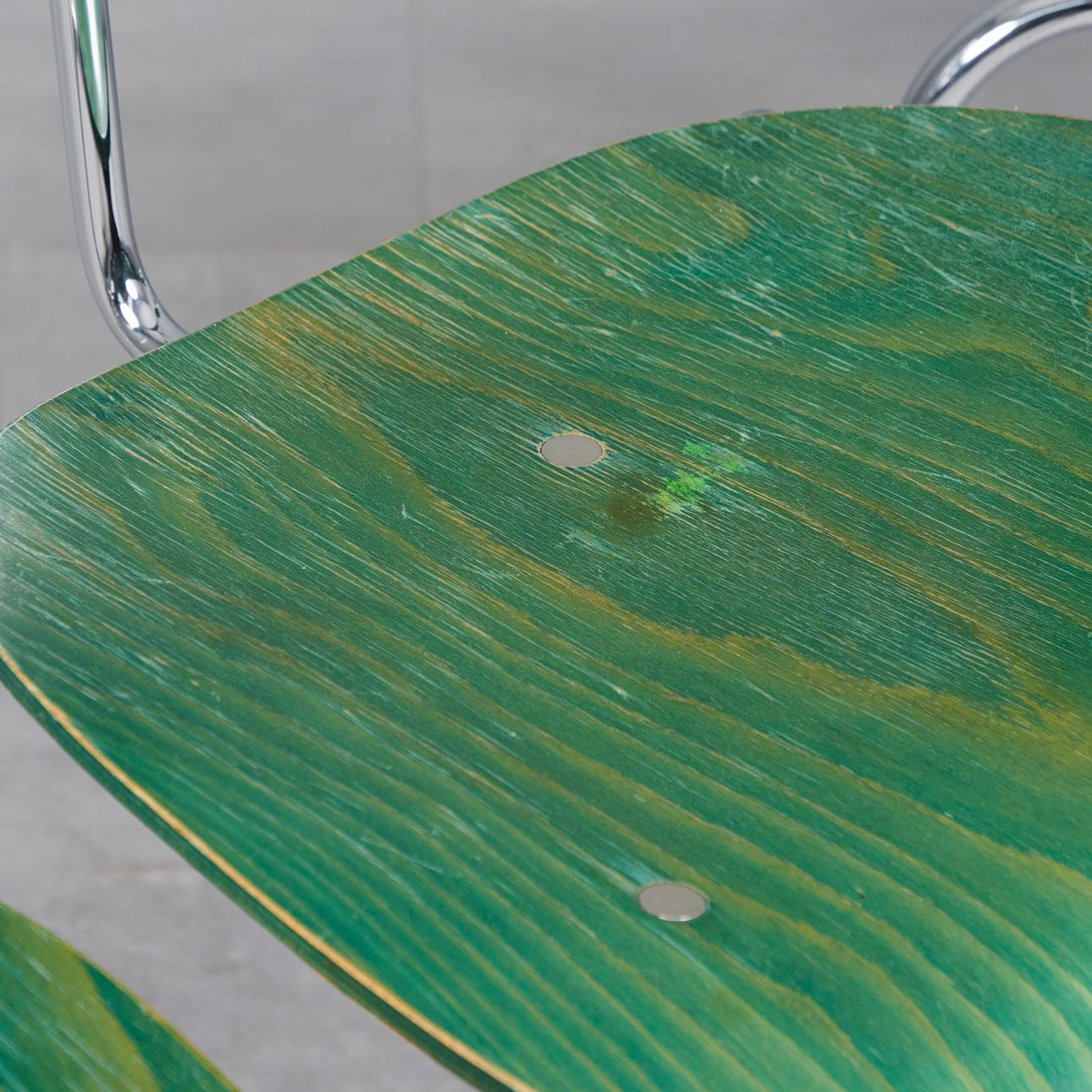 Sættet består af fire stole, hver med en forkromet stålrørbund og et sæde og ryglæn lavet af grønglaseret, lagdelt bøgetræsfiner, med producentens etiket på undersiden, hver: H.77cm, sædehøjde: 45cm, W.43,5cm, D.45cm. (2).