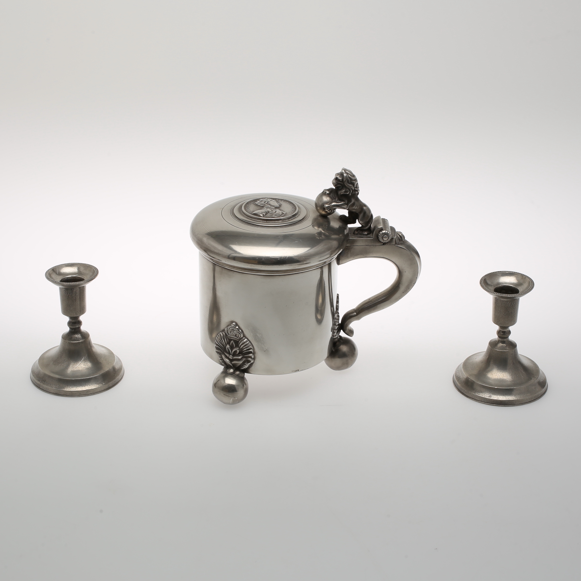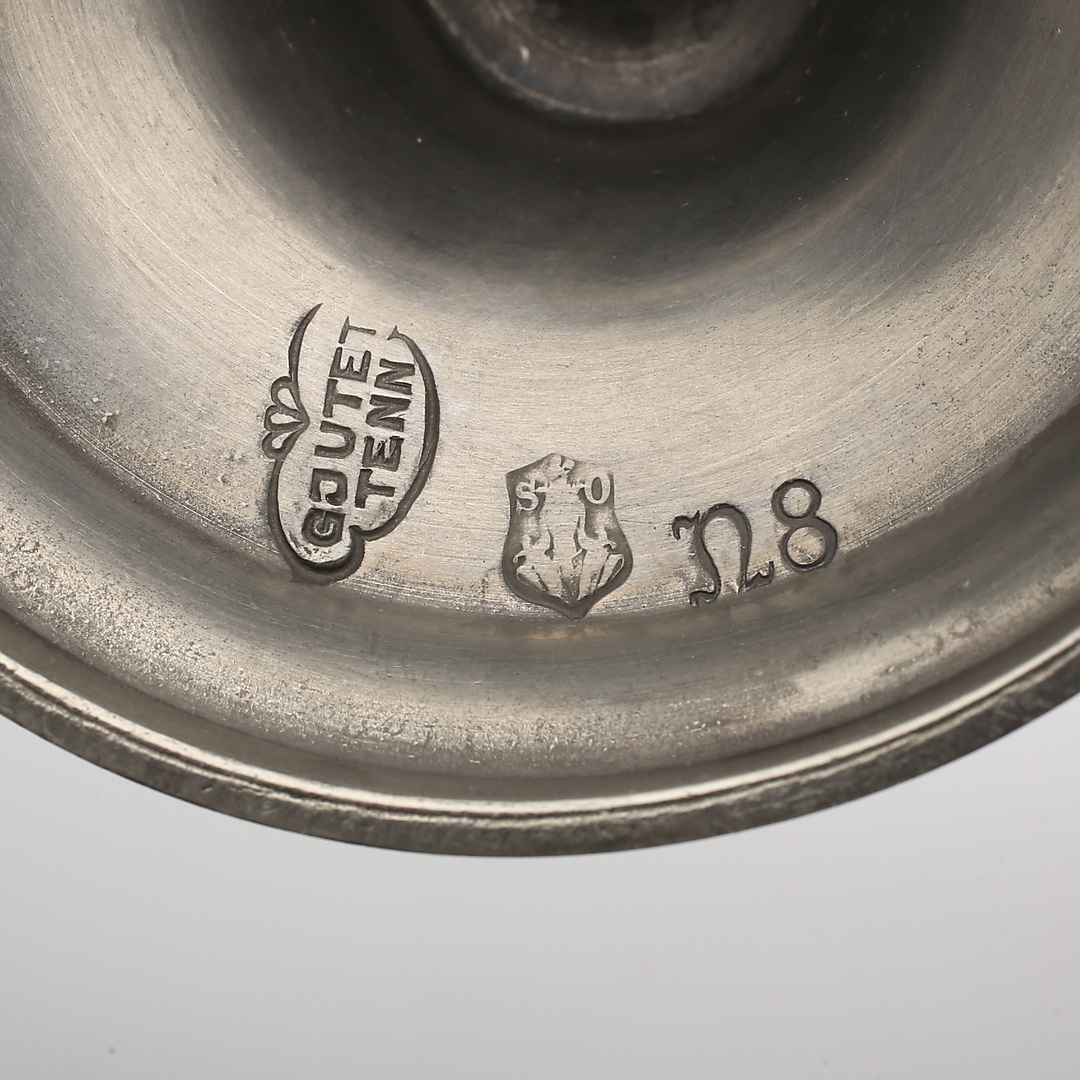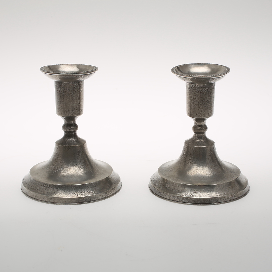 359402. Lysestager i tin, et par. TENNSTOP.