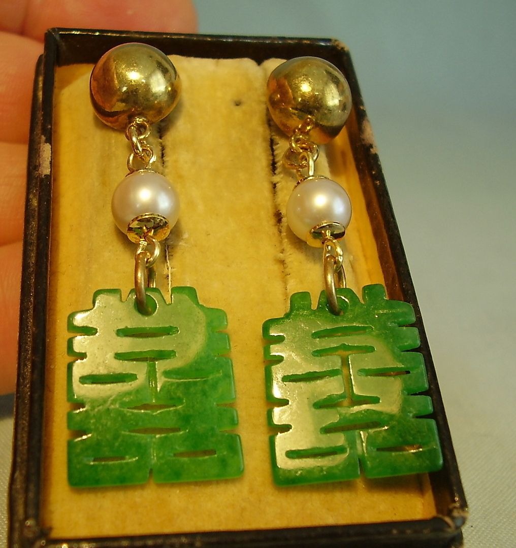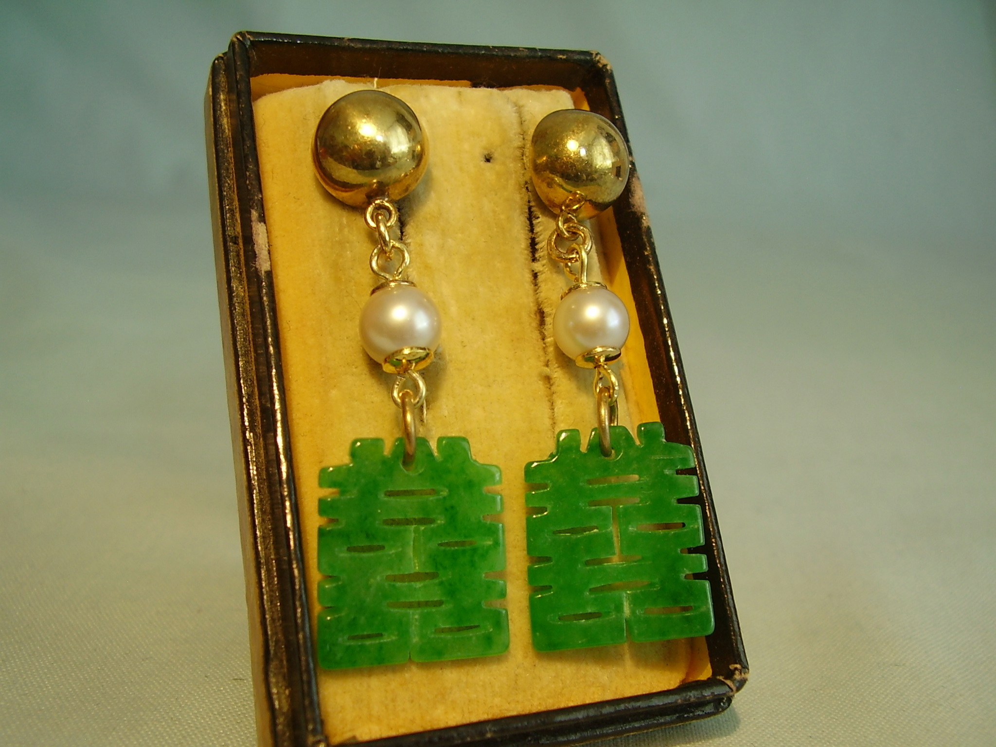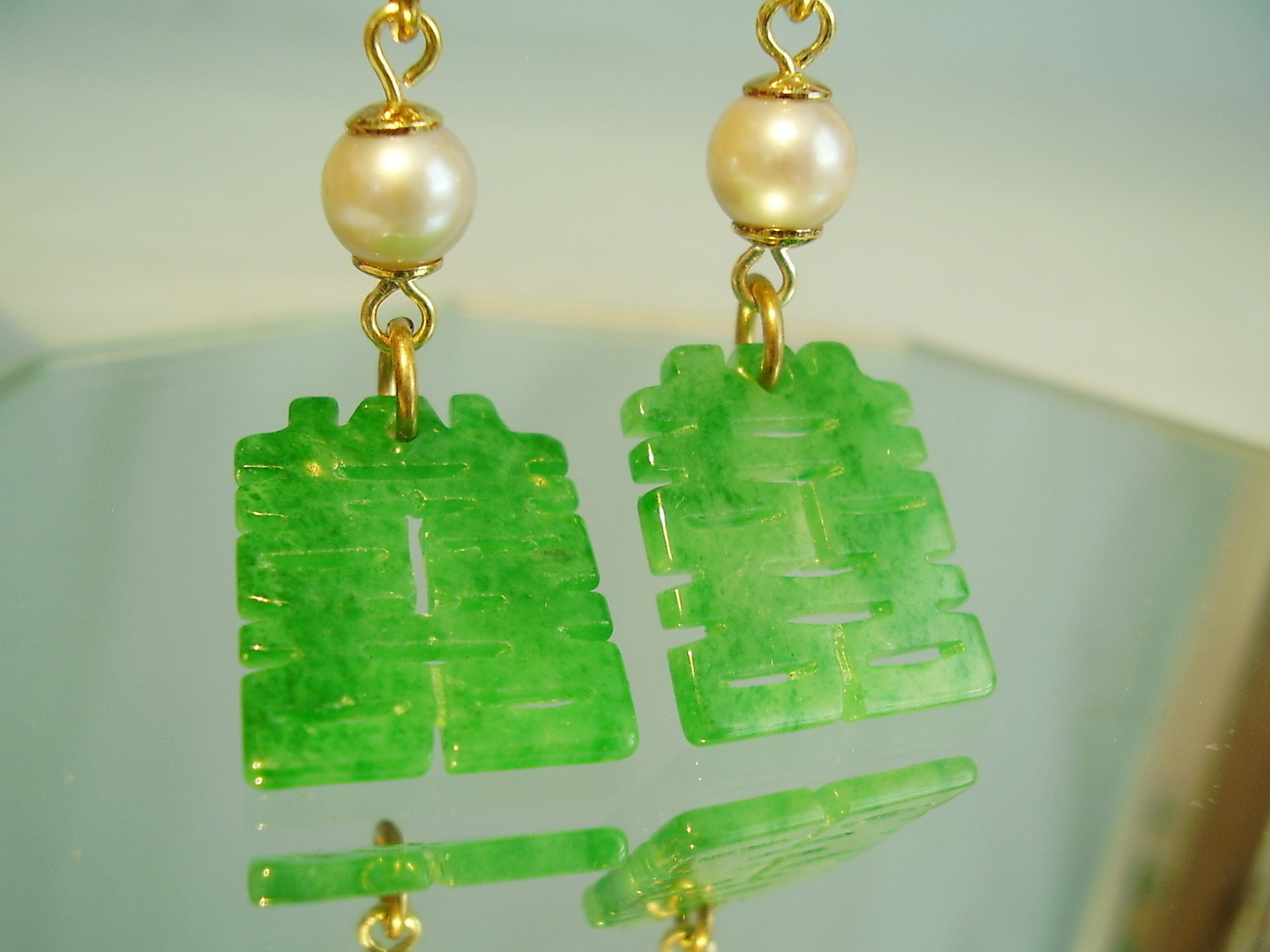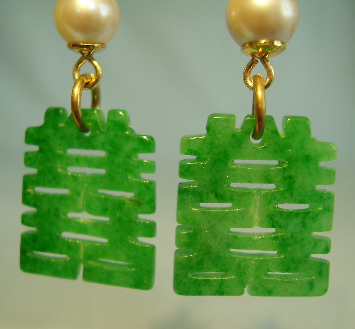 359511. ØRERINGE MED HÅNDSKÆRET JADE-PLADER.