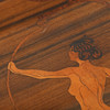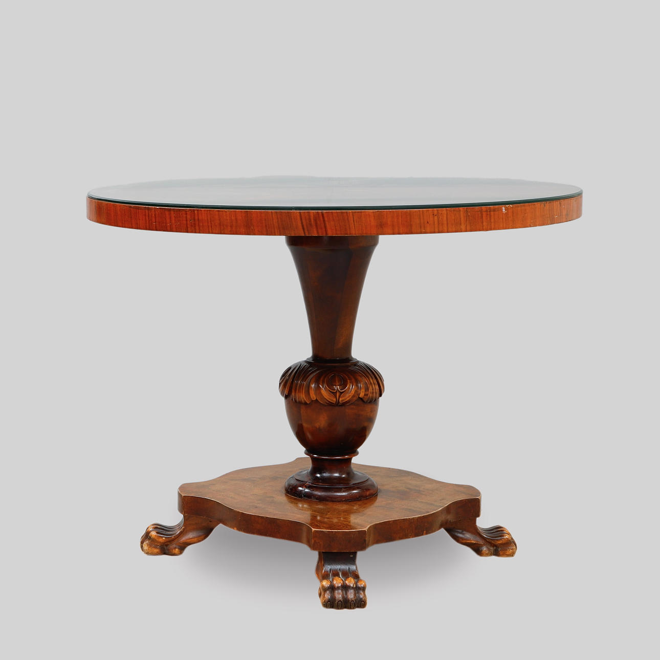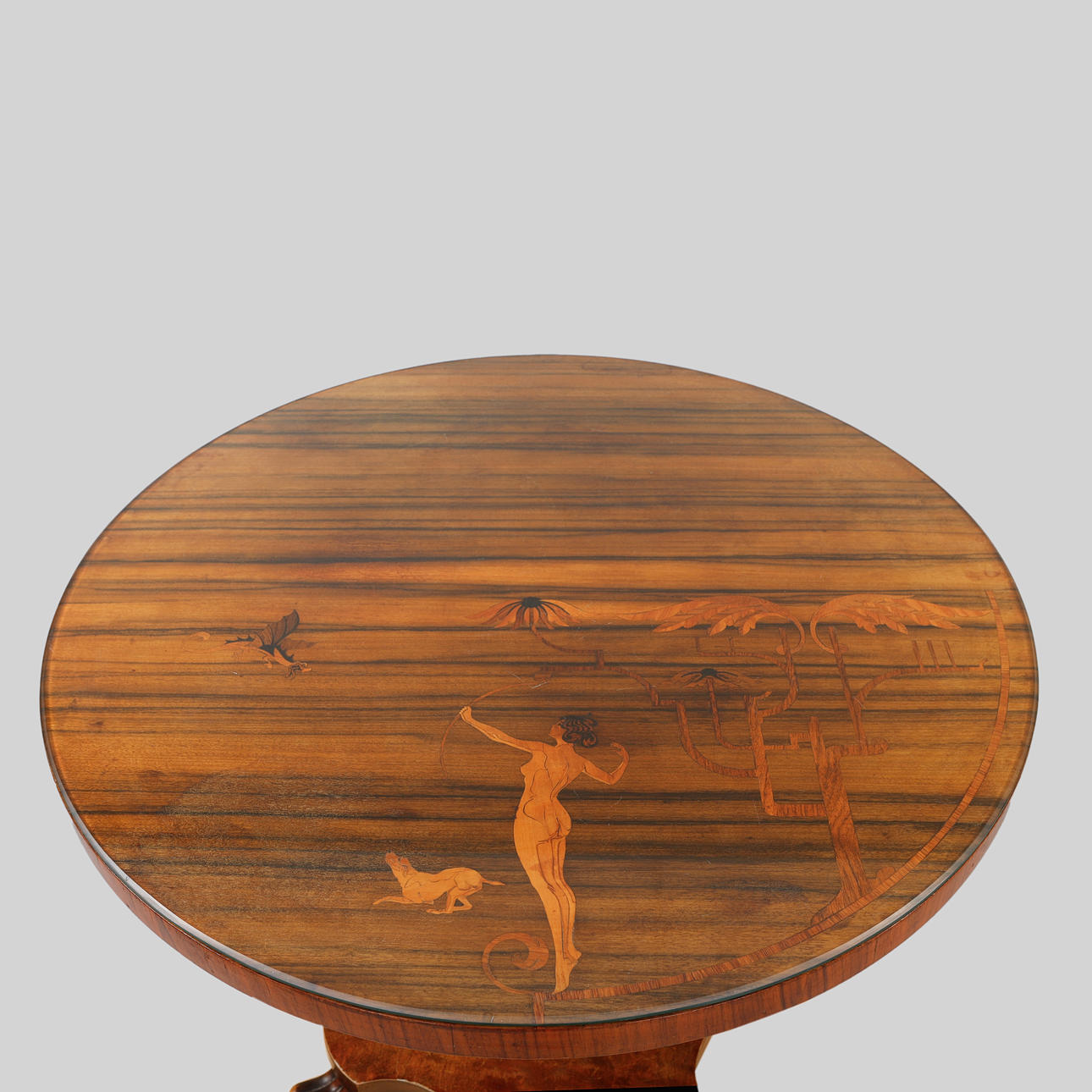 Søjleben med løvepoter i birk. Skive med intarsia-dekoration af gudinden Diana, der retter sin bue mod en flyvende drage. Løs glasplade. Diameter ca. 79 cm, højde 59,5 cm.