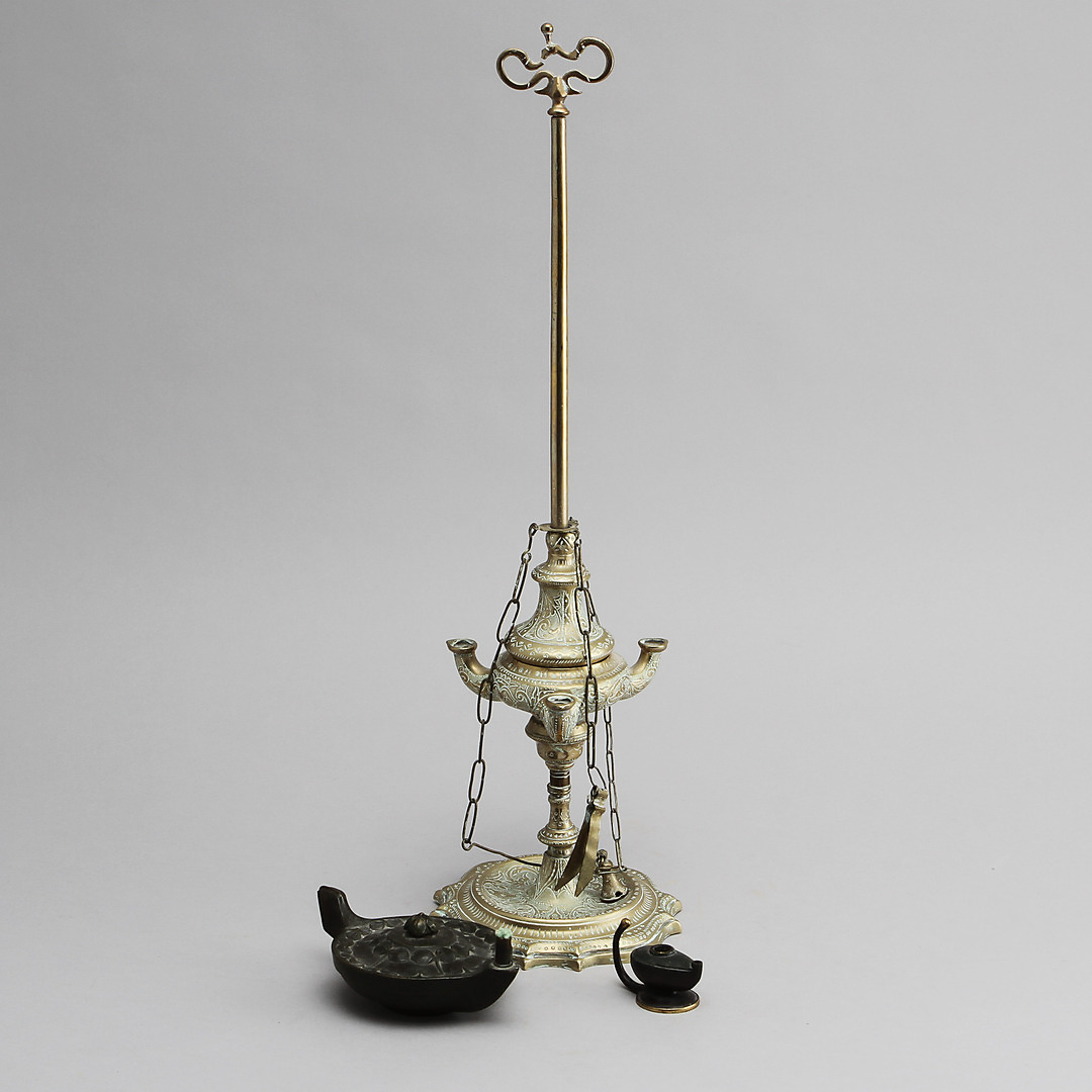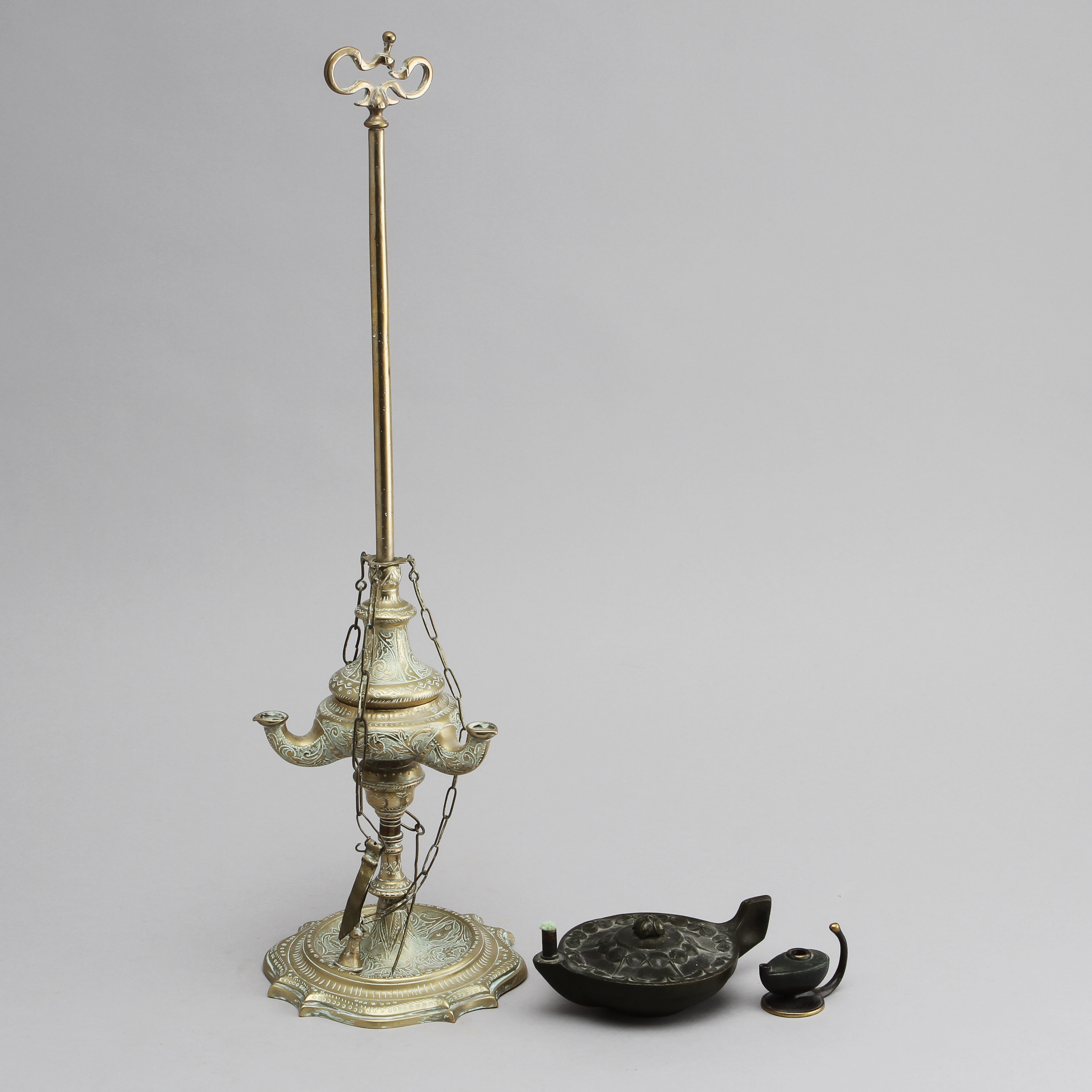 360154. OLIELAMPER, 3 stk, gulmetal og bronze.