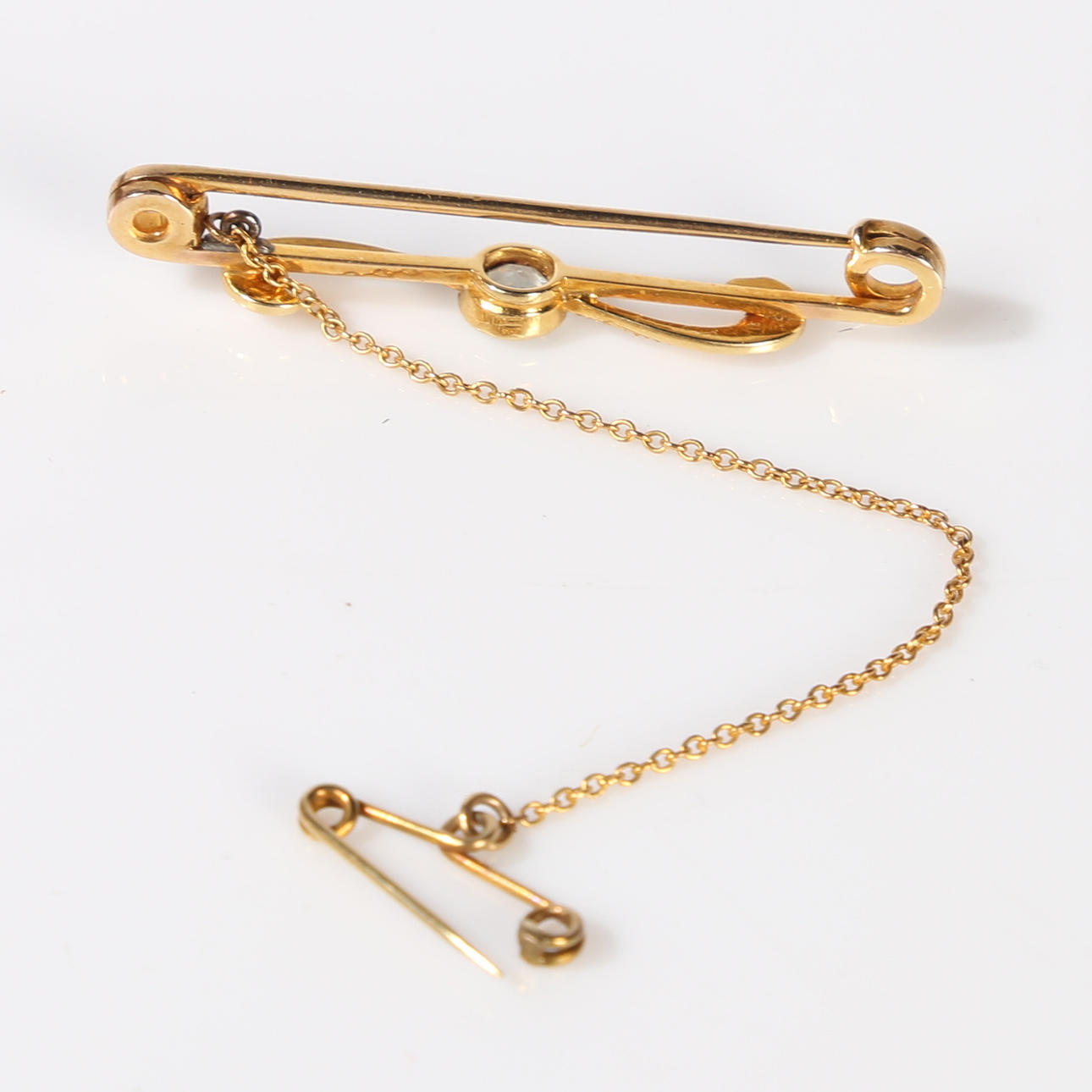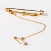 En rund facetteret akvamarin, der måler 4,7 mm. Sæt med seks graduerende frøperler. Stiftformet broschelængde 40mm. Umærket gult metal monteret. Med sikkerhedskæde. Vægt 2,4 g. Komplet med vintage broche æske.