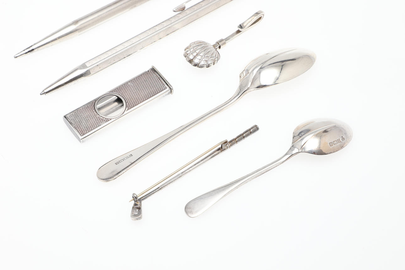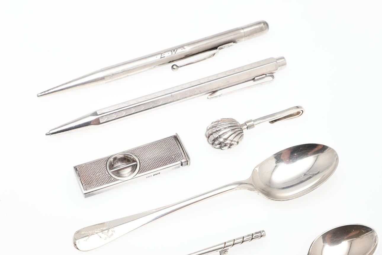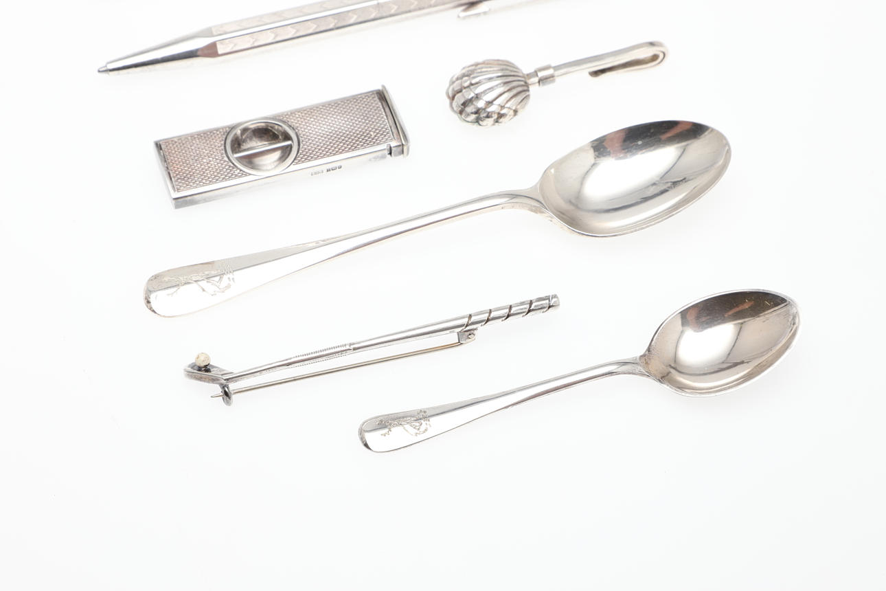 EN SØLV CIGARSKÆRER, SØLVSERVIETTHOLDER, GOLFKLUBBROCHE OG ANDRE GENSTANDE.