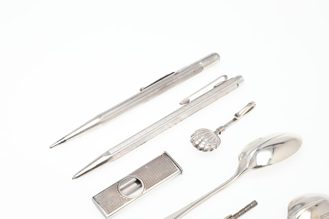 3636232. EN SØLV CIGARSKÆRER, SØLVSERVIETTHOLDER, GOLFKLUBBROCHE OG ANDRE GENSTANDE.