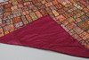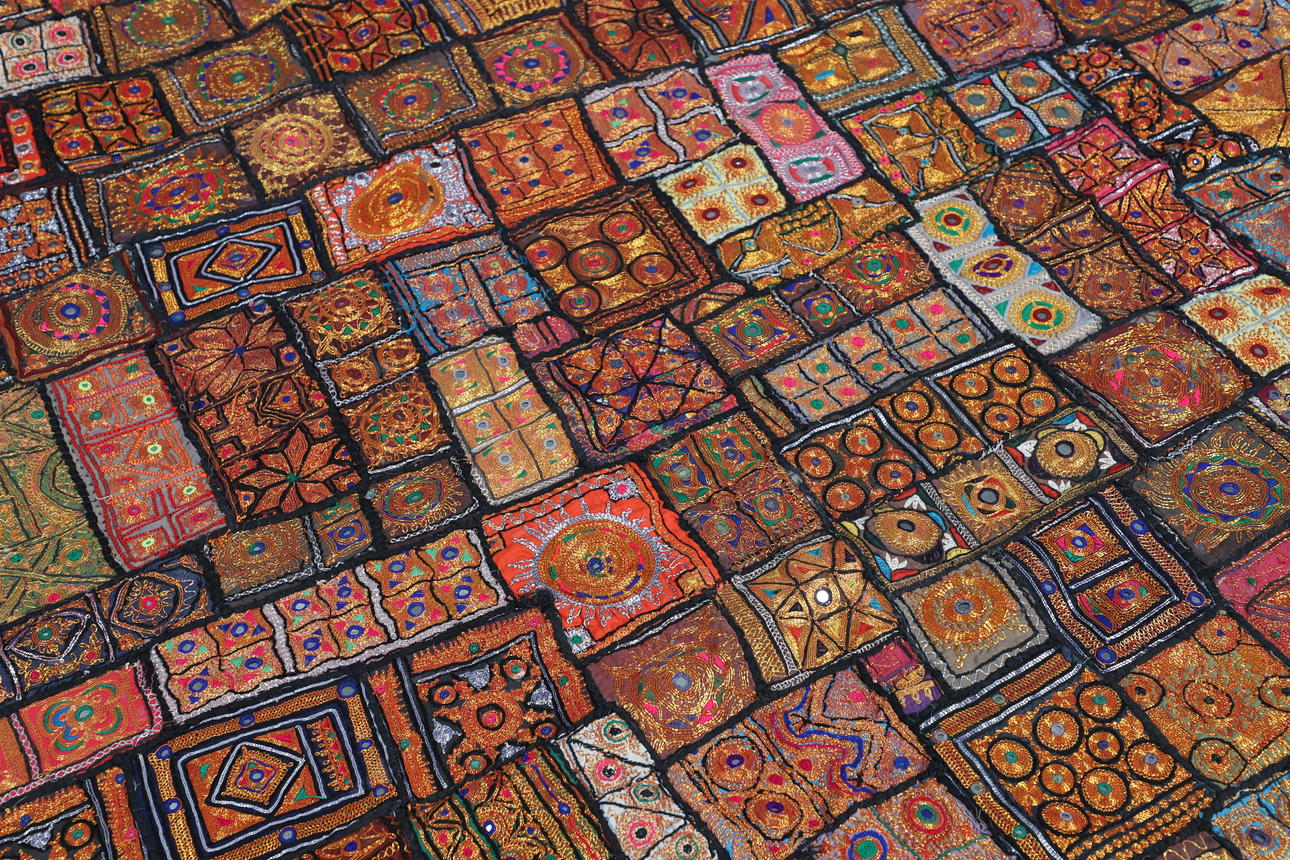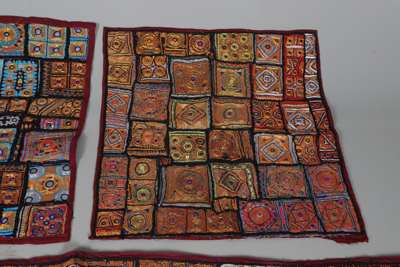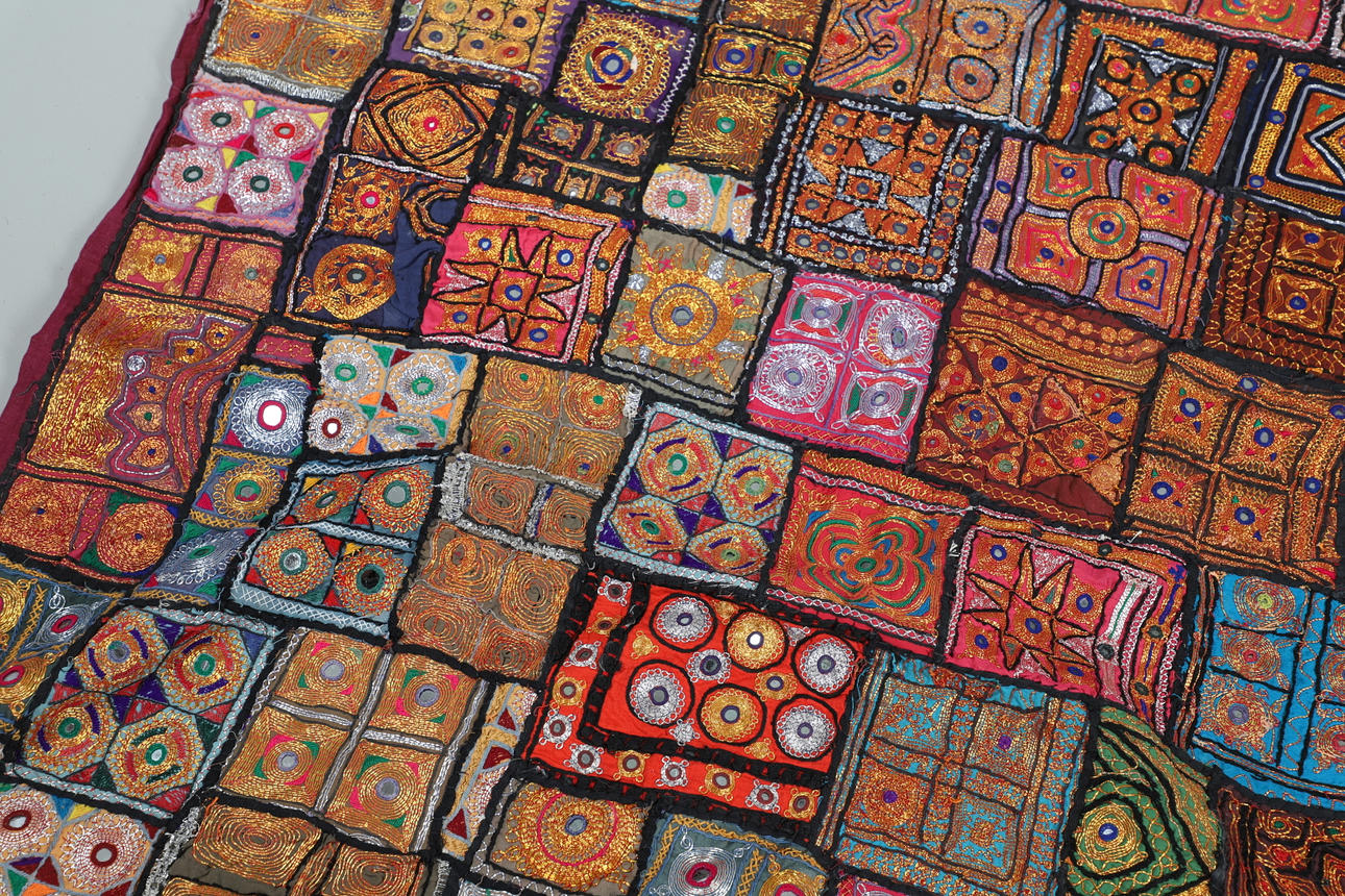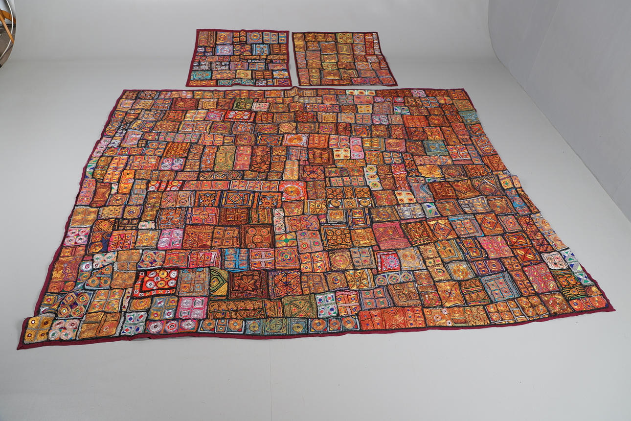Et indisk sengetæppe fra 20. århundrede af applikationer og patchwork design, bearbejdet med metalliske sølv- og guldfarvede tråde og pyntet med små spejle (200 cm x 250 cm), bagpå med lilla bomuld. Sammen med to matchende paneler (hver 75 cm x 78 cm).