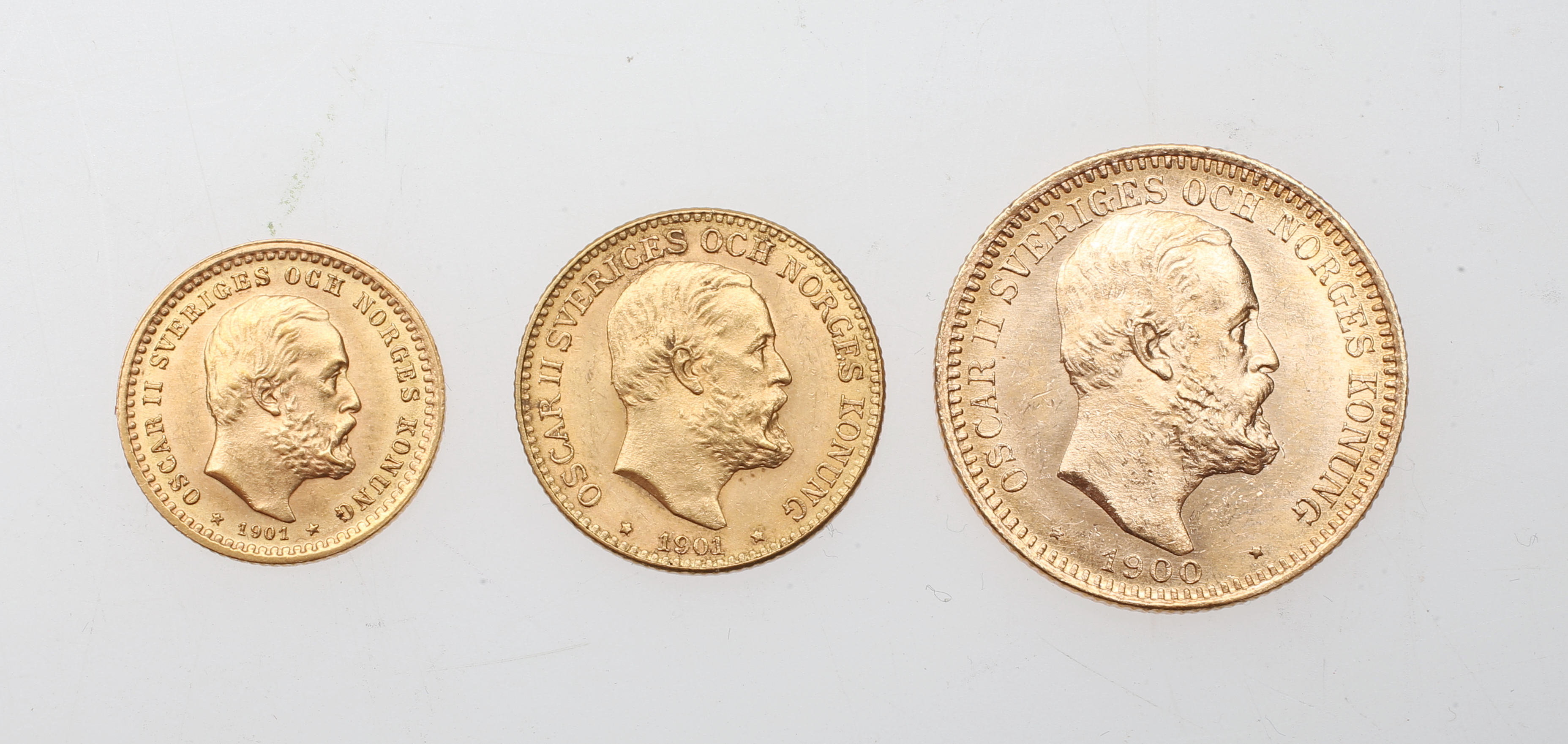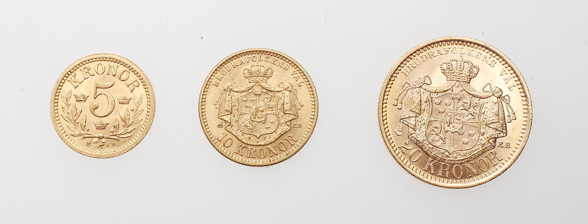 364278. GULD MØNTER, 3 stk, 5 kr, 10 kr og 20 kr.