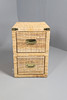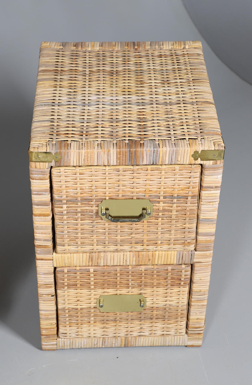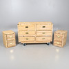 Med seks store skuffer, højde 75cm, bredde 138cm, dybde 46cm. Sammen med et par sengeskabe, højde 59cm. med messingarmaturer og beslag.