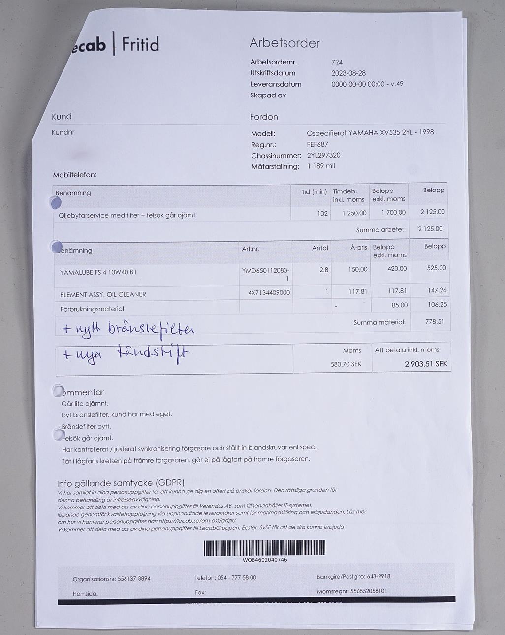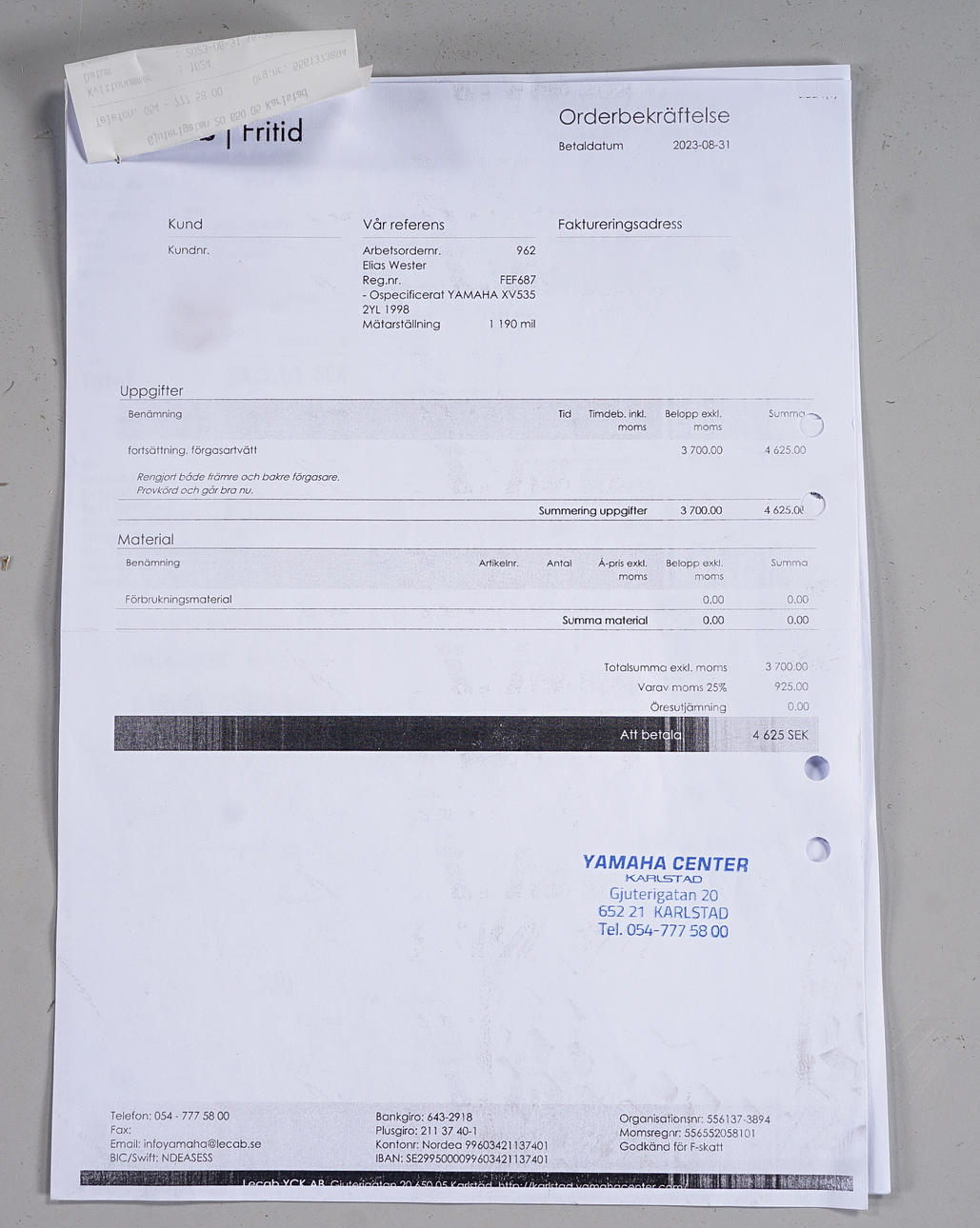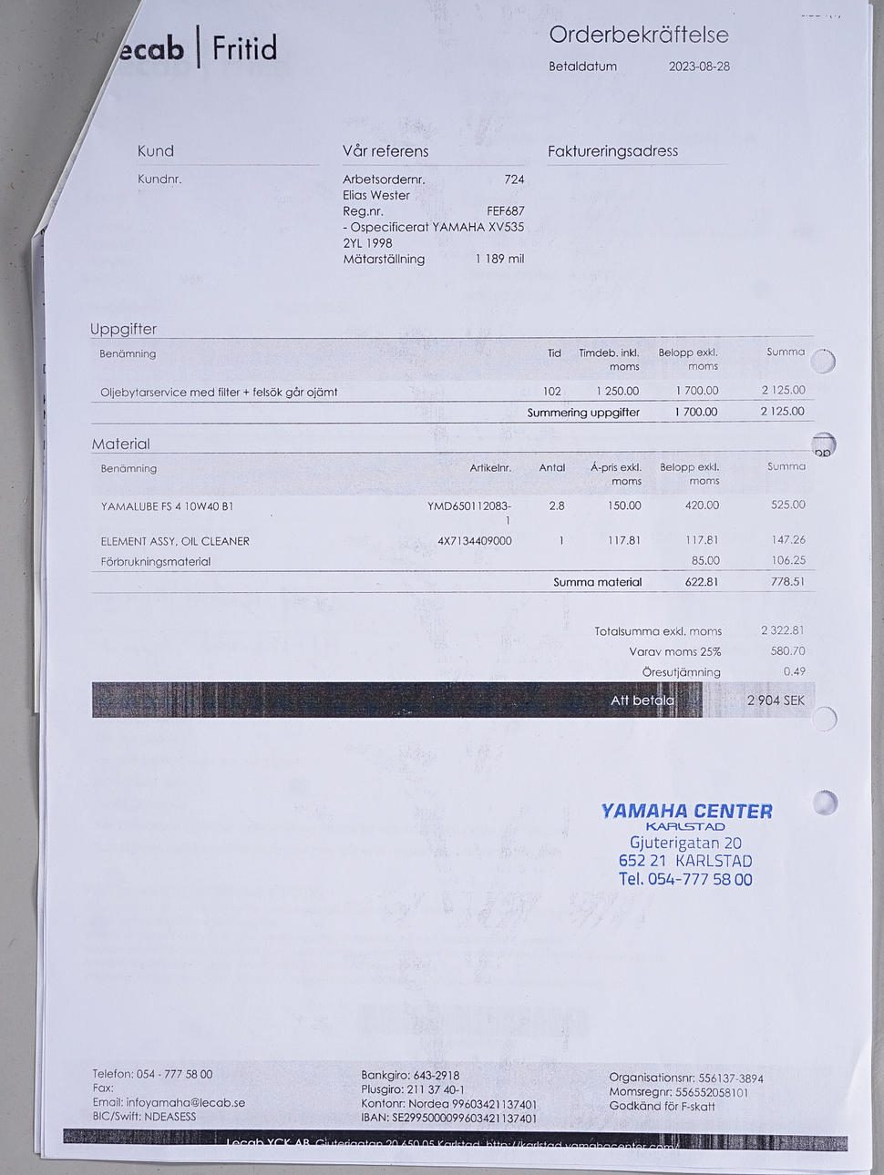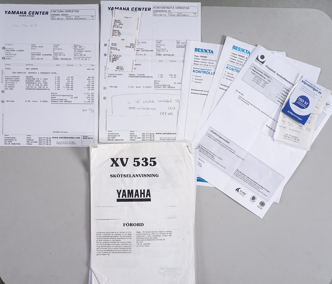 Serviceres årligt, senest august 2023 med udskiftning af olie- og oliefiltre, brændstoffiltre, karburatorvask og nye tændrør. Forskellige dokumenter og kvitteringer er inkluderet.