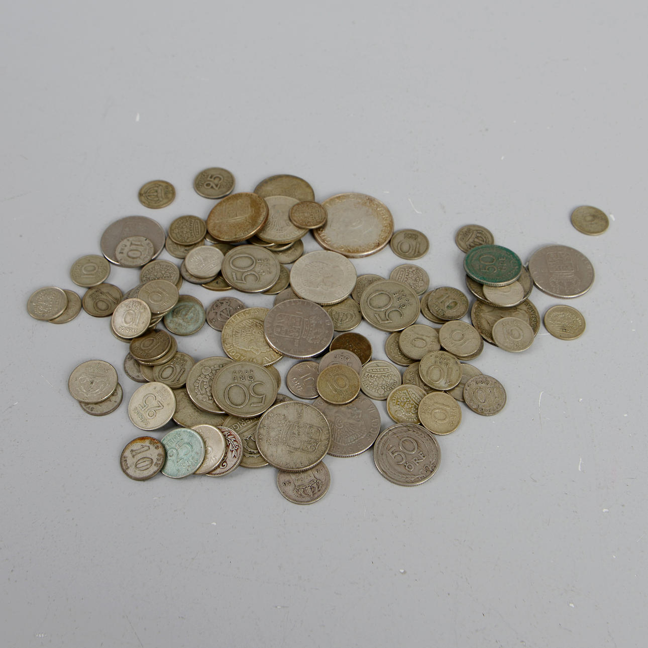 Nogle mønter med 80% sølvindhold. Ca. 260 gram i alt. En 50 ørred ikke sølv (se billede).