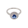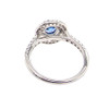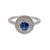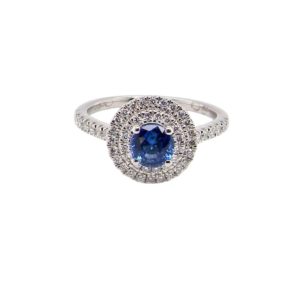 Denne platinringklyngering har en blændende kornblomstblå safirmidtersten 5 mm i diameter. (svarende til 0,50ct).
