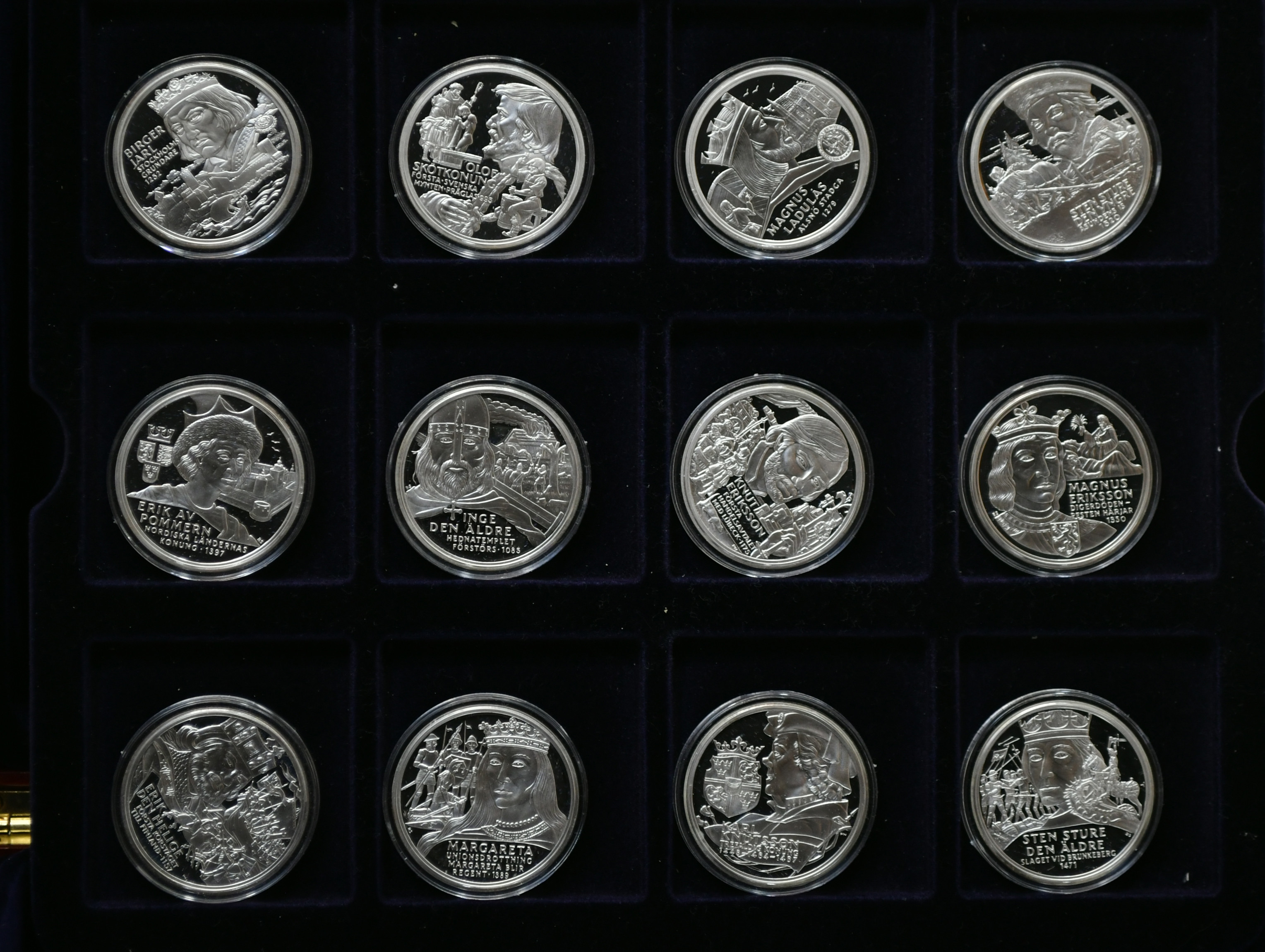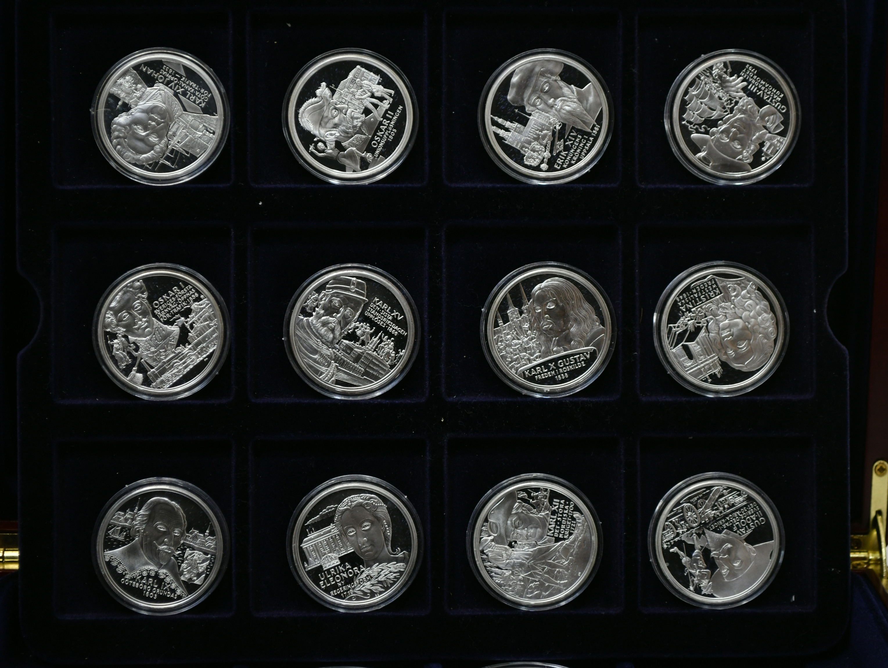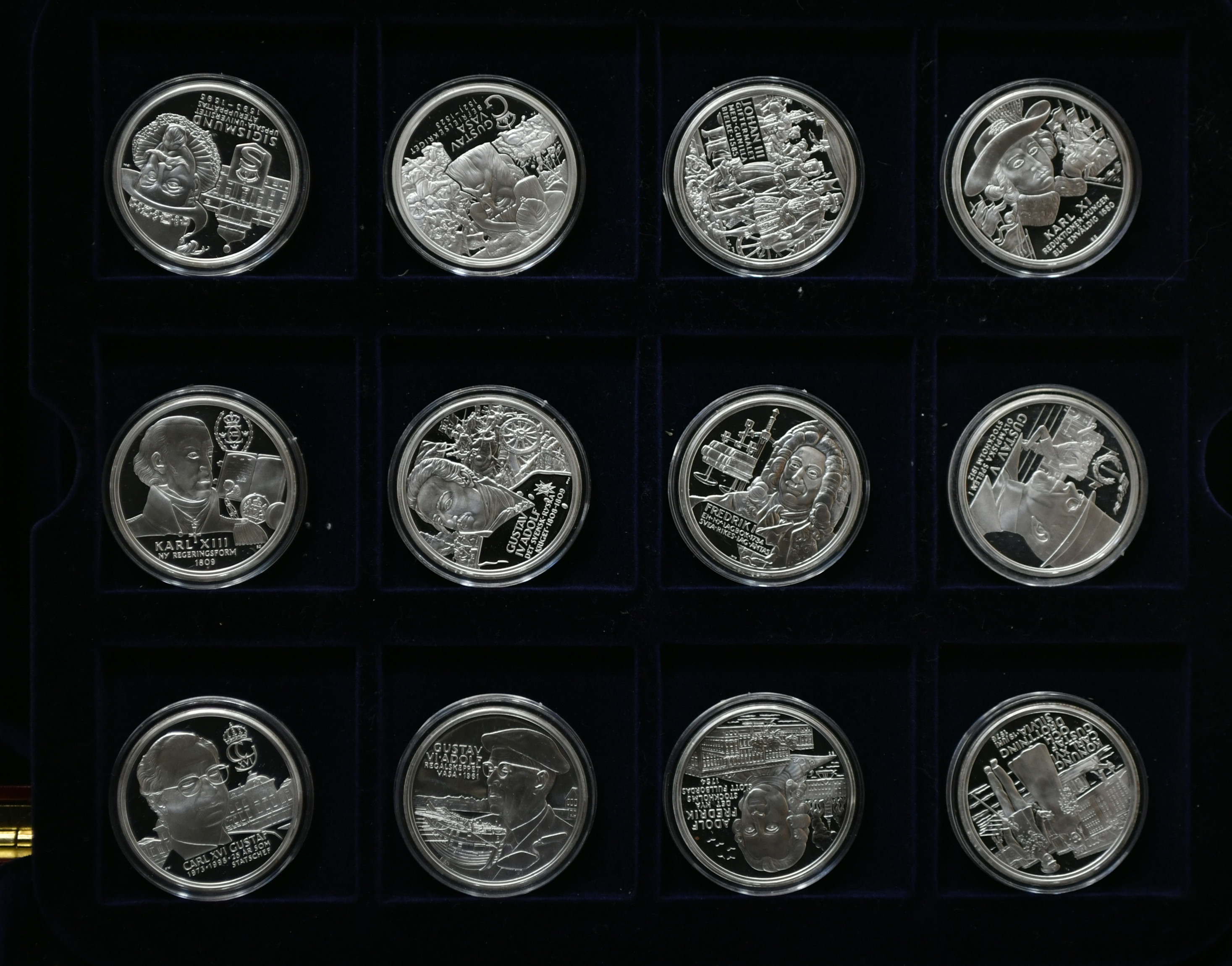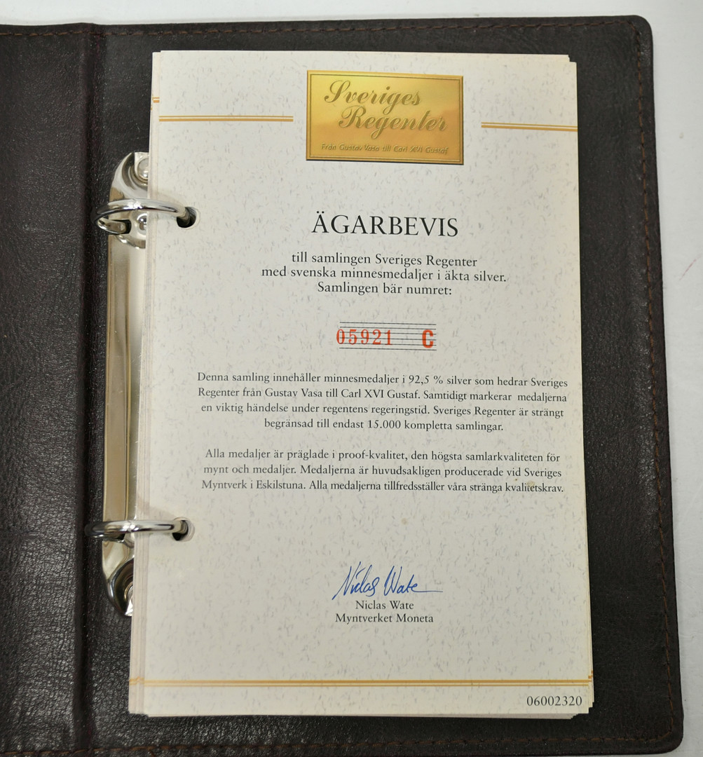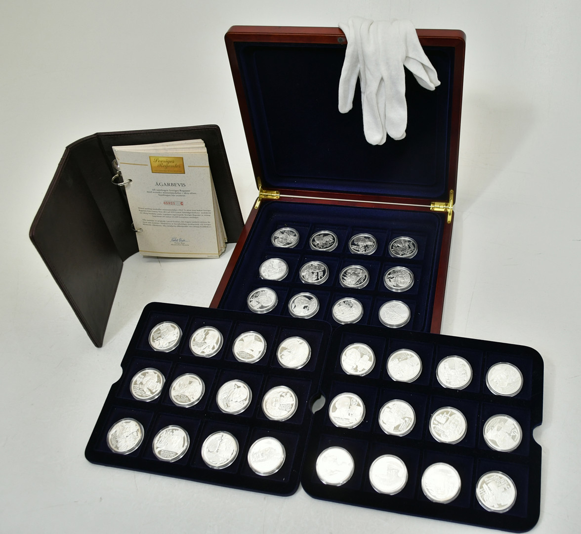 3655477. Regenter af Sverige. 36 Sølv erindringsmedaljer med schatull.