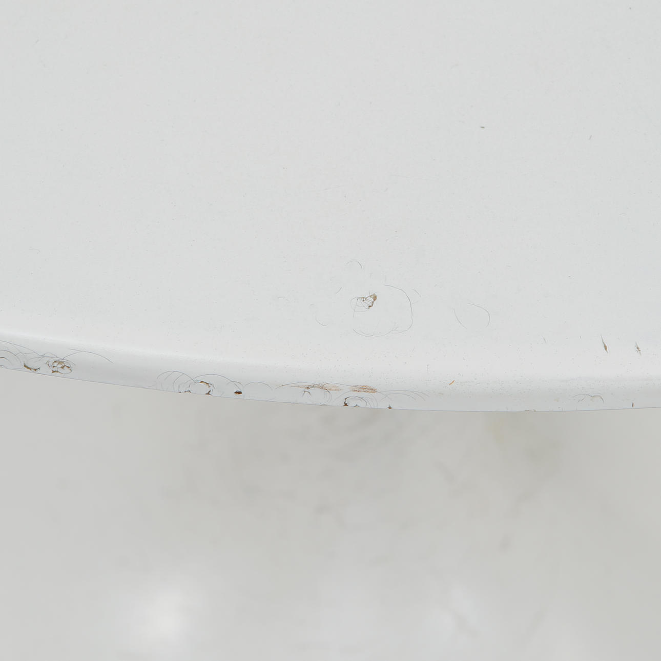 Hvidlakeret metalbund og træplade. Diameter 75, højde 66 cm.