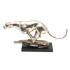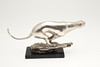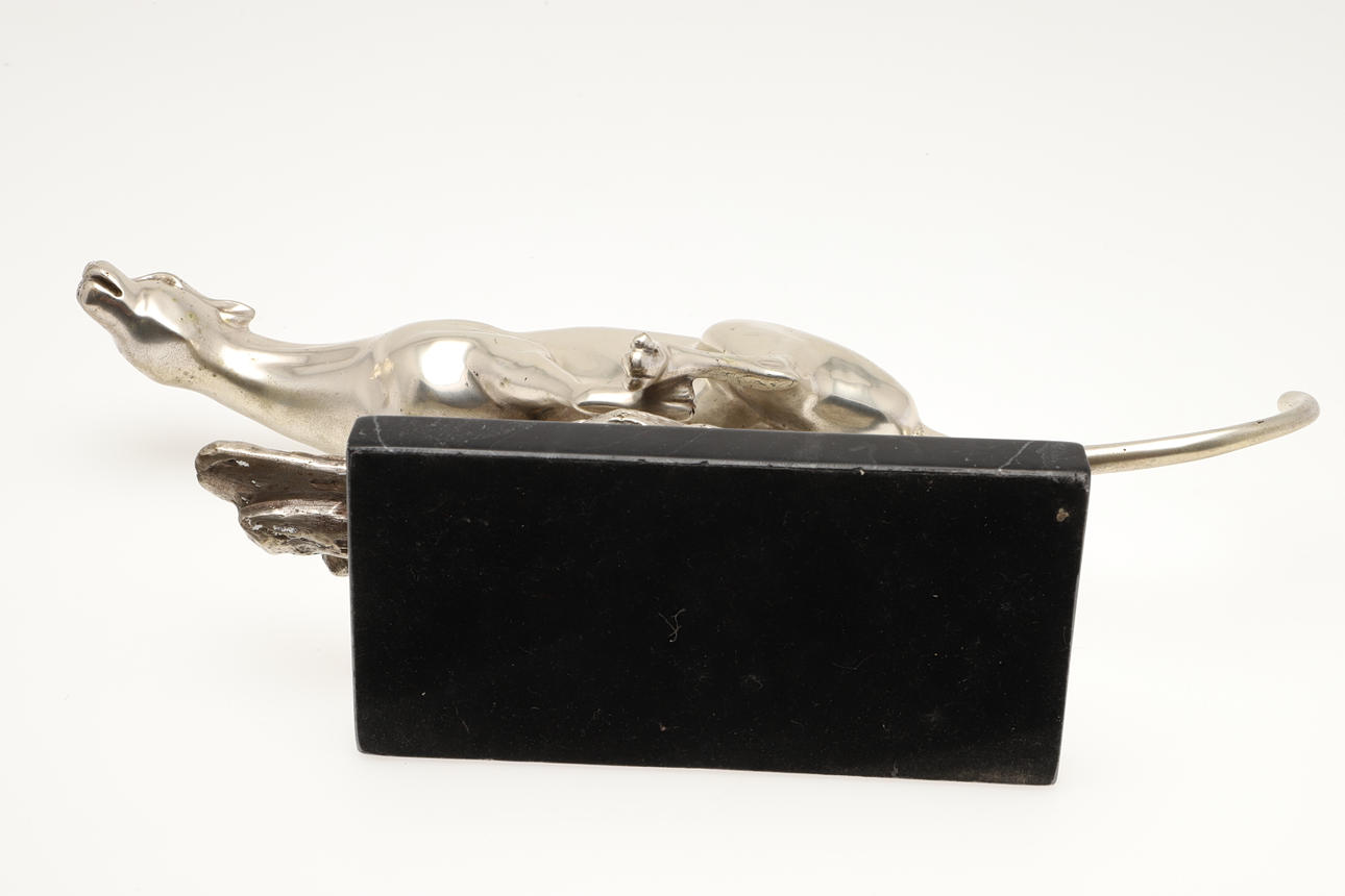 En forsølvet metalfigur af en Jaguar i en løbende position, på en metalsokkel og monteret på en marmorbase. Usigneret, 39.5cms lang, 19cms høj.