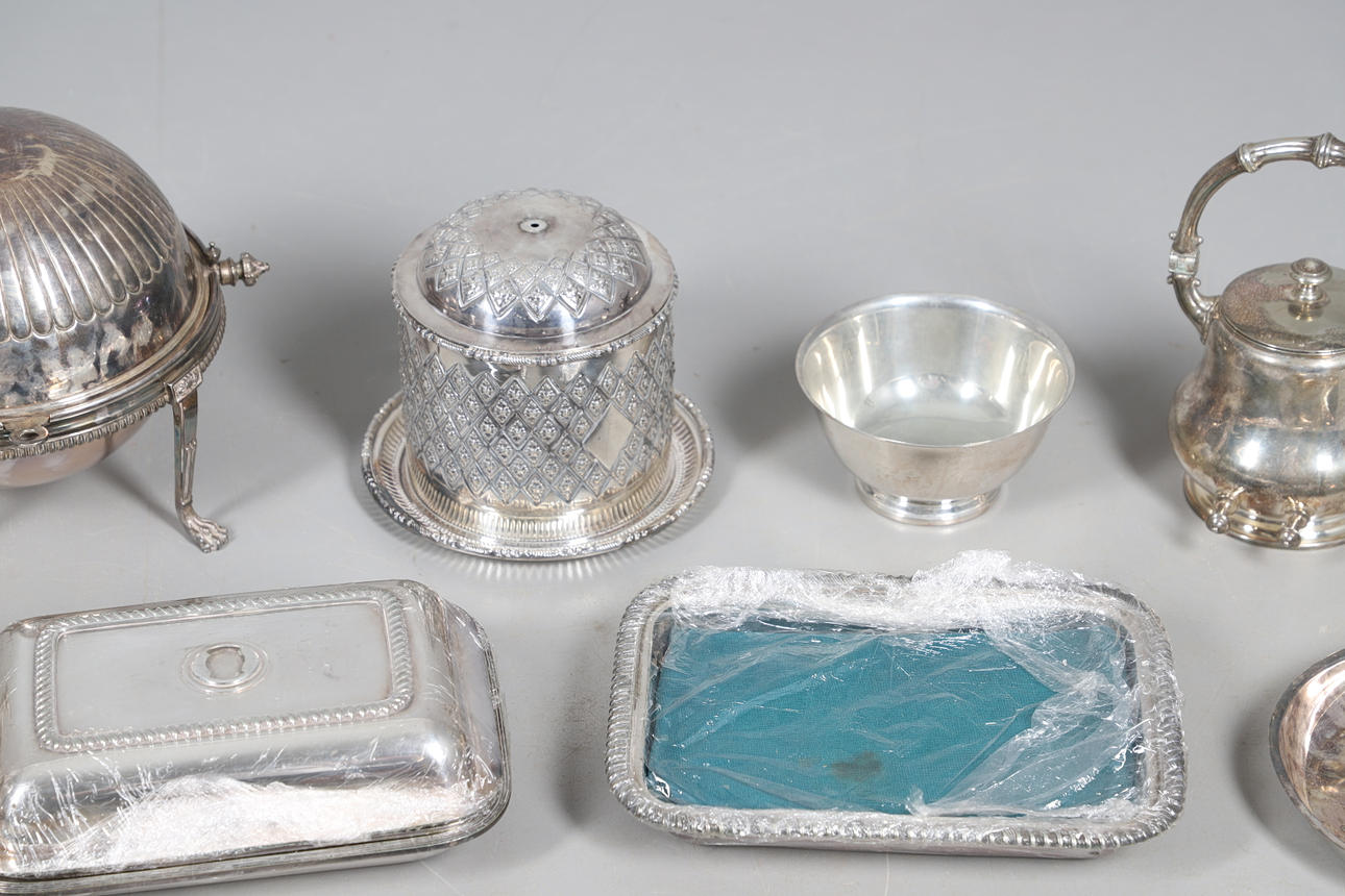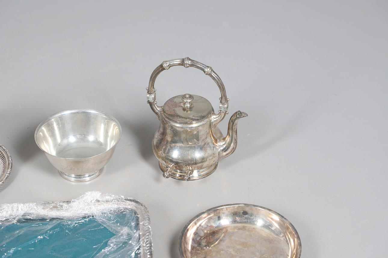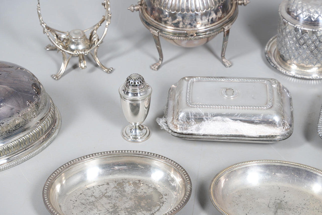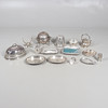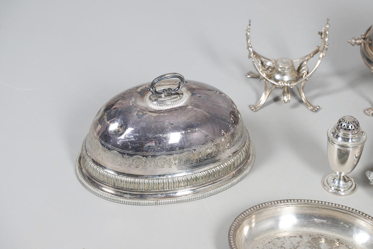 med en løgformet krop og en spredt cirkulær fod, der mangler finial, af Josiah Williams & Co, London 1934, sammen med en stor mængde sølvbelagte varer, herunder hovedretter og låg, en kiksboks, kedel på stativ osv.; støbehjulet 4,75" (12 cm) højt; 5,5 oz vægtbart sølv.