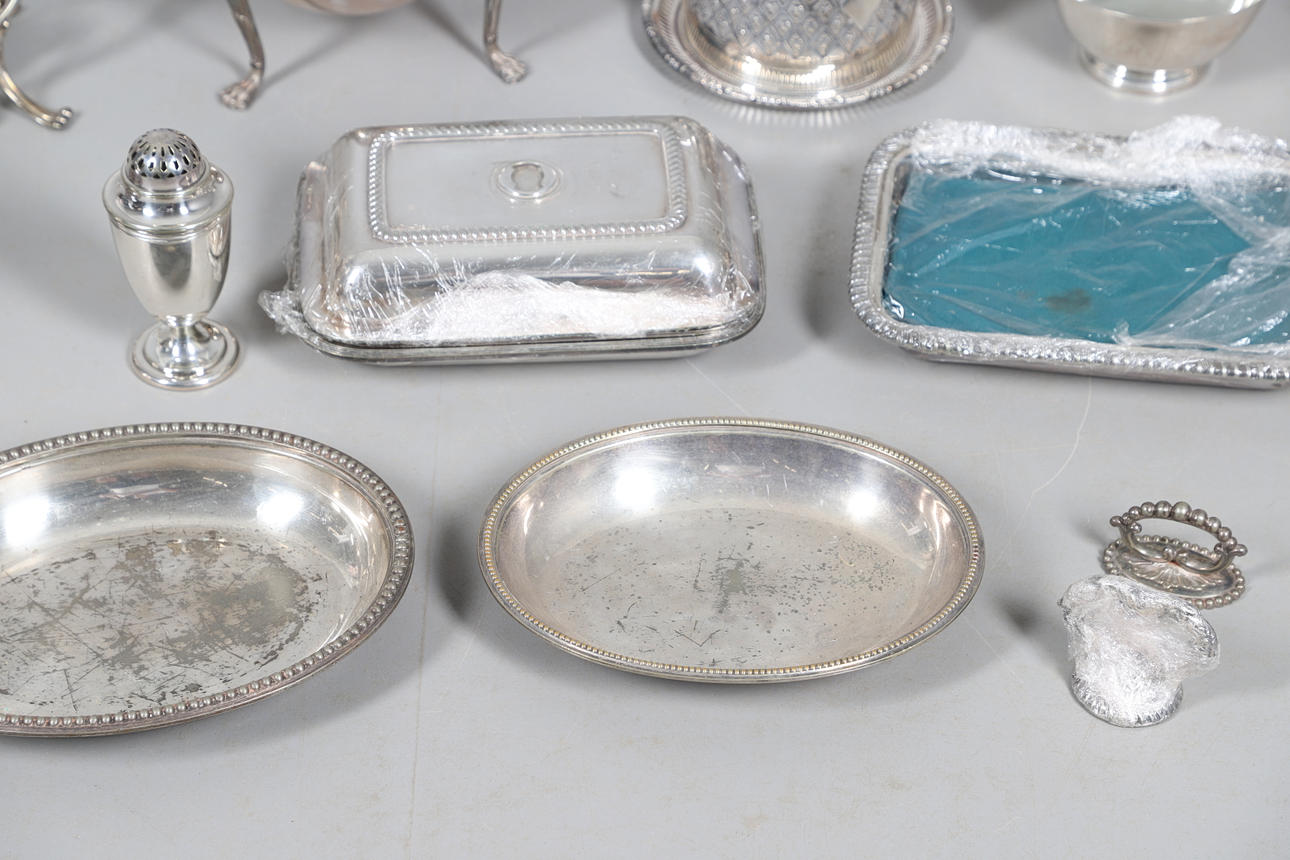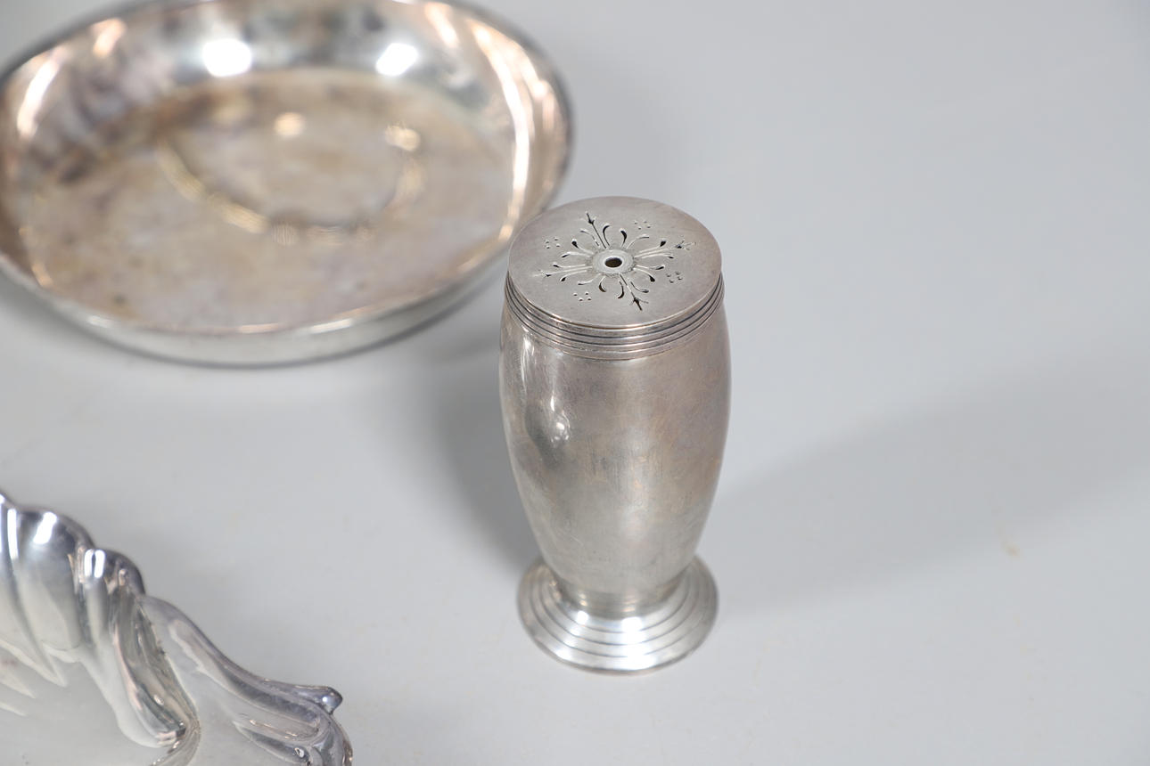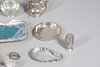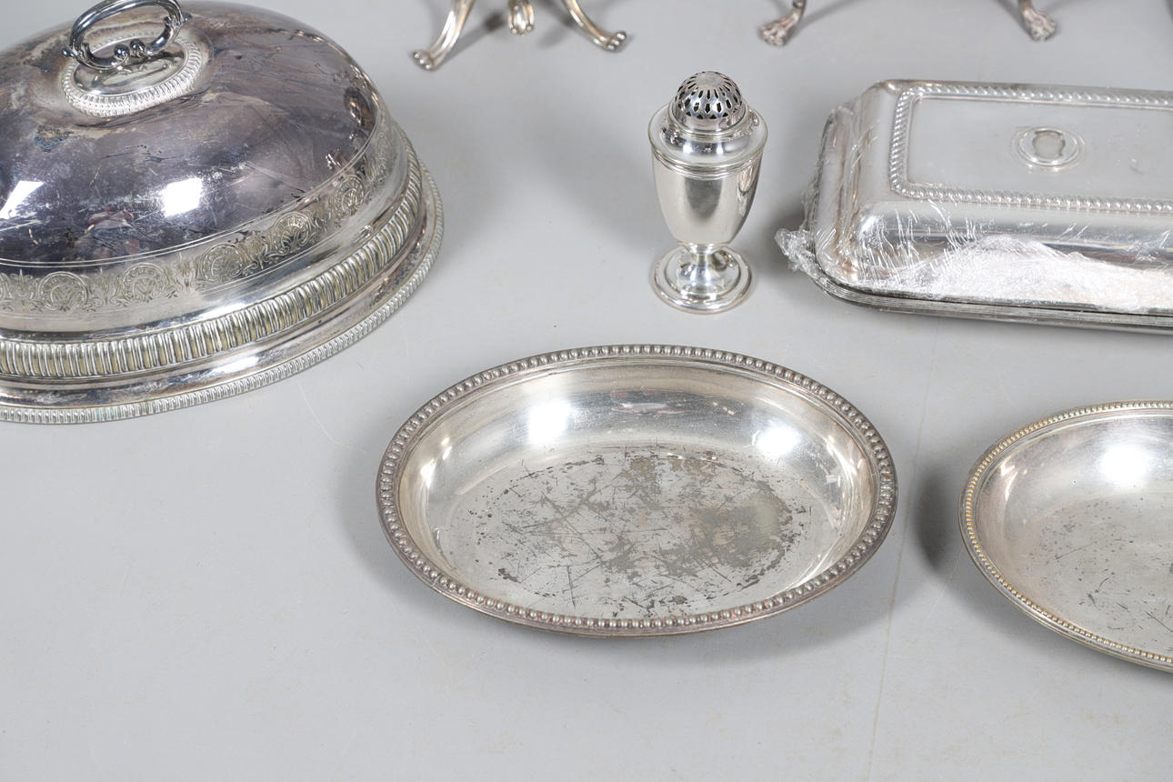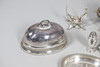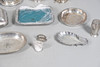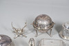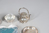med en løgformet krop og en spredt cirkulær fod, der mangler finial, af Josiah Williams & Co, London 1934, sammen med en stor mængde sølvbelagte varer, herunder hovedretter og låg, en kiksboks, kedel på stativ osv.; støbehjulet 4,75" (12 cm) højt; 5,5 oz vægtbart sølv.
