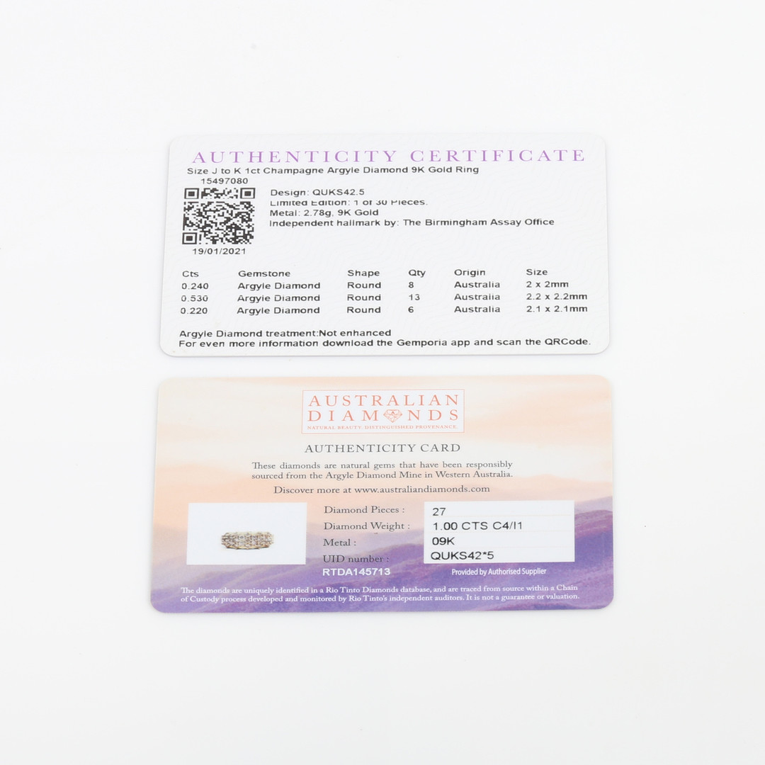 3673853. 9CT GULD 1CT ARGYLE DIAMANT KJOLERING.