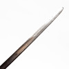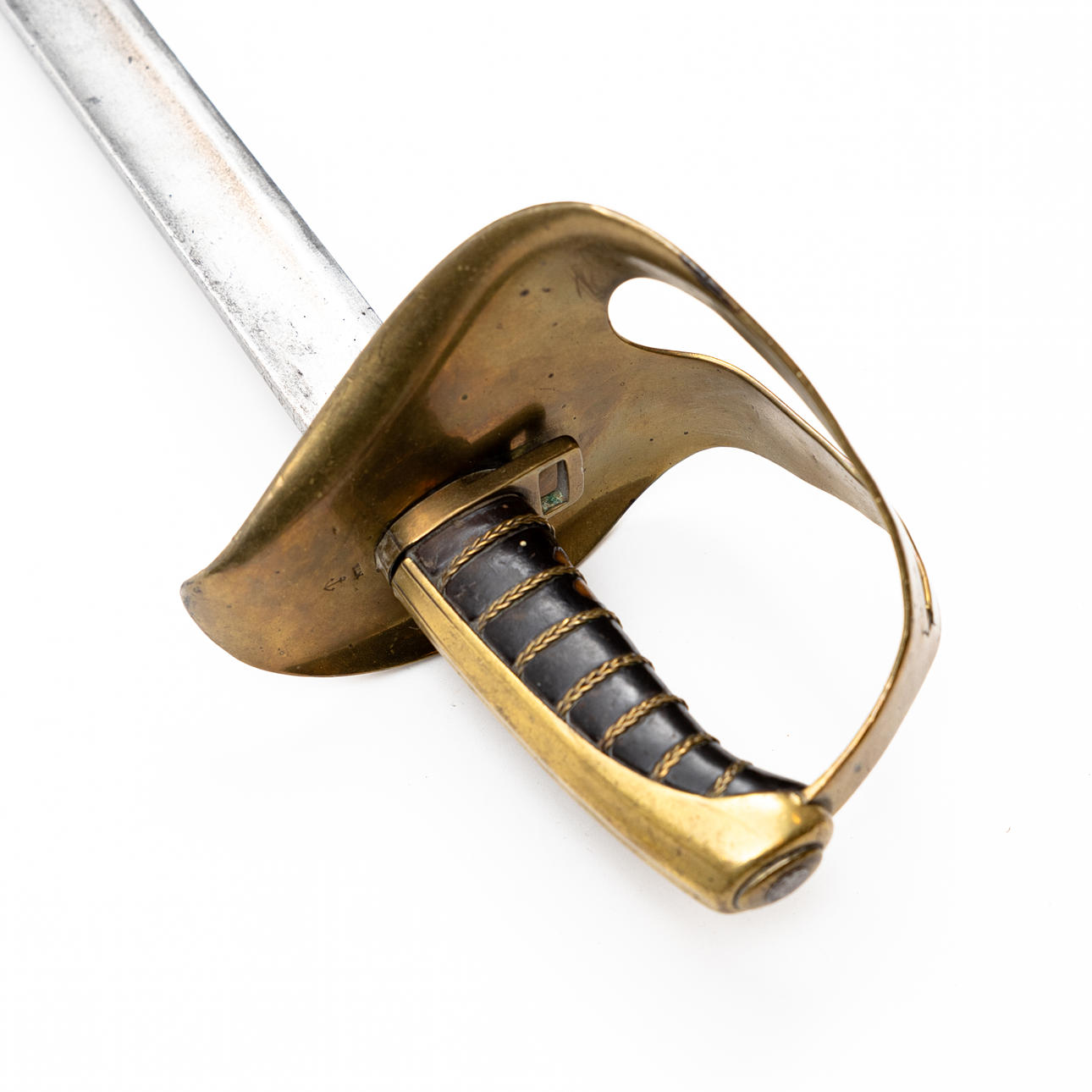 Slid, bladet med oxidpletter, bøjlerne på fastgørelseselementet med brud. Lædervikling med to huller. Stump spids, æg med mindre hak. Ikke originalt karbad, med mindre rustpletter.