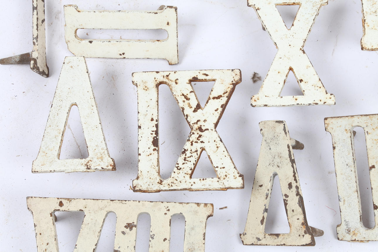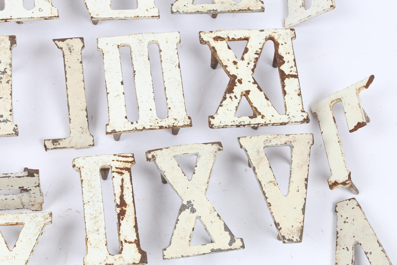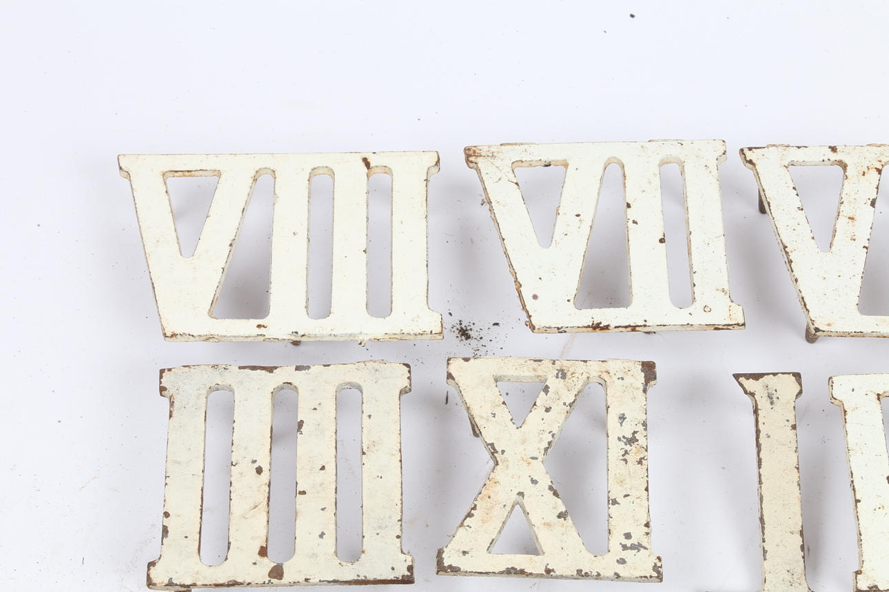 Et sæt romertal i støbejern til urgolf, der hver måler ca. 8,5 cm højde (som læst). (antal).