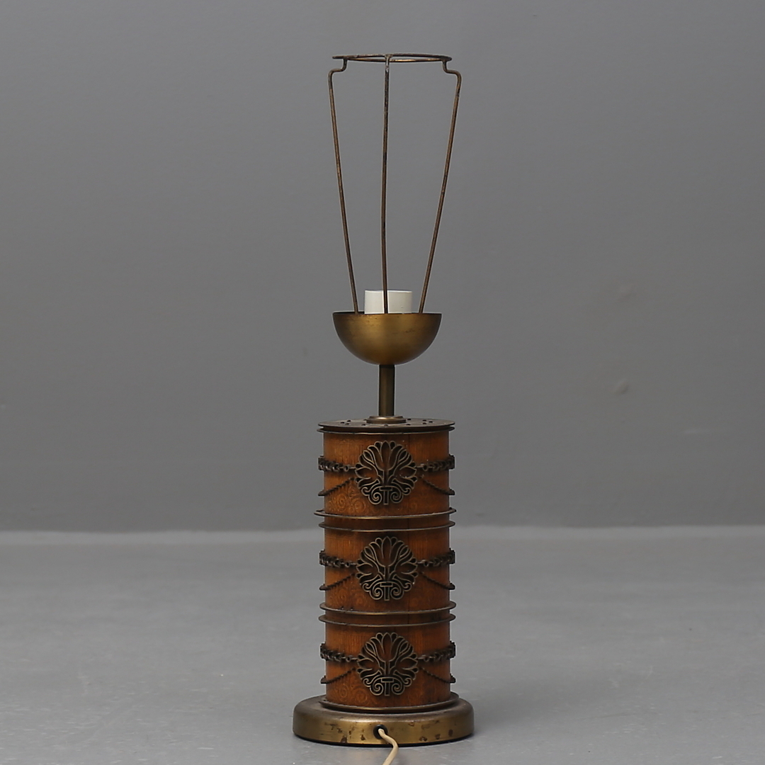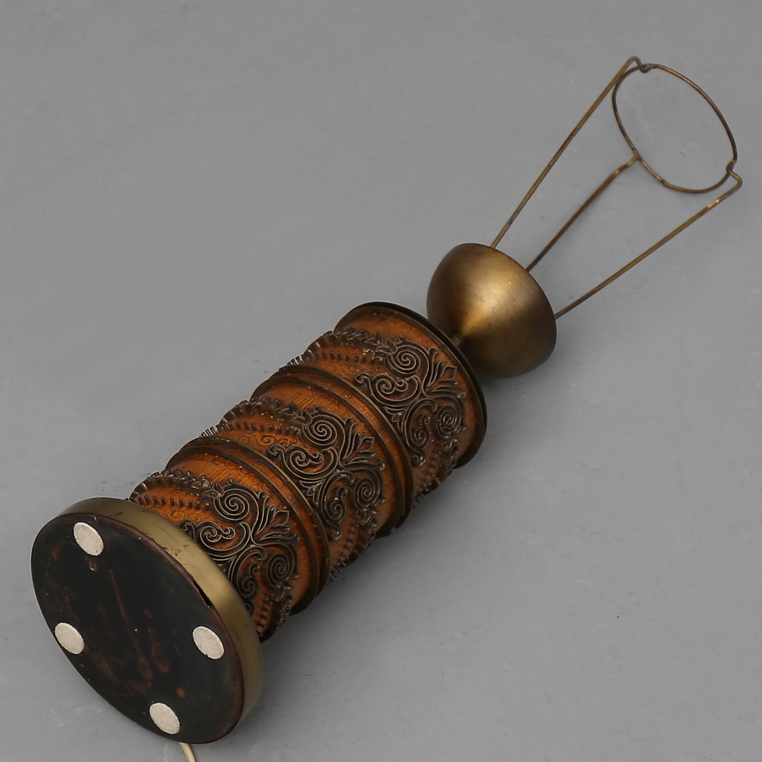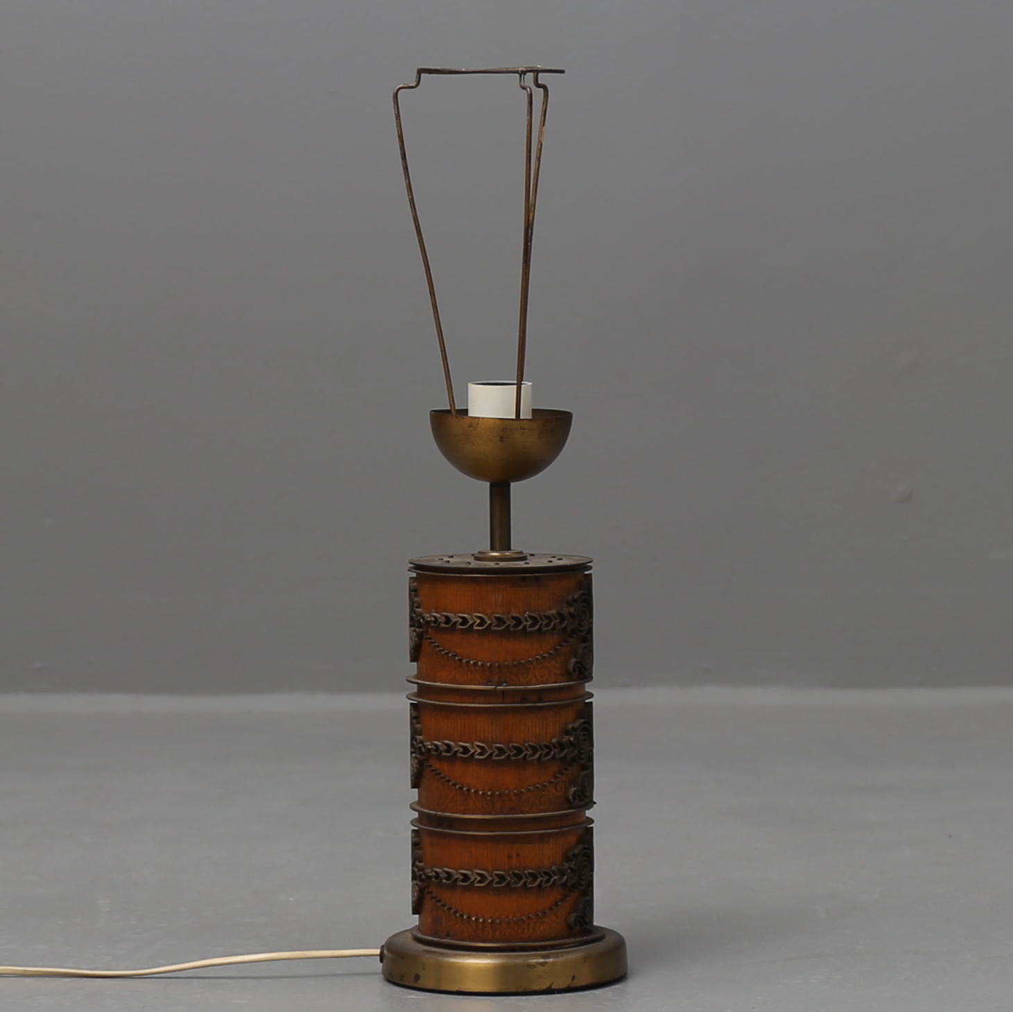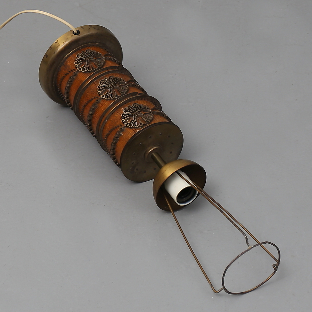 368382. LAMPEFODE lavet af tapetrulle, træ og messing.