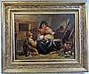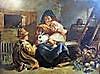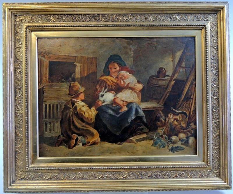 Mor med barn ved kaninhytten, på bagsiden på messingpladen indskrevet. Richard Hollingdale, olie/plade, indrammet, H x B ca. 30x40 cm.