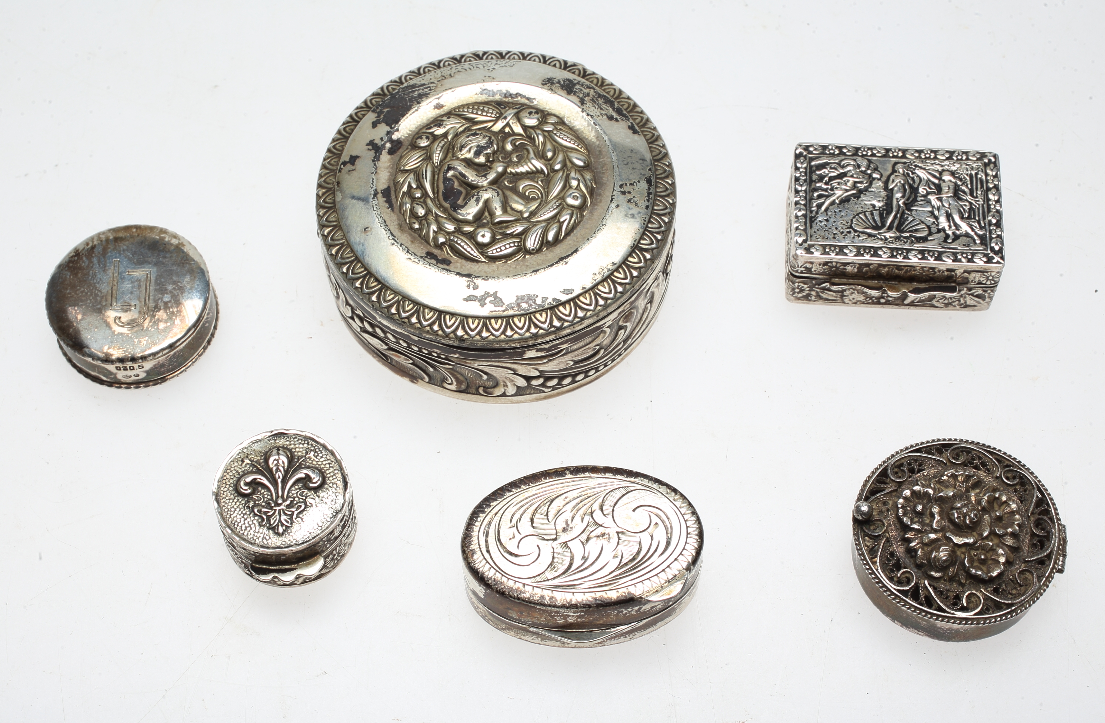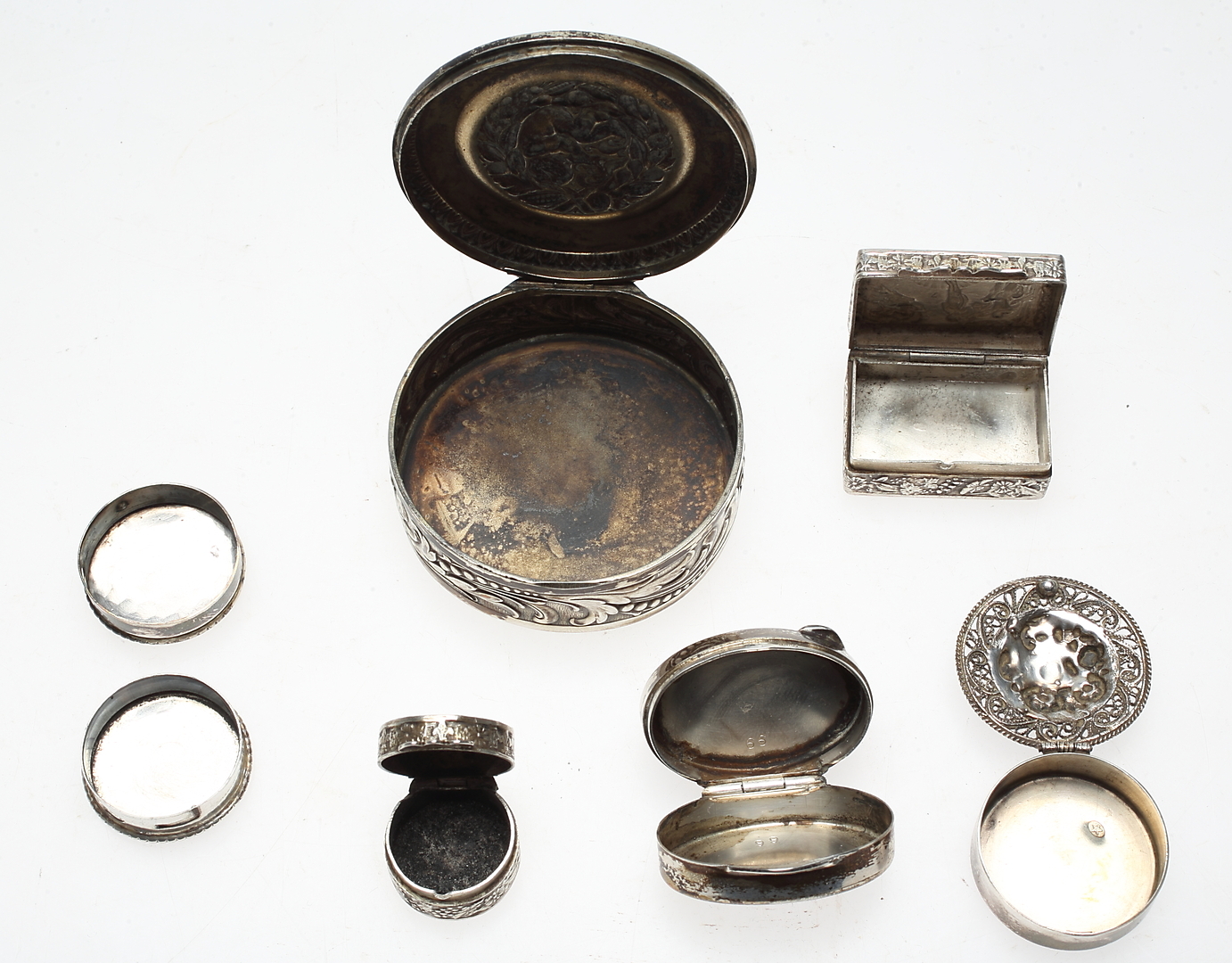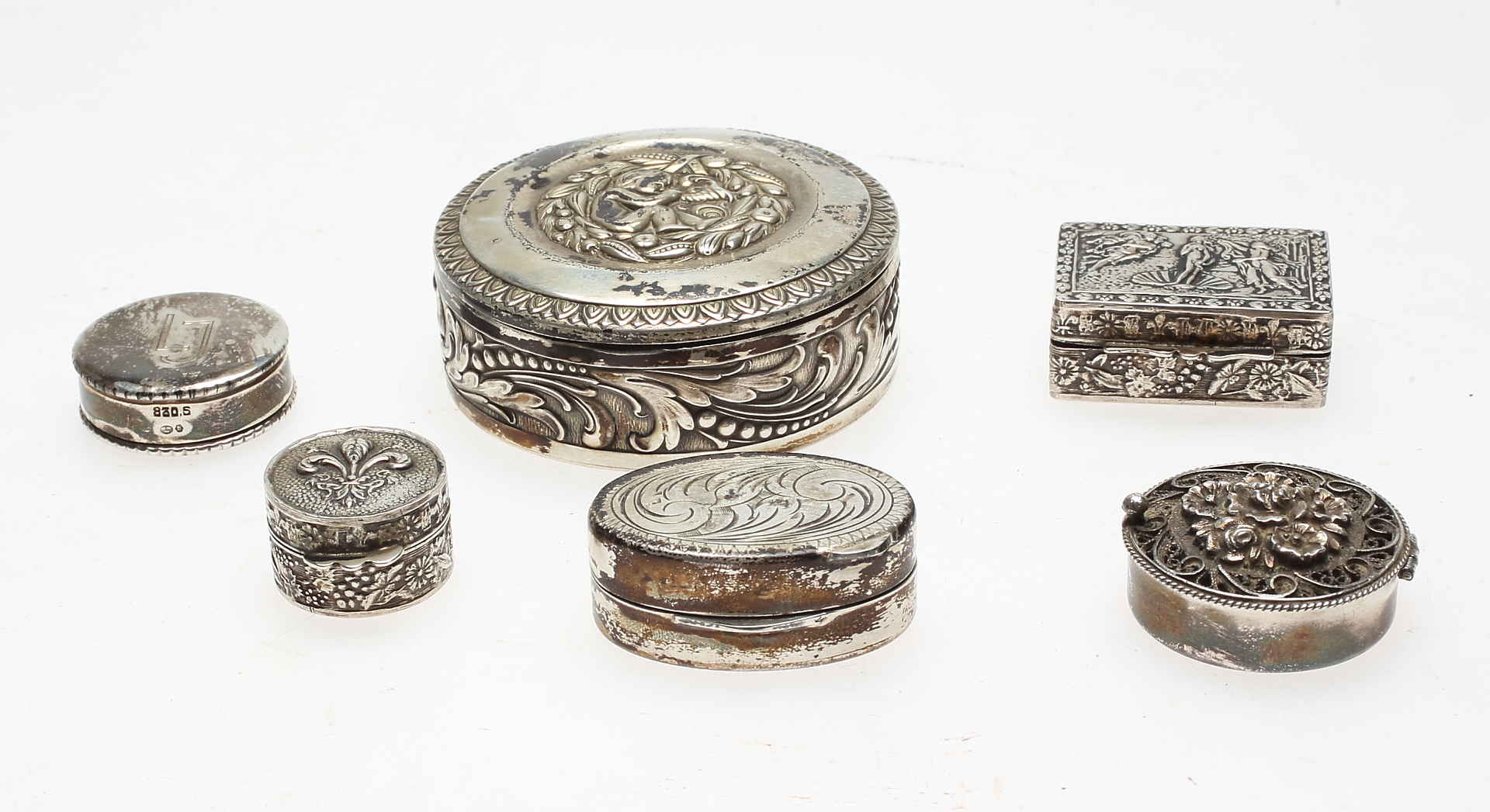 370430. NIPPERASKAR og ÆSKE, sølv, 5 stk, 1900-tallet.