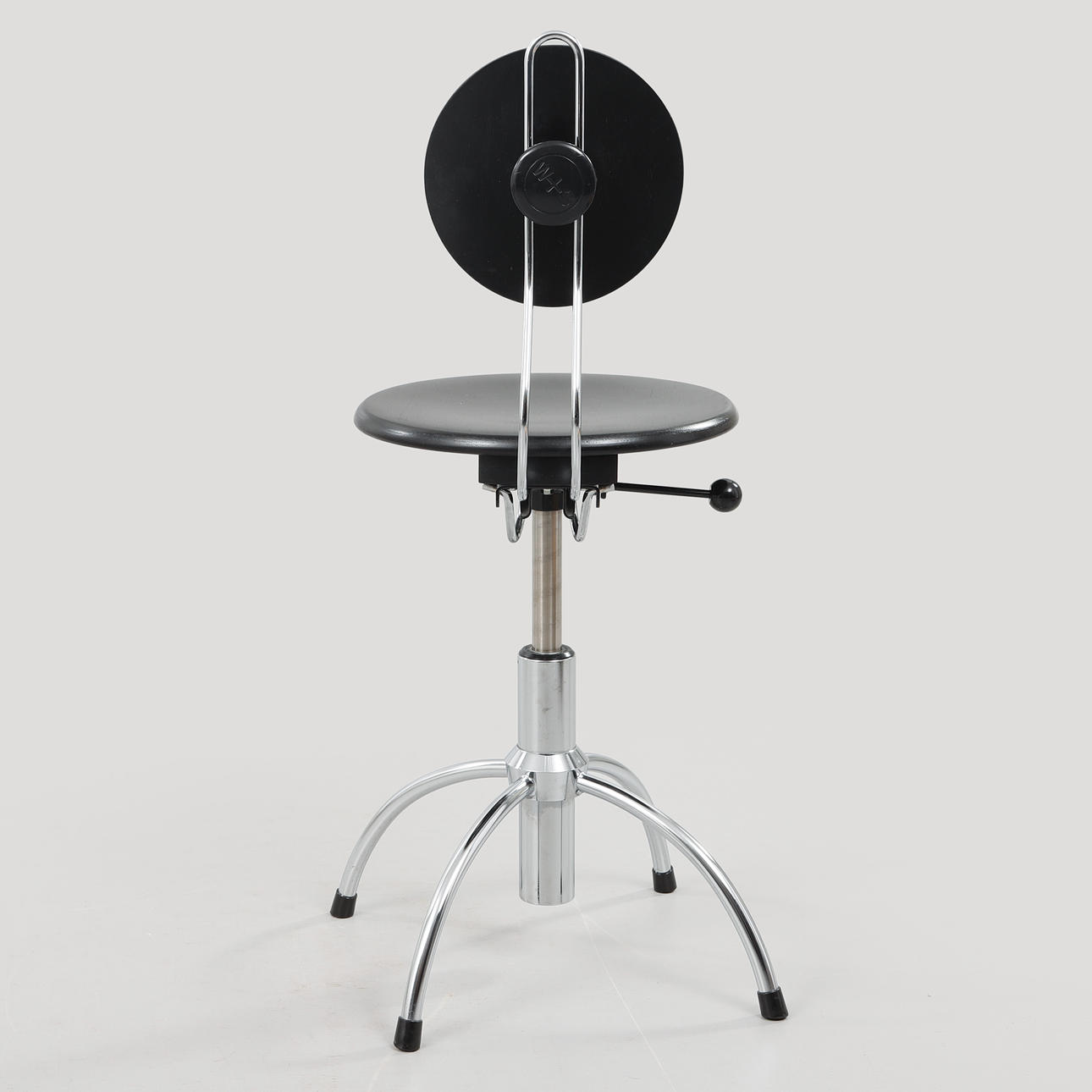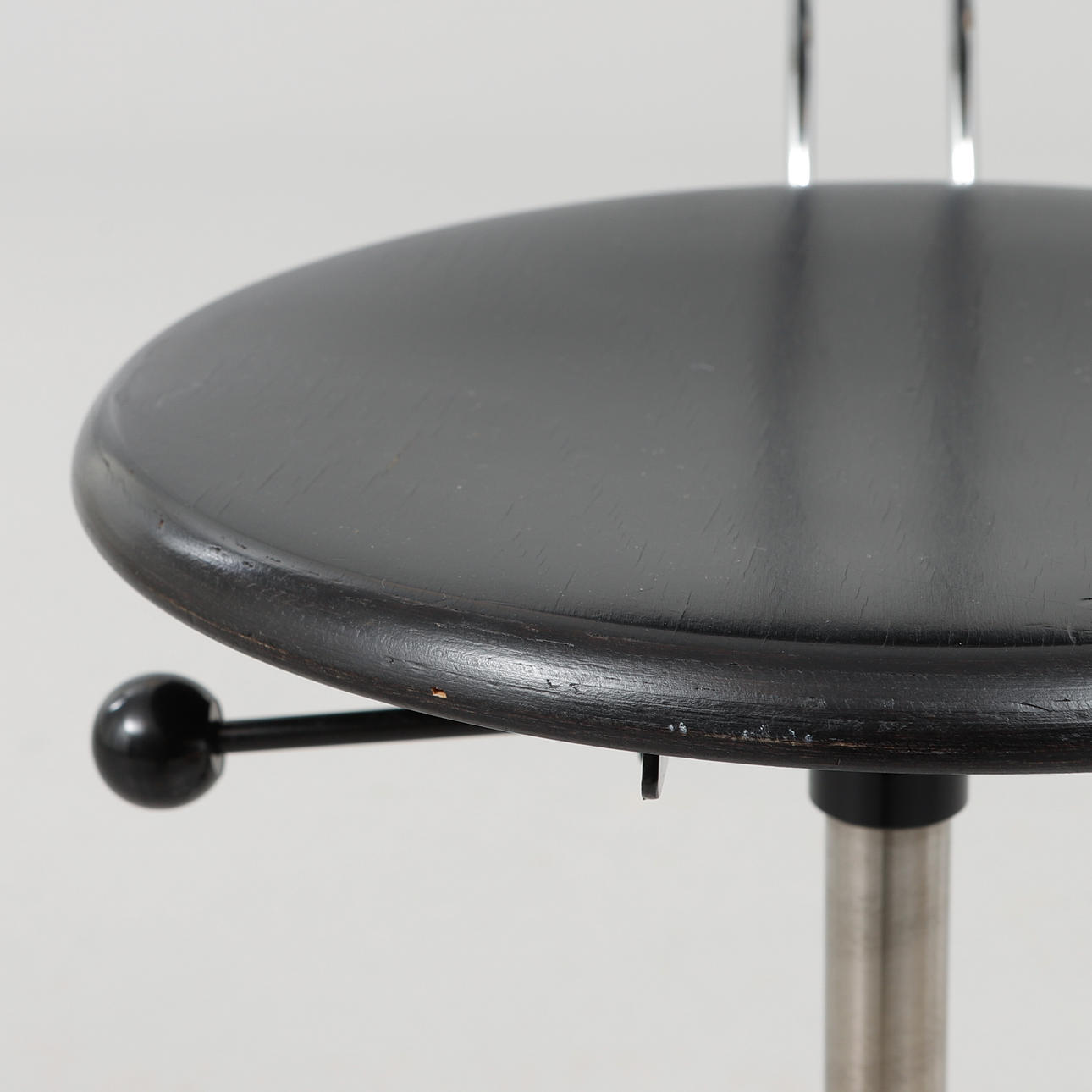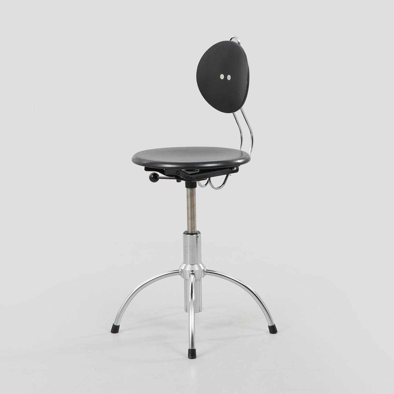 Forkromet stålramme, sort lakeret træ i ryg og sæde. Drej, hæv og sænk. Justerbar rygskive. Mærket. Sædehøjde ca. 45 - 57 cm.