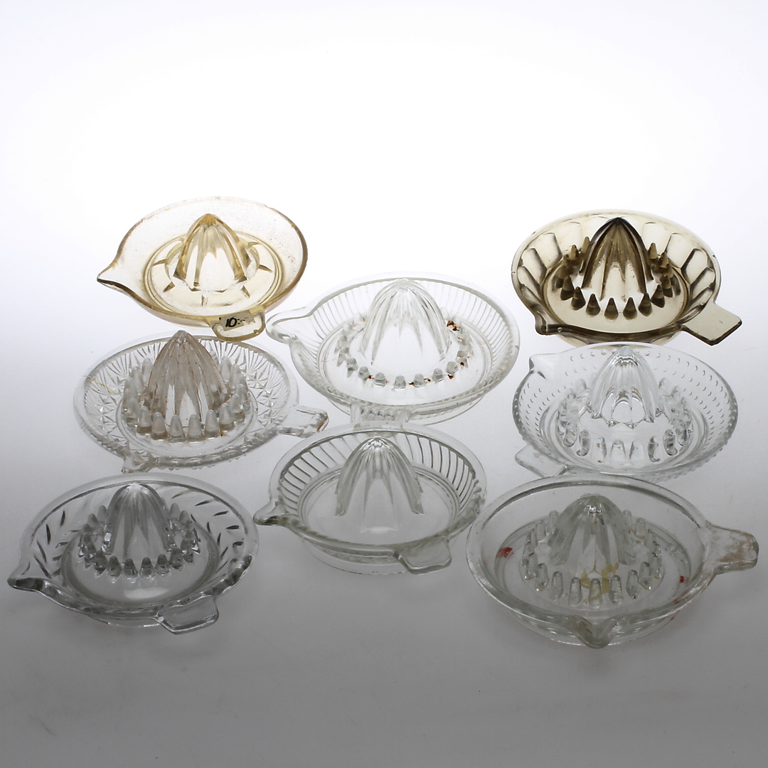 371444. SAMLING AF CITRUSPRESSER, ca 30 stk, glas, 1900-tallet.
