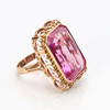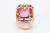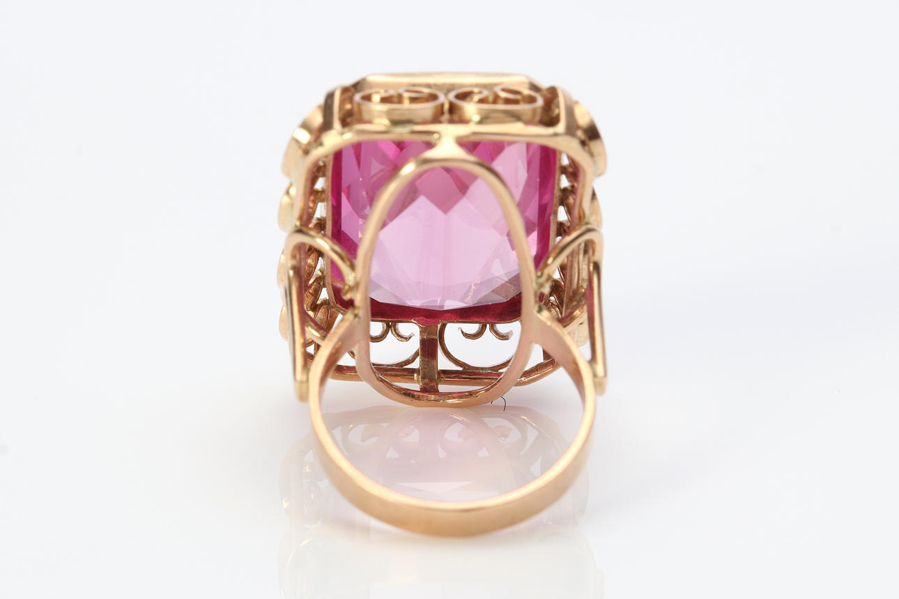 Guldring 14k med facetteret lyserød syntetisk safir ca. 23 x 17 mm, str. ca. 17 mm, totalvægt 15,0 g.