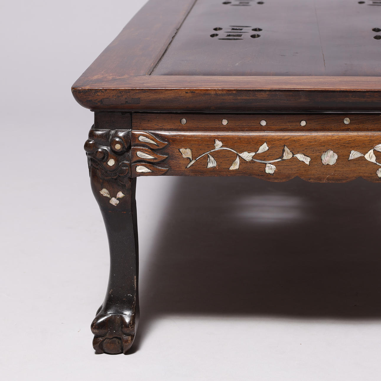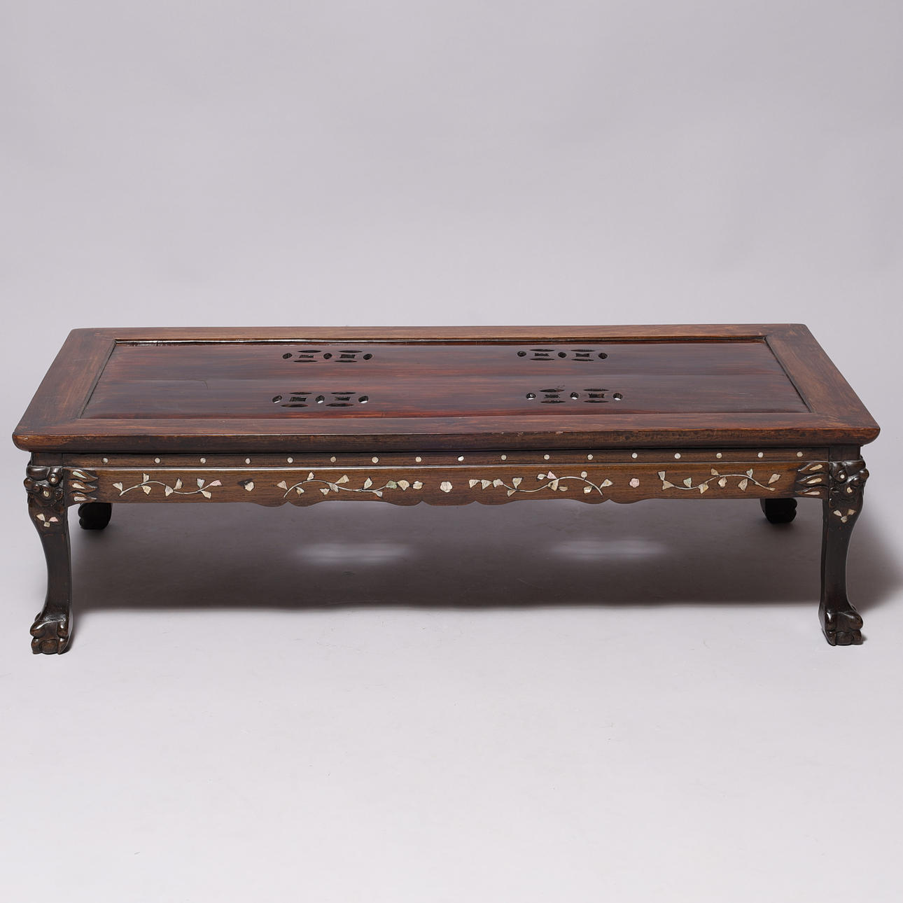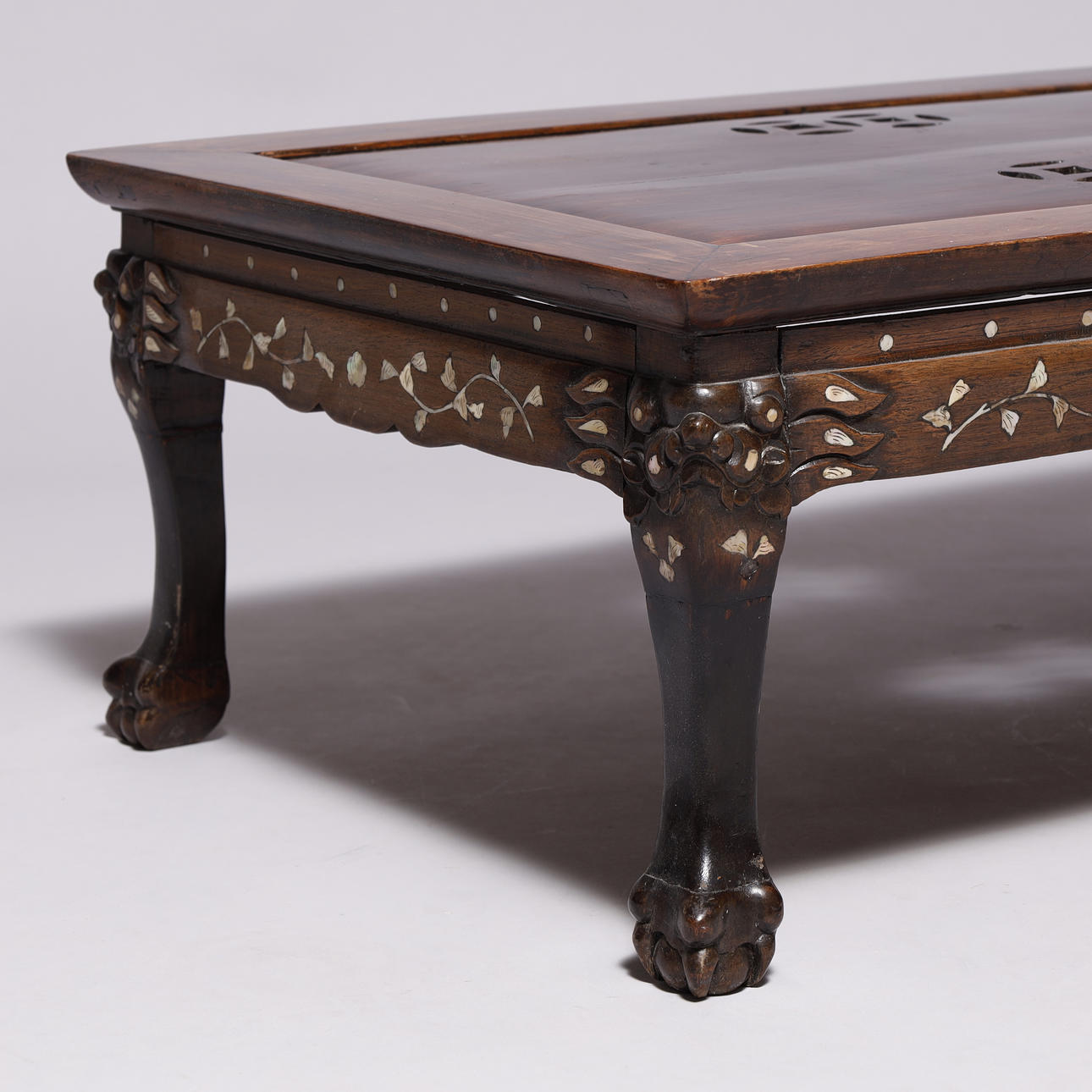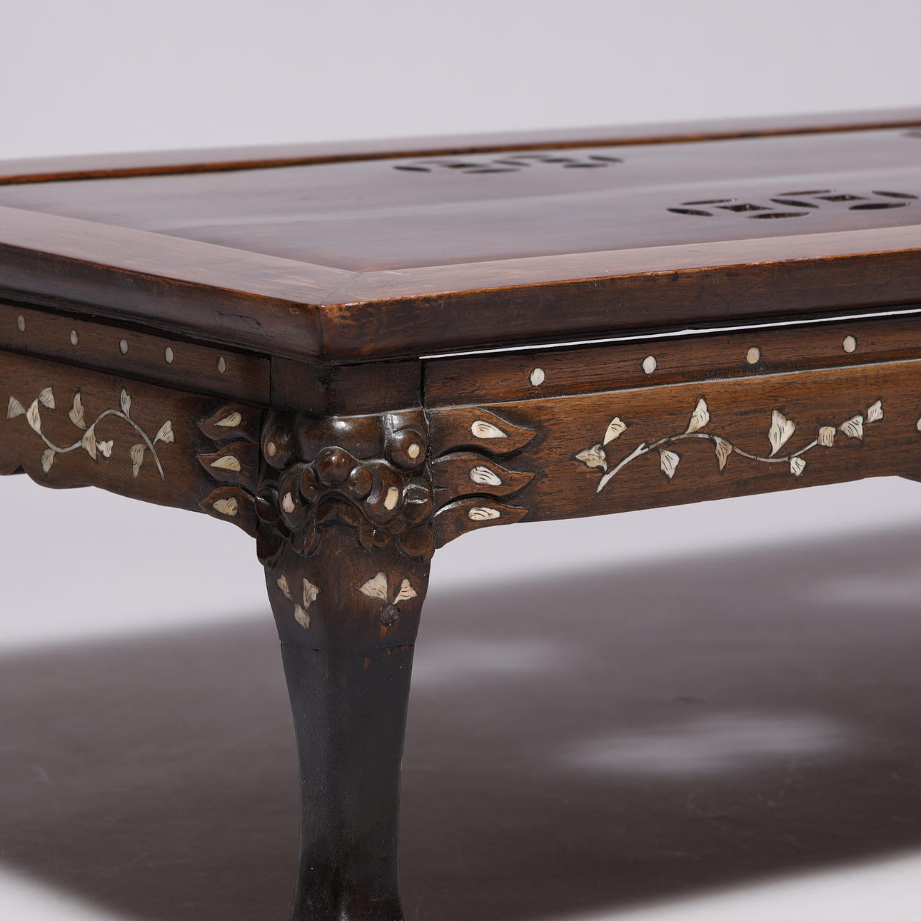 Kinesisk sofabord af orientalsk hårdt træ, med indlægninger af perlemor og udskæringer.
