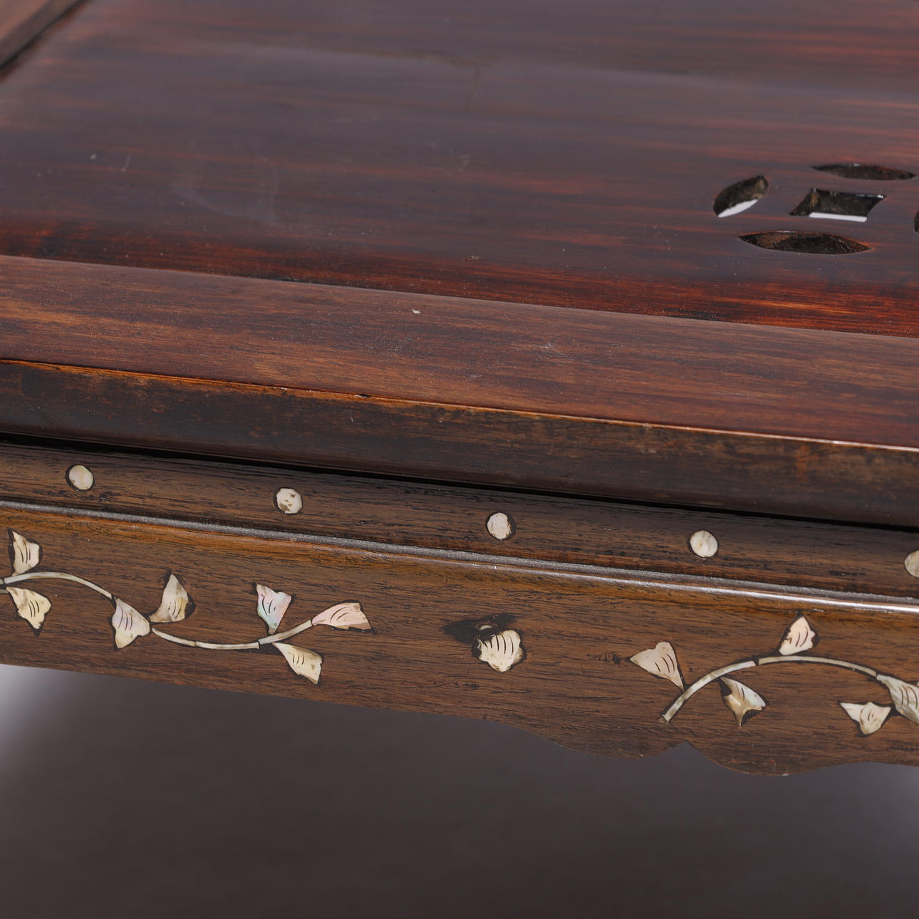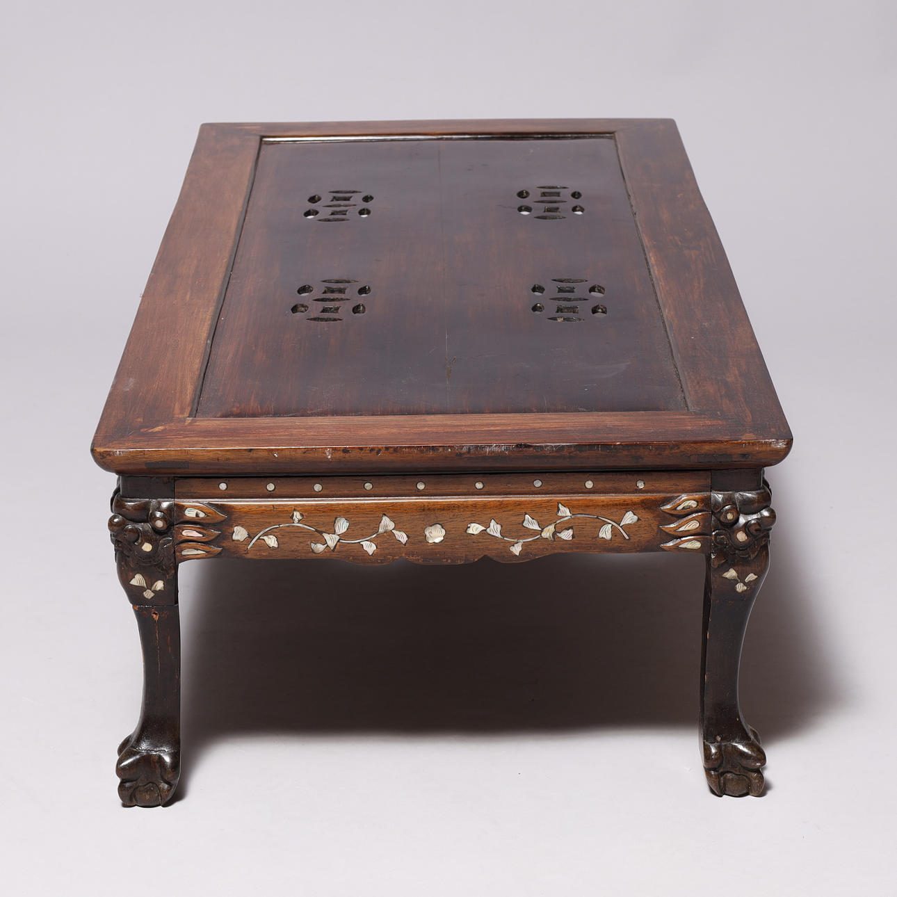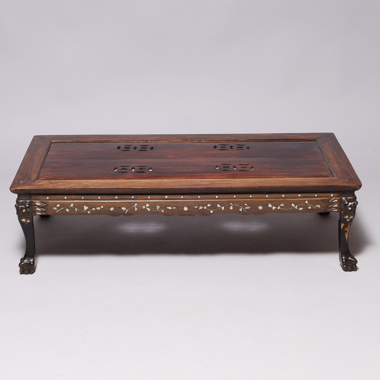 Kinesisk sofabord af orientalsk hårdt træ, med indlægninger af perlemor og udskæringer.