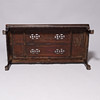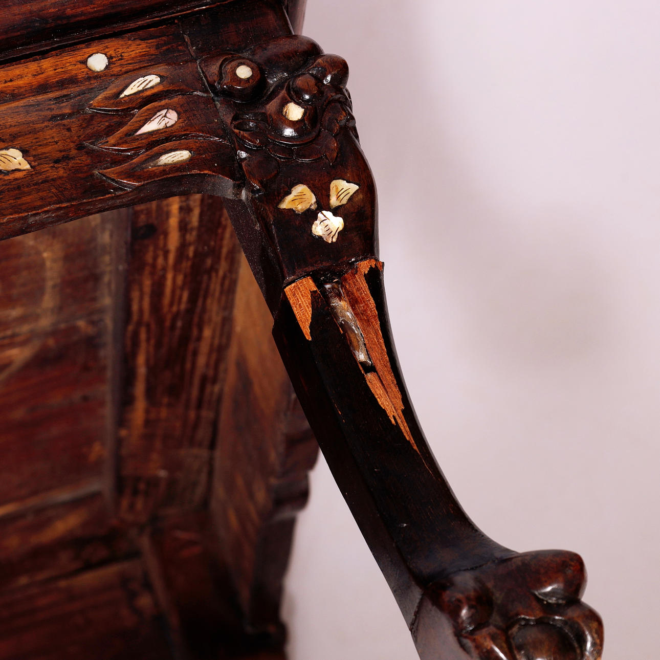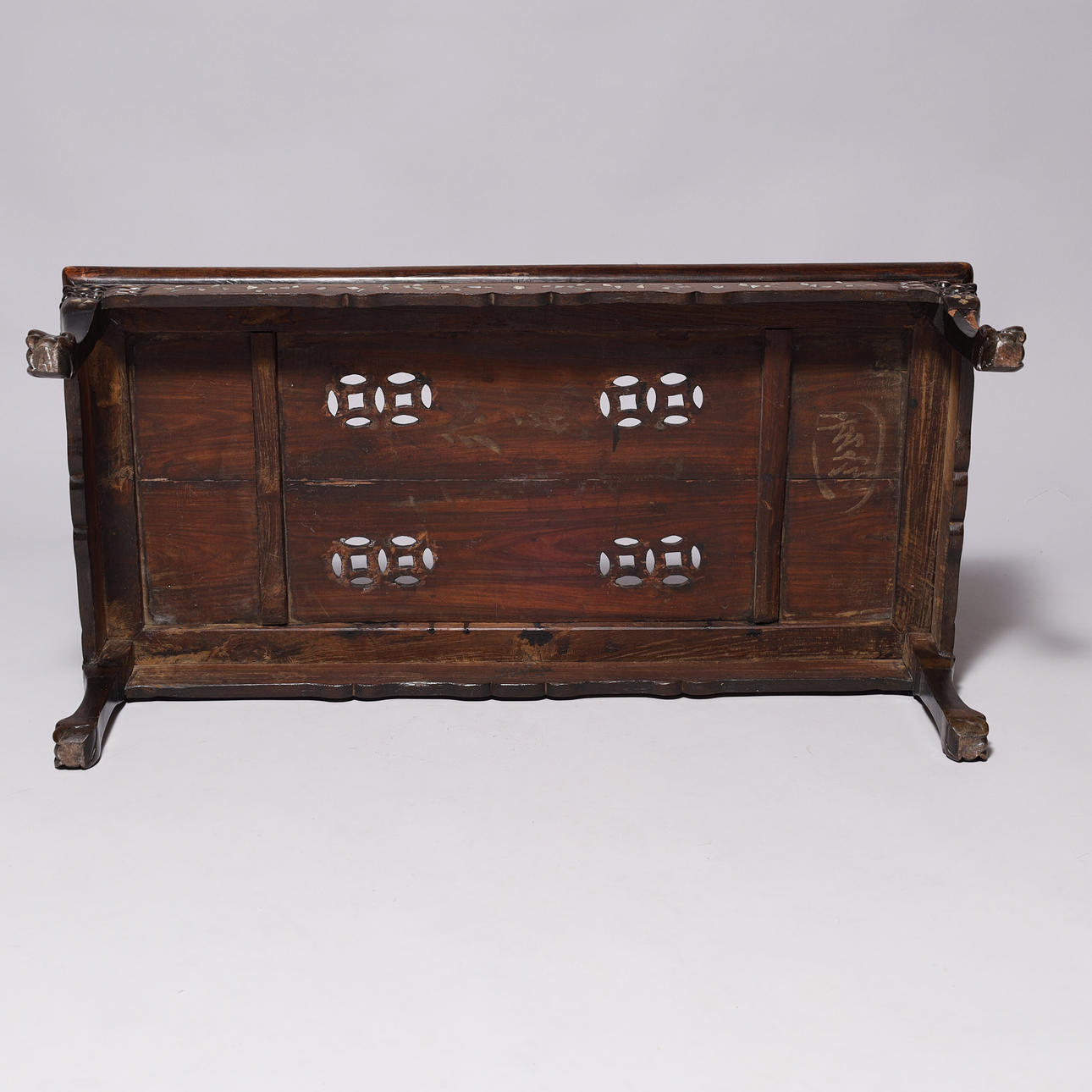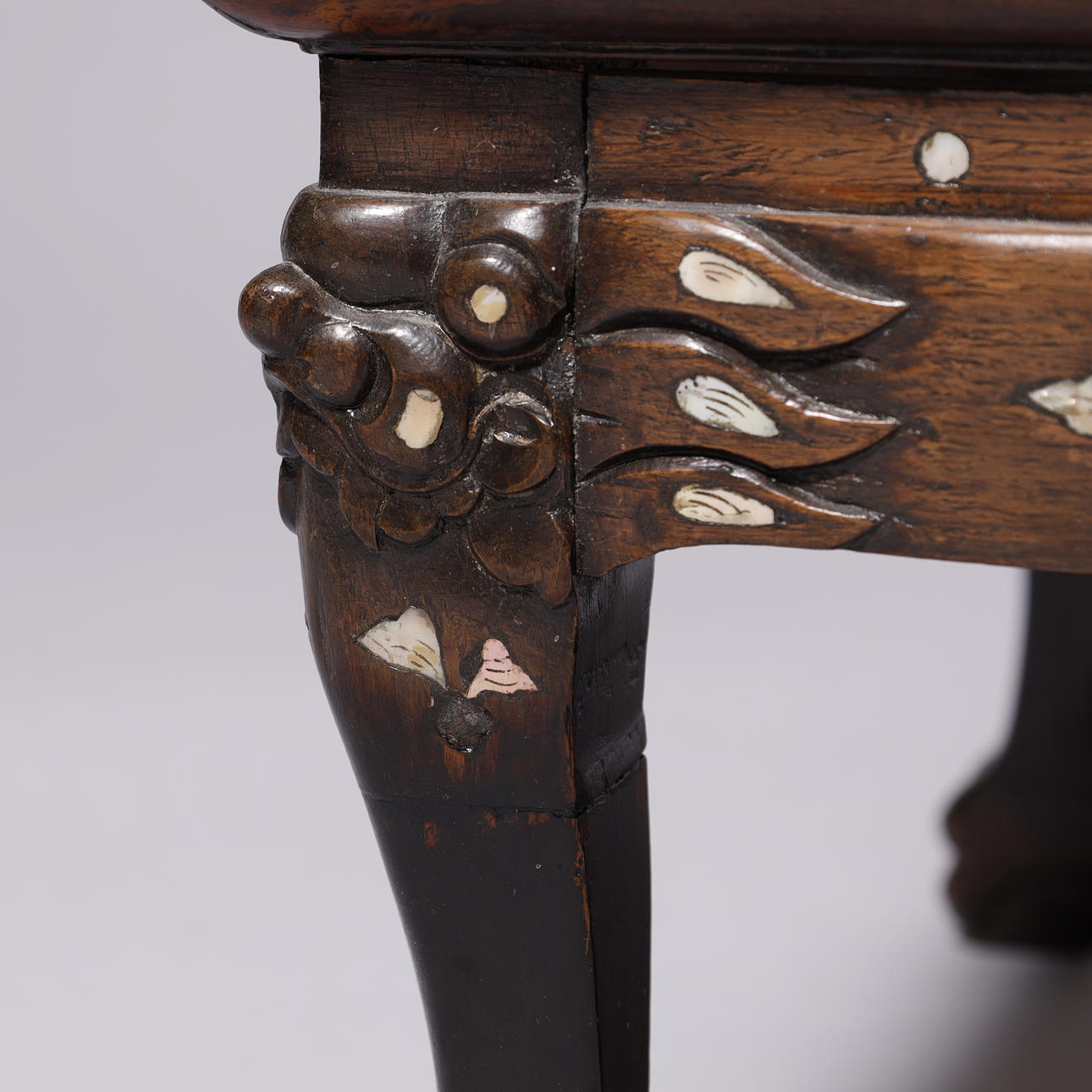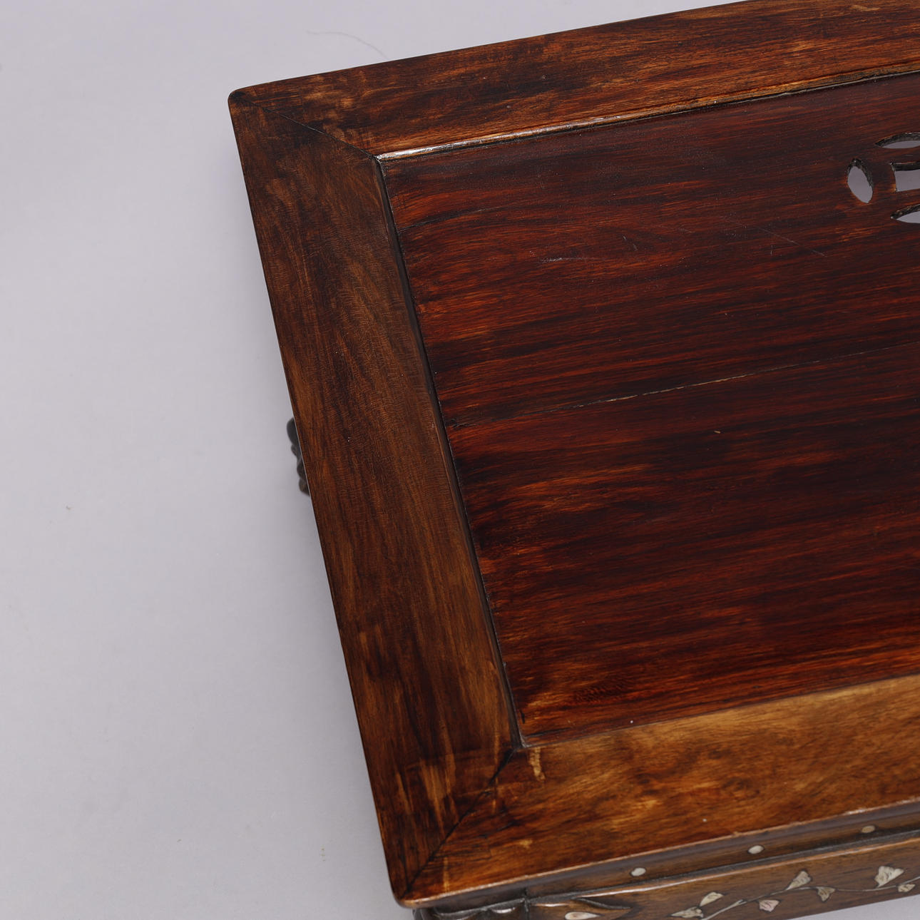 Kinesisk sofabord af orientalsk hårdt træ, med indlægninger af perlemor og udskæringer.