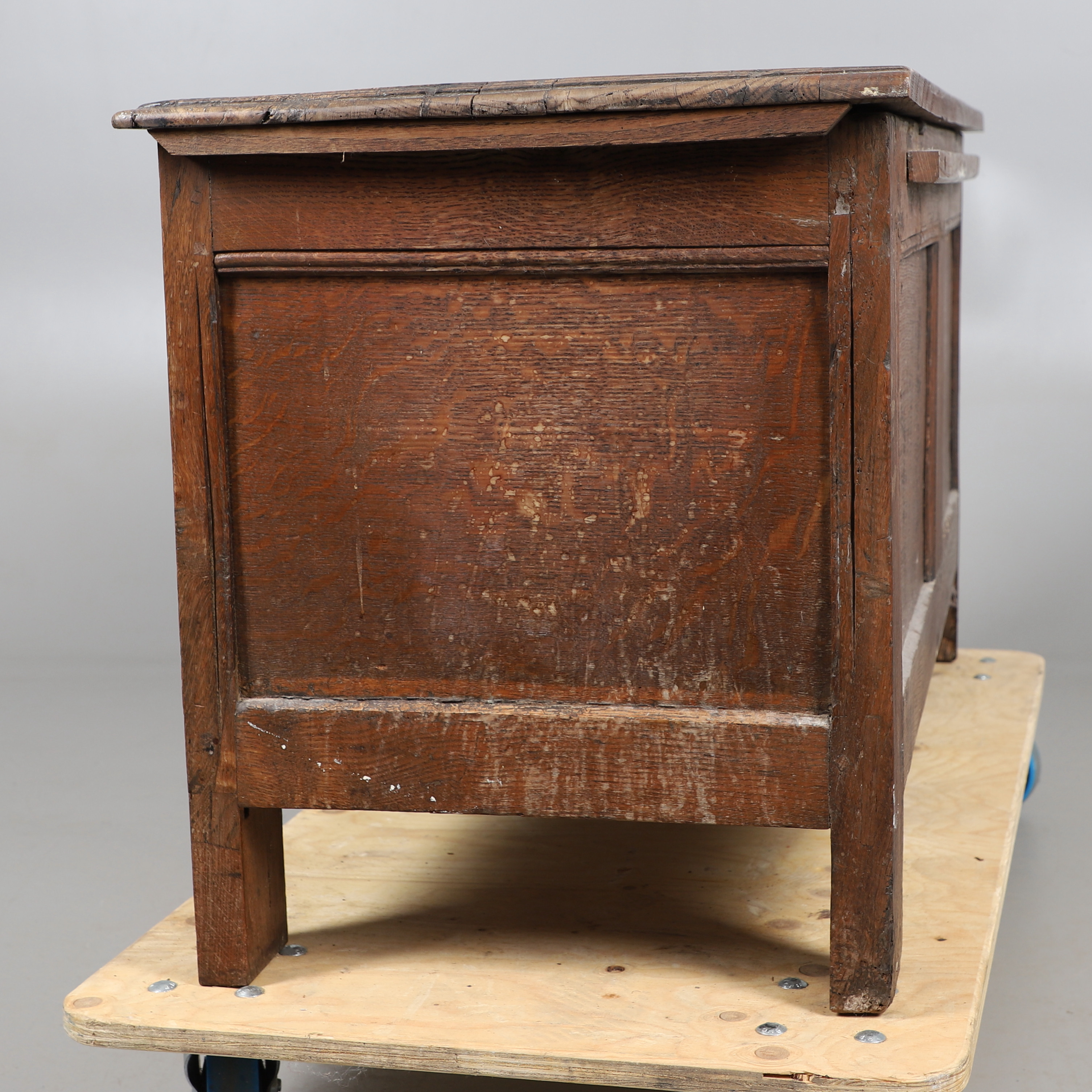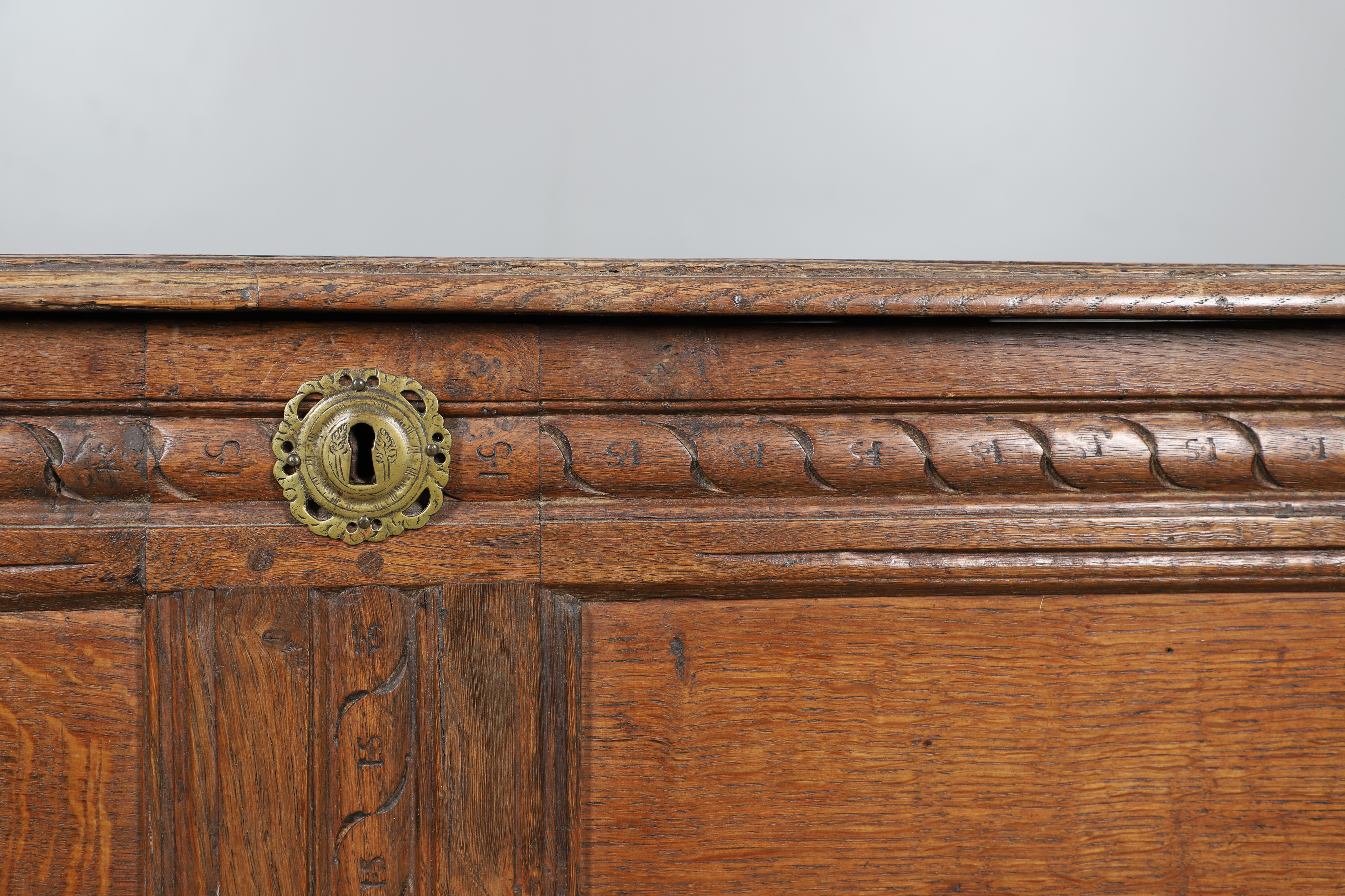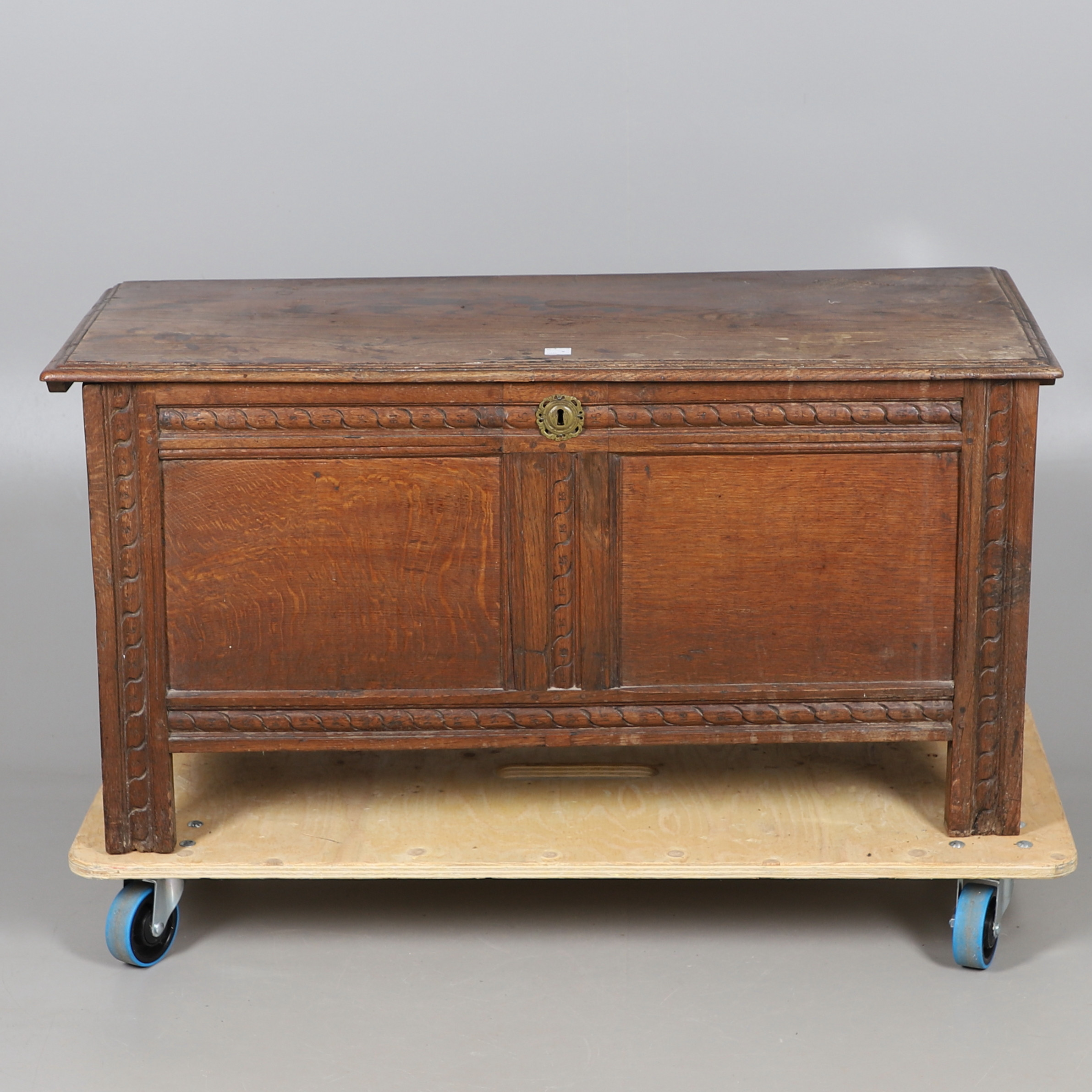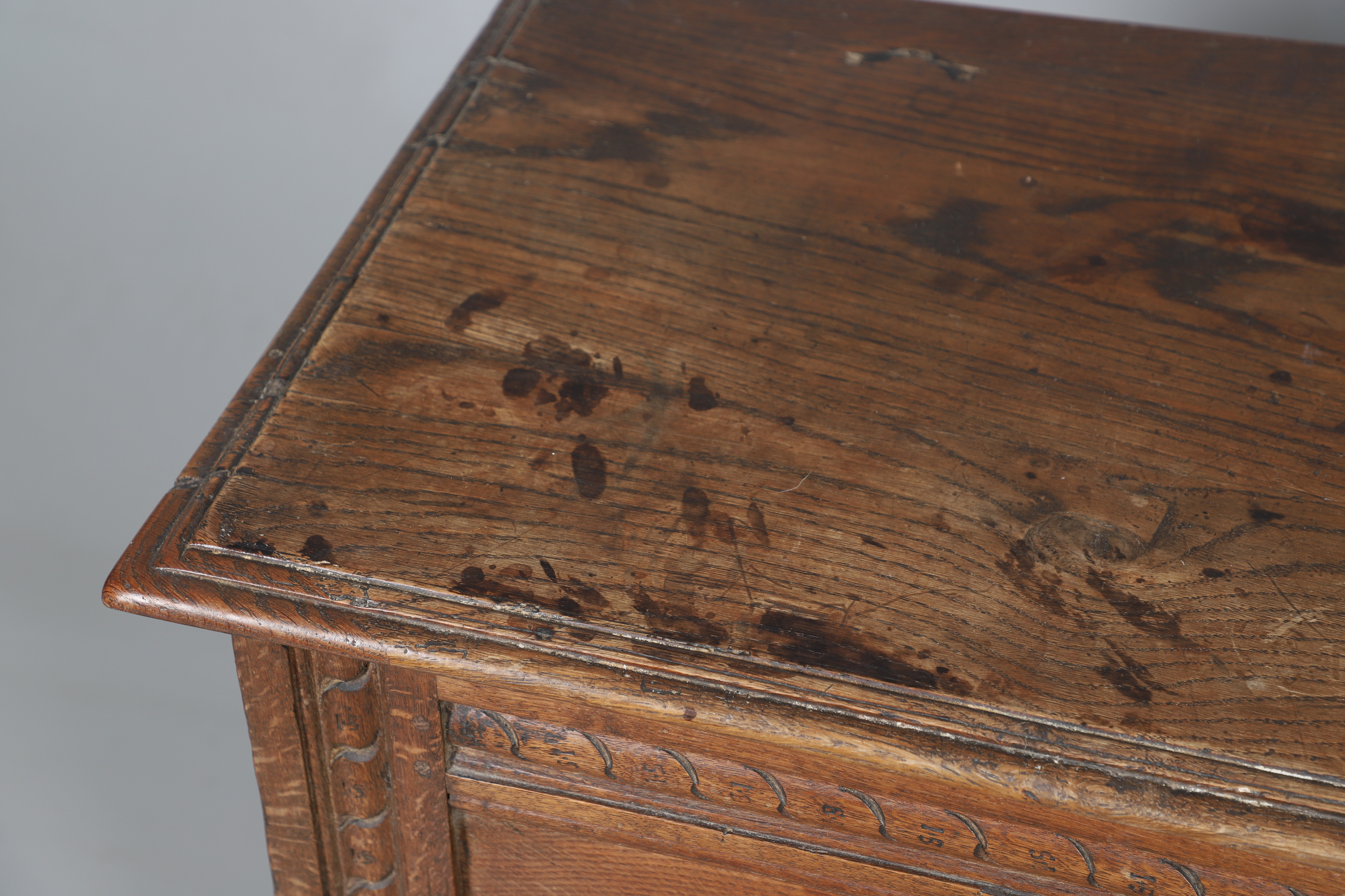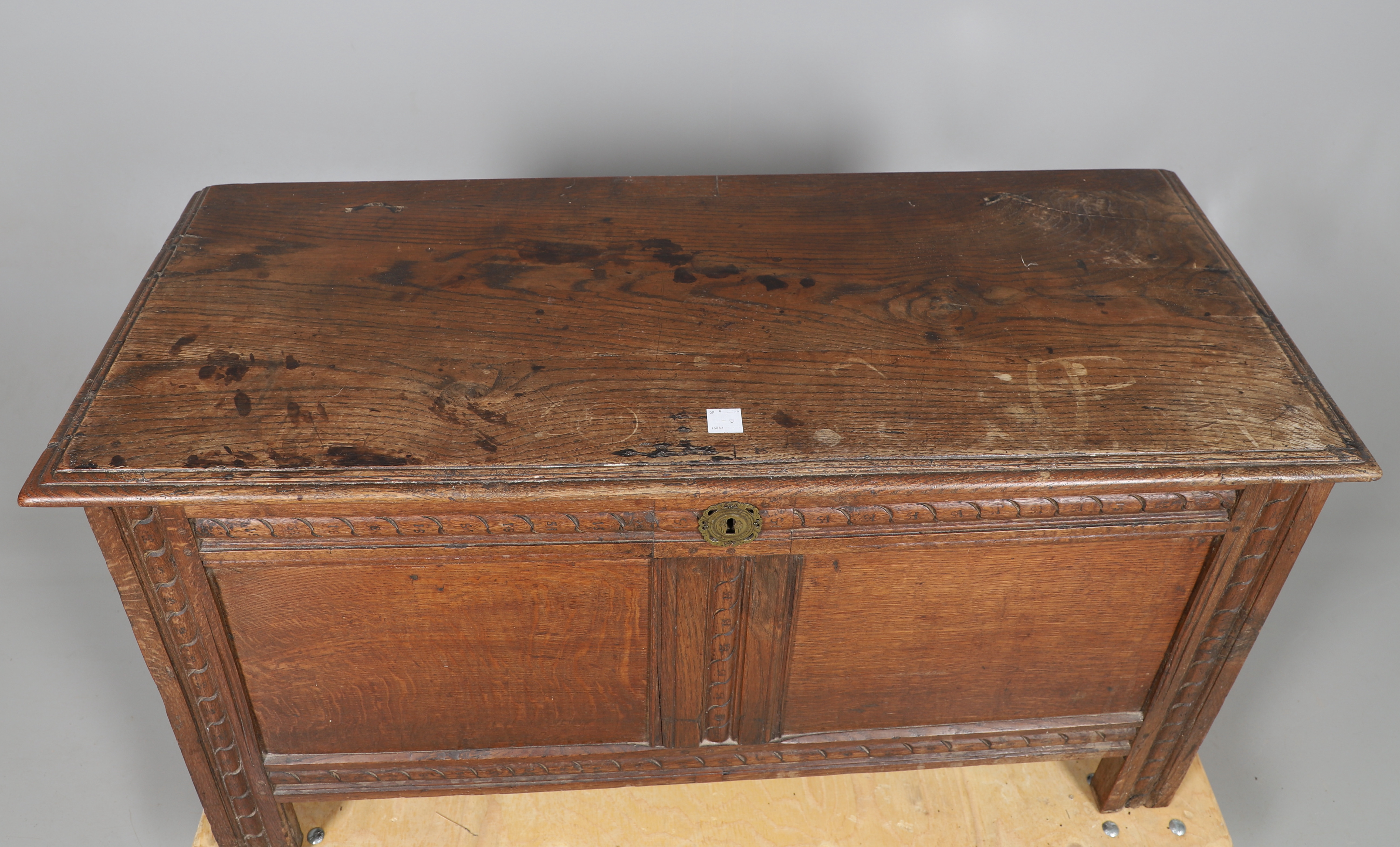 3737079. ANTIK EGETRÆSKASSE - UDSKÅRNE INITIALER.